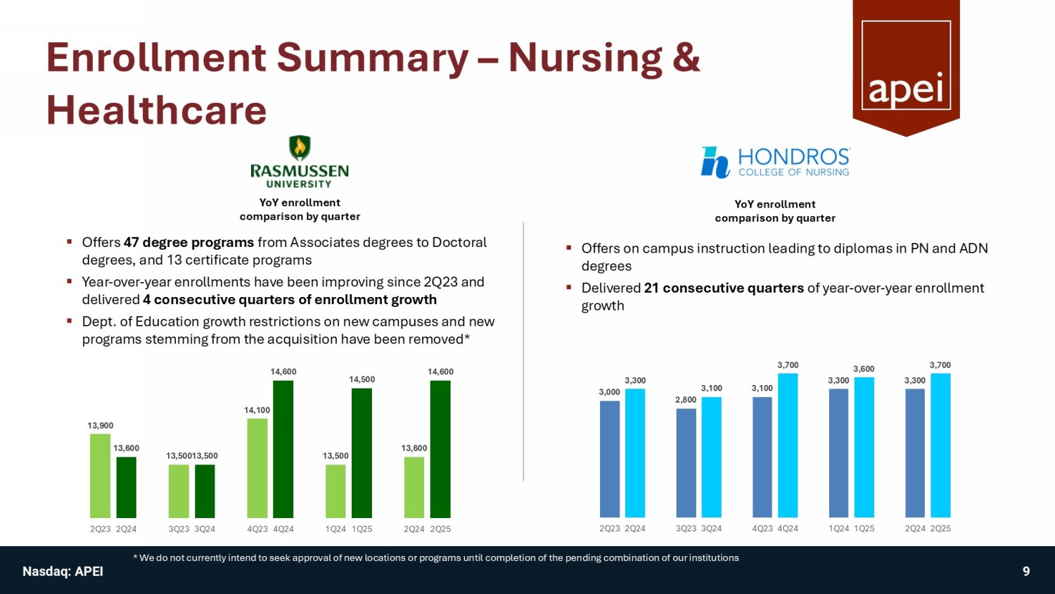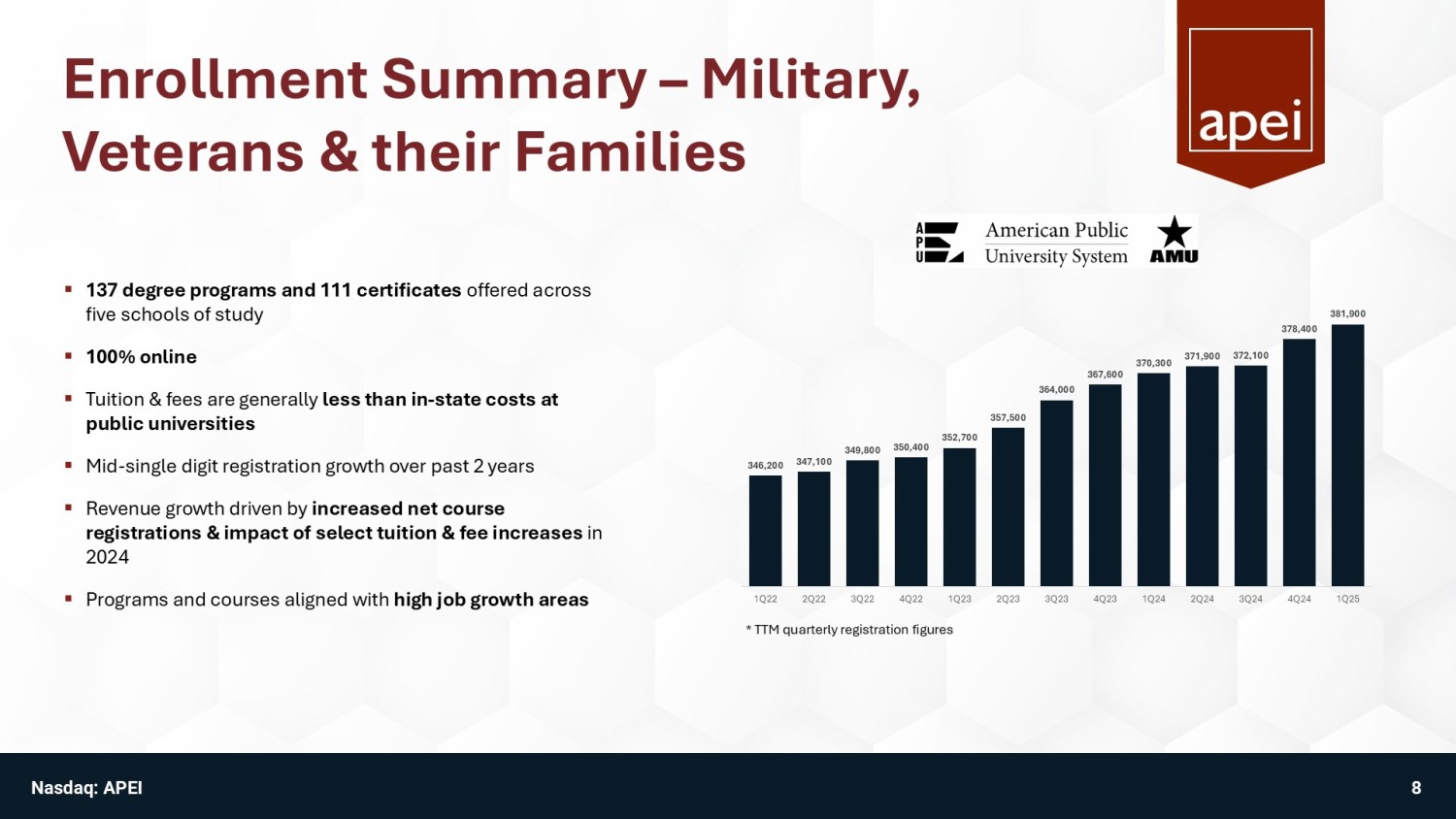 RAS has delivered total enrollment growth for 4 consecutive quarters HCN delivered double digit enrollment growth 3,700 2Q25 Enrollment 7 Nasdaq: APEI Enrollment Summary – Military, Veterans & their Families * TTM quarterly registration figures 346,200 347,100 349,800 350,400 352,700 357,500 364,000 367,600 370,300 371,900 372,100 378,400 381,900 1Q22 2Q22 3Q22 4Q22 1Q23 2Q23 3Q23 4Q23 1Q24 2Q24 3Q24 4Q24 1Q25 ▪ 137 degree programs and 111 certificates offered across five schools of study ▪ 100% online ▪ Tuition & fees are generally less than in - state costs at public universities ▪ Mid - single digit registration growth over past 2 years ▪ Revenue growth driven by increased net course registrations & impact of select tuition & fee increases in 2024 ▪ Programs and courses aligned with high job growth areas 8 Nasdaq: APEI 13,900 13,600 13,500 13,500 14,100 14,600 13,500 14,500 13,600 14,600 2Q23 2Q24 3Q23 3Q24 4Q23 4Q24 1Q24 1Q25 2Q24 2Q25 ▪ Offers 47 degree programs from Associates degrees to Doctoral degrees, and 13 certificate programs ▪ Year - over - year enrollments have been improving since 2Q23 and delivered 4 consecutive quarters of enrollment growth ▪ Dept.