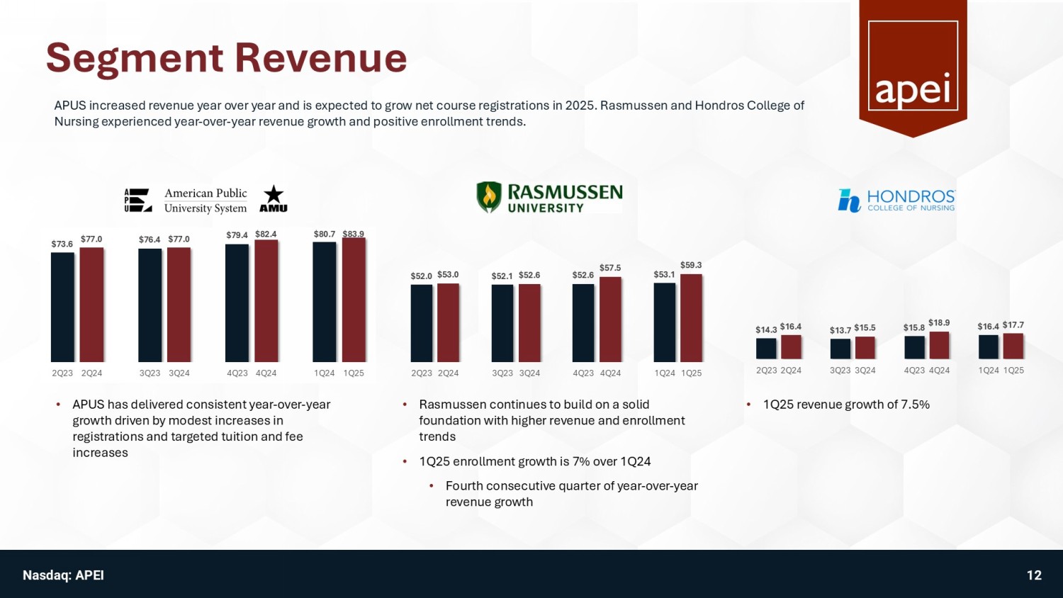 EBITDA 1 $7.5 M Net Income available to common stockholders $187.5 M Cash (as of 3/31/25) 1. Adjusted EBITDA (earnings before interest, taxes, depreciation, and amortization, less non - recurring expenses, such as severanc e, and non - cash expenses, such as stock compensation) and EBITDA are non - GAAP financial measures. Please refer to Appendix for GAAP to non - GAAP reconciliation. $0.41 Diluted EPS ▪ 1Q25 results above guidance include: ▪ Revenue of $164.6 million ▪ Net Income available to common stockholders of $7.5M vs ($1.0M) in 1Q24 ▪ Adjusted EBITDA 1 of $21.2 million vs $17.1M in 1Q24 ▪ Cash position increased $28.6 million from year end 2024 1Q25 Business Highlights APEI is a market leader in the post - secondary education of active - duty military, veterans, new nurses, and health professionals, segments that have demonstrated stable and long - term demand. 1Q 2025 Financial Highlights +7% YoY +25% YoY +22% YoY ▪ APUS increased net course registrations by 3.5% vs 1Q24 ▪ Rasmussen increased enrollment by 7% in 1Q25 ▪ Fourth consecutive quarter of YoY enrollment growth ▪ 1Q25 EBITDA of $2.1 million vs Q124 of ($5.7M) ▪ Hondros College of Nursing (HCN) increased enrollment 9.6% enrollment vs 1Q24 ($1.0 M) in 1Q24 ($0.06) in 1Q24 11 Segment Revenue • APUS has delivered consistent year - over - year growth driven by modest increases in registrations and targeted tuition and fee increases • Rasmussen continues to build on a solid foundation with higher revenue and enrollment trends • 1Q25 enrollment growth is 7% over 1Q24 • Fourth consecutive quarter of year - over - year revenue growth • 1Q25 revenue growth of 7.5% APUS increased revenue year over year and is expected to grow net course registrations in 2025.