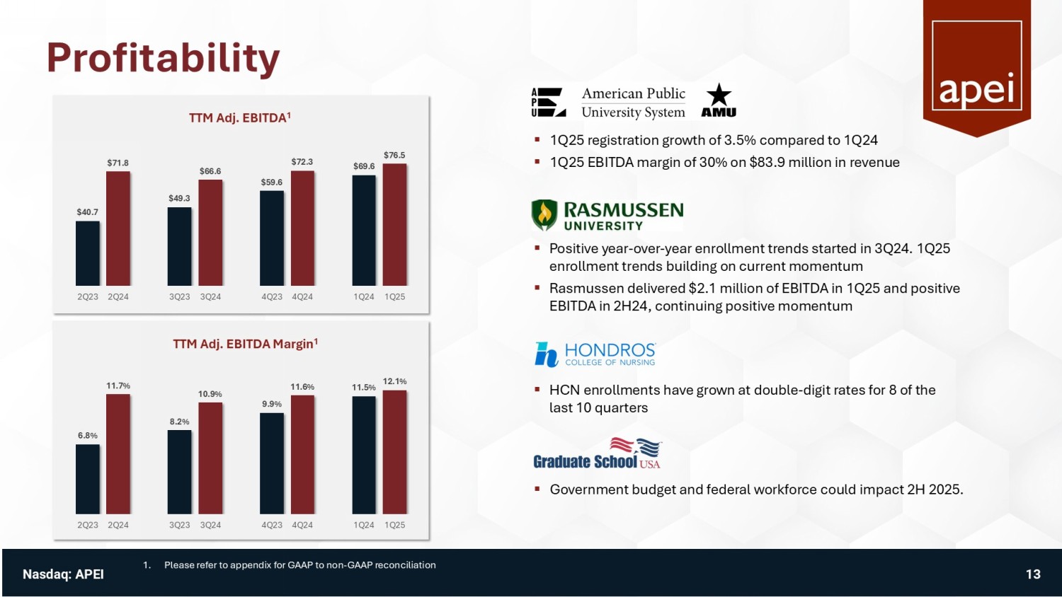 Rasmussen and Hondros College of Nursing experienced year - over - year revenue growth and positive enrollment trends. $73.6 $77.0 $76.4 $77.0 $79.4 $82.4 $80.7 $83.9 2Q23 2Q24 3Q23 3Q24 4Q23 4Q24 1Q24 1Q25 $52.0 $53.0 $52.1 $52.6 $52.6 $57.5 $53.1 $59.3 2Q23 2Q24 3Q23 3Q24 4Q23 4Q24 1Q24 1Q25 $14.3 $16.4 $13.7 $15.5 $15.8 $18.9 $16.4 $17.7 2Q23 2Q24 3Q23 3Q24 4Q23 4Q24 1Q24 1Q25 12 Nasdaq: APEI Profitability ▪ 1Q25 registration growth of 3.5% compared to 1Q24 ▪ 1Q25 EBITDA margin of 30% on $83.9 million in revenue TTM Adj.