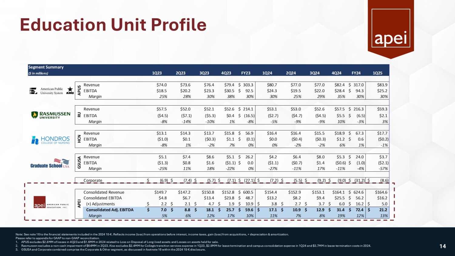 Please refer to appendix for GAAP to non - GAAP reconciliation $40.7 $71.8 $49.3 $66.6 $59.6 $72.3 $69.6 $76.5 2Q23 2Q24 3Q23 3Q24 4Q23 4Q24 1Q24 1Q25 6.8% 11.7% 8.2% 10.9% 9.9% 11.6% 11.5% 12.1% 2Q23 2Q24 3Q23 3Q24 4Q23 4Q24 1Q24 1Q25 13 Nasdaq: APEI Education Unit Profile Note: See note 16 to the financial statements included in the 2024 10 - K. Reflects income (loss) from operations before interest, income taxes, gain (loss) from acquisitions, + depreciation & amortization. Please refer to appendix for GAAP to non - GAAP reconciliation. 1. APUS excludes $2.8MM of losses in 4Q23 and $1.6MM in 2024 related to Loss on Disposal of Long - lived assets and Losses on assets held for sale. 2. Rasmussen excludes a non - cash impairment of $64MM in 2Q23. Also excludes $2.4MM for Collegis transition services expense in 1Q23, $2.9MM for lease termination and campus consolidation expense in 1Q24 and $3.7MM in leas e termination costs in 2024. 3. GSUSA and Corporate combined comprise the Corporate & Other segment, as discussed in footnote 16 within the 2024 10 - K disclosure . Segment Summary ($ in millions) 1Q23 2Q23 3Q23 4Q23 FY23 1Q24 2Q24 3Q24 4Q24 FY24 1Q25 Revenue $74.0 $73.6 $76.4 $79.4 303.3$ $80.7 $77.0 $77.0 $82.4 317.0$ $83.9 EBITDA $18.5 $20.2 $23.3 $30.5 92.5$ $24.3 $19.5 $22.0 $28.4 94.3$ $25.2 Margin 25% 28% 30% 38% 30% 30% 25% 29% 35% 30% 30% Revenue $57.5 $52.0 $52.1 $52.6 214.1$ $53.1 $53.0 $52.6 $57.5 216.3$ $59.3 EBITDA ($4.5) ($7.1) ($5.3) $0.4 (16.5)$ ($2.7) ($4.7) ($4.5) $5.5 (6.5)$ $2.1 Margin -8% -14% -10% 1% -8% -5% -9% -9% 10% -3% 3% Revenue $13.1 $14.3 $13.7 $15.8 56.9$ $16.4 $16.4 $15.5 $18.9 67.3$ $17.7 EBITDA ($1.0) $0.1 ($0.3) $1.1 (0.1)$ $0.0 ($0.4) ($0.3) $1.2 0.6$ ($0.2) Margin -8% 1% -2% 7% 0% 0% -2% -2% 6% 1% -1% Revenue $5.1 $7.4 $8.6 $5.1 26.2$ $4.2 $6.4 $8.0 $5.3 24.0$ $3.7 EBITDA ($1.3) $0.8 $1.6 ($1.1) 0.0$ ($1.1) ($0.7) $1.4 ($0.6) (1.0)$ ($2.1) Margin -25% 11% 18% -22% 0% -27% -11% 17% -11% -4% -57% Corporate (6.9)$ (7.4)$ (5.7)$ (7.1)$ (27.1)$ (7.2)$ (5.5)$ (9.2)$ (9.0)$ (31.2)$ (8.6)$ Consolidated Revenue $149.7 $147.2 $150.8 $152.8 600.5$ $154.4 $152.9 $153.1 $164.1 624.6$ $164.6 Consolidated EBITDA $4.8 $6.7 $13.4 $23.8 48.7$ $13.2 $8.2 $9.4 $25.5 56.2$ $16.2 (+) Adjustments 2.2$ 2.1$ 4.7$ 1.9$ 10.9$ 3.8$ 2.7$ 3.7$ 6.0$ 16.2$ 5.0$ Consolidated Adj.