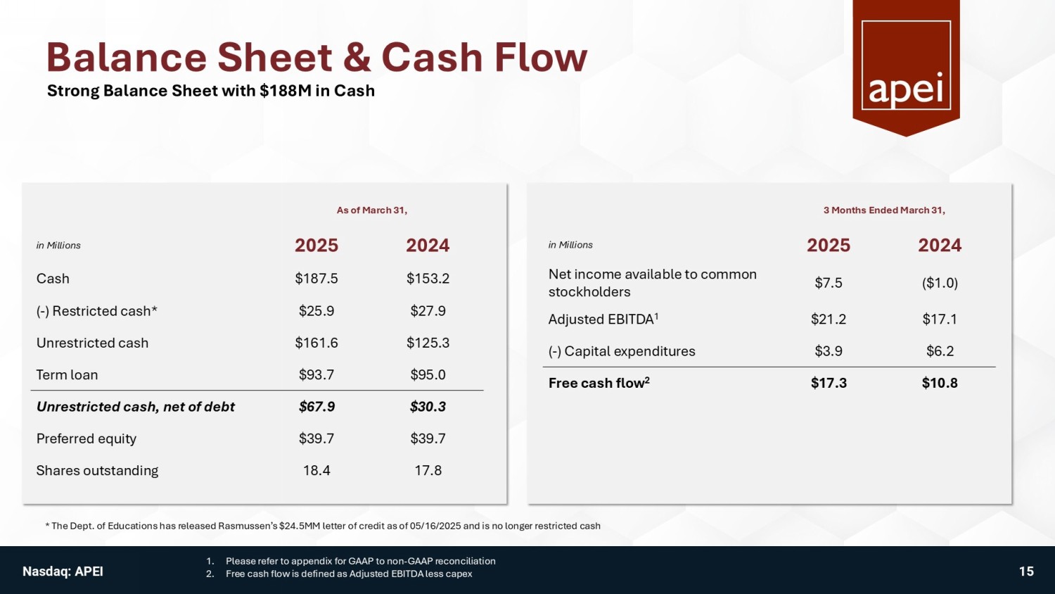 EBITDA 7.0$ 8.8$ 18.1$ 25.7$ 59.6$ 17.1$ 10.9$ 12.9$ 31.4$ 72.4$ 21.2$ Margin 5% 6% 12% 17% 10% 11% 7% 8% 19% 12% 13% APEI APUS RU HCN GSUSA 14 Balance Sheet & Cash Flow 3 Months Ended March 31, 2024 2025 in Millions ($1.0) $7.5 Net income available to common stockholders $17.1 $21.2 Adjusted EBITDA 1 $6.2 $3.9 ( - ) Capital expenditures $10.8 $17.3 Free cash flow 2 As of March 31, 2024 2025 in Millions $153.2 $187.5 Cash $27.9 $25.9 ( - ) Restricted cash* $125.3 $161.6 Unrestricted cash $95.0 $93.7 Term loan $30.3 $67.9 Unrestricted cash, net of debt $39.7 $39.7 Preferred equity 17.8 18.4 Shares outstanding Strong Balance Sheet with $188M in Cash 1. Please refer to appendix for GAAP to non - GAAP reconciliation 2. Free cash flow is defined as Adjusted EBITDA less capex 15 * The Dept.