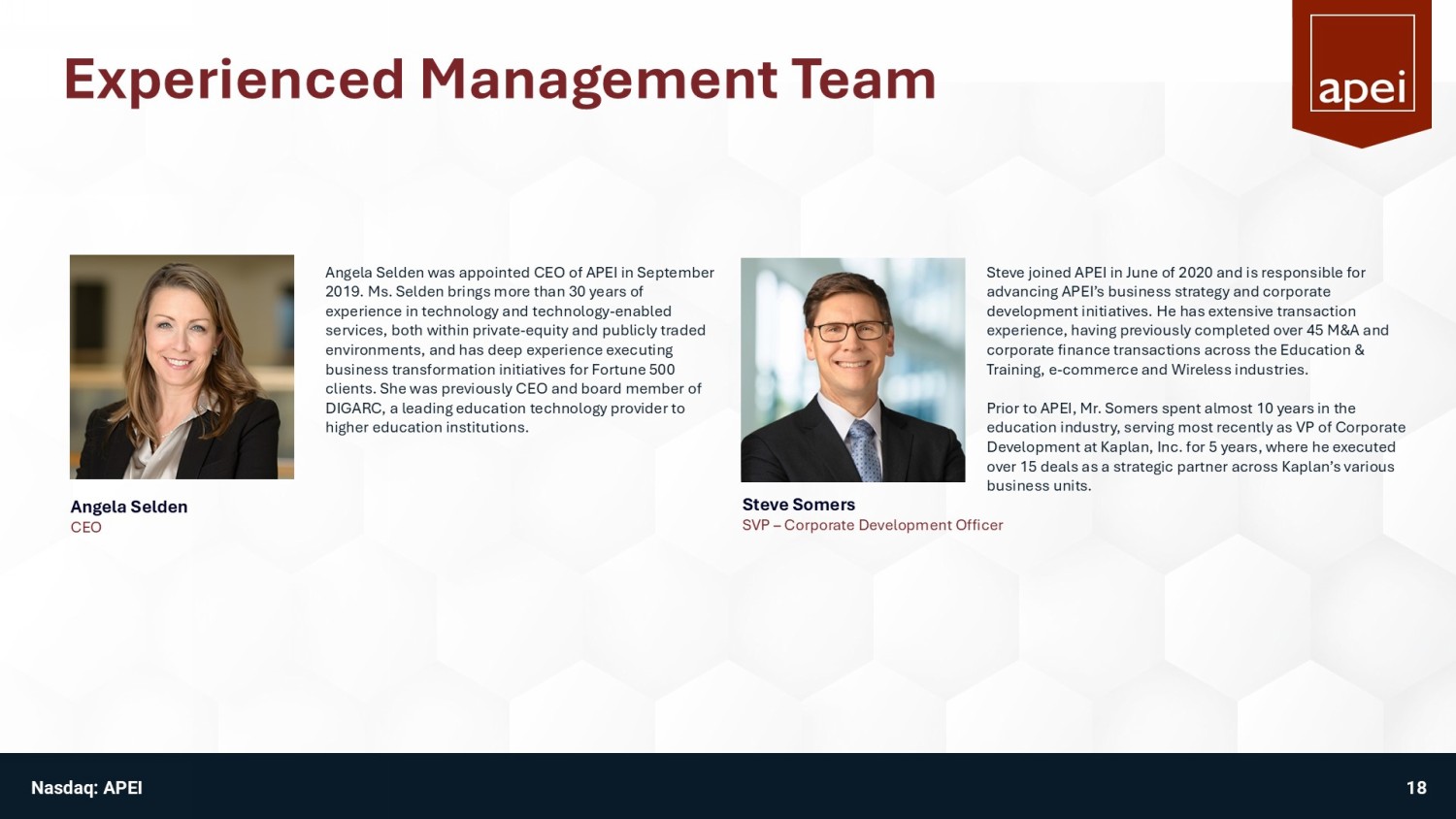 of Educations has released Rasmussen’s $24.5MM letter of credit as of 05/16/2025 and is no longer restricted cash Nasdaq: APEI 1. According to the Georgetown University Center on Education and the Workforce (2022) 2. Free cash flow defined as Adjusted EBITDA less Capital Expenditures INVESTMENT HIGHLIGHTS Large Addressable Market Online education expected to increase to >$100 billion in 5 years Solid ROI for Education & Stable Long - Term Demand APUS in top 11% for student return on educational investment 1 Demand for nurses estimated to be 200,000+ per year Improving Performance and Operating Leverage Solid growth, margins and cash flow performance at APUS Rasmussen delivering positive enrollment and leveraging its higher fixed cost base Simplifying Business Operations Consolidating three separate institutions into one university system Plan to redeem preferred equity Reduction or elimination of assets, campus leases and corporate buildings Strong Cash Flow Free cash flow 2 of $51 million in 2024 17 Experienced Management Team Angela Selden CEO Steve Somers SVP – Corporate Development Officer Angela Selden was appointed CEO of APEI in September 2019.