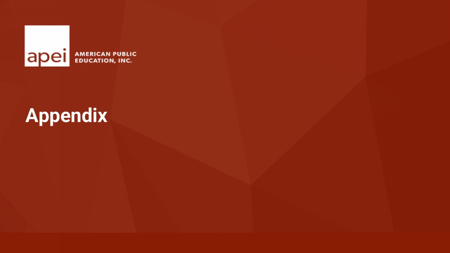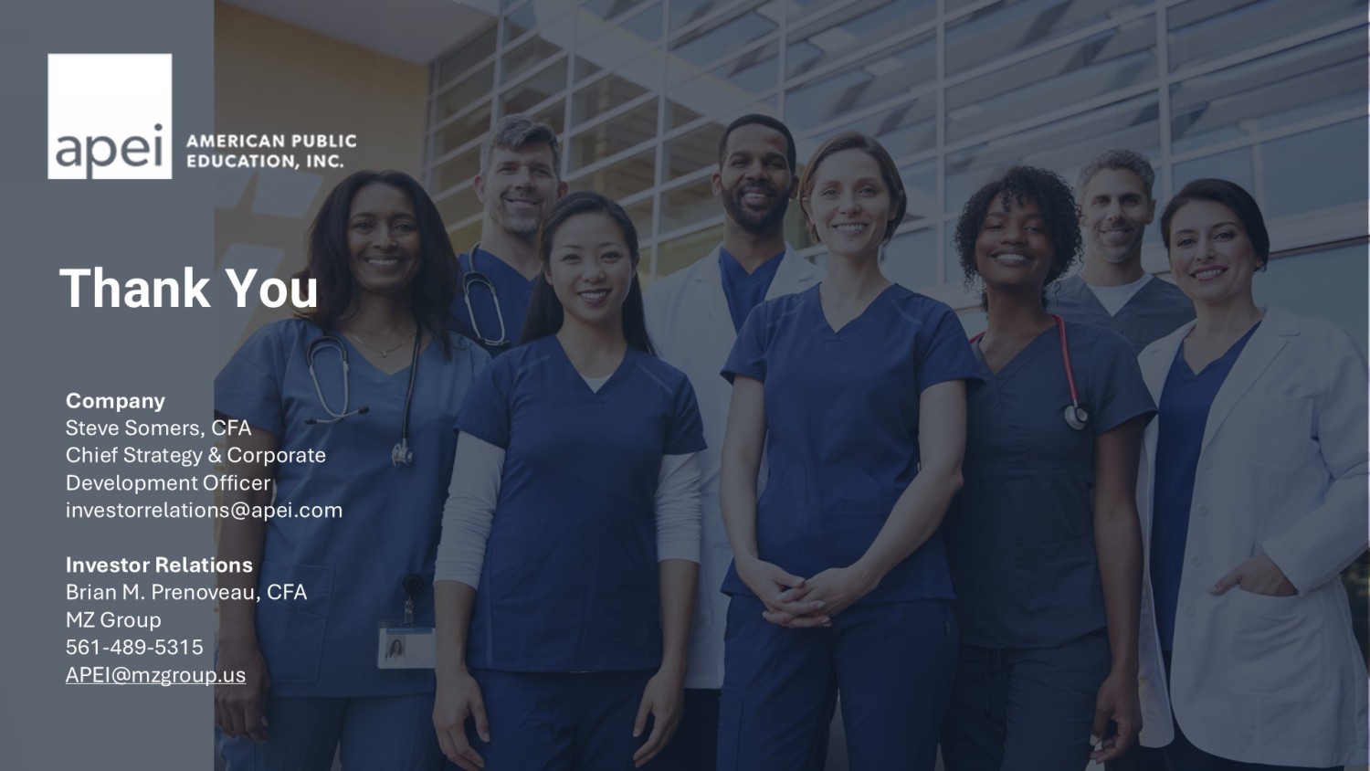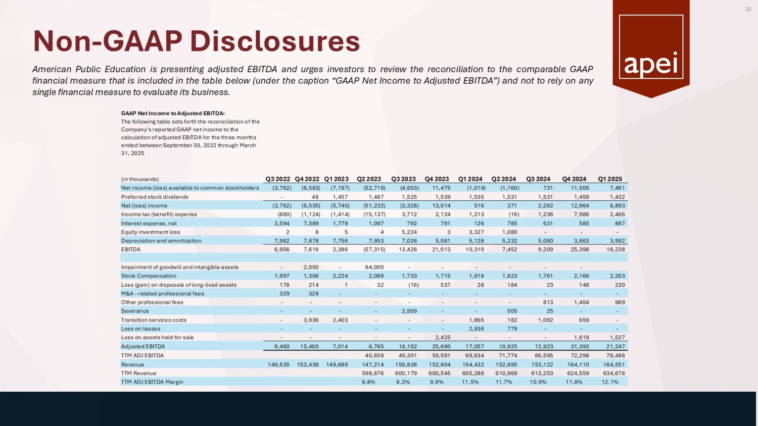 Nasdaq: APEI 18 Non - GAAP Disclosures American Public Education is presenting adjusted EBITDA and urges investors to review the reconciliation to the comparable GAAP financial measure that is included in the table below (under the caption “GAAP Net Income to Adjusted EBITDA”) and not to rely on any single financial measure to evaluate its business . 20 GAAP Net Income to Adjusted EBITDA: The following table sets forth the reconciliation of the Company’s reported GAAP net income to the calculation of adjusted EBITDA for the three months ended between September 30, 2022 through March 31, 2025 (in thousands) Q3 2022 Q4 2022 Q1 2023 Q2 2023 Q3 2023 Q4 2023 Q1 2024 Q2 2024 Q3 2024 Q4 2024 Q1 2025 Net income (loss) available to common stockholders (3,762) (6,583) (7,197) (52,719) (4,853) 11,475 (1,019) (1,160) 731 11,505 7,461 Preferred stock dividends - 48 1,457 1,487 1,525 1,539 1,535 1,531 1,531 1,459 1,432 Net (loss) income (3,762) (6,535) (5,740) (51,232) (3,328) 13,014 516 371 2,262 12,964 8,893 Income tax (benefit) expense (860) (1,124) (1,414) (15,137) 3,712 2,124 1,213 (16) 1,236 7,986 2,466 Interest expense, net 3,594 7,389 1,779 1,097 792 791 126 785 631 585 887 Equity investment loss 2 8 5 4 5,224 3 3,327 1,080 - - - Depreciation and amortization 7,982 7,878 7,756 7,953 7,026 5,081 5,128 5,232 5,080 3,863 3,992 EBITDA 6,956 7,616 2,386 (57,315) 13,426 21,013 10,310 7,452 9,209 25,398 16,238 Impairment of goodwill and intangible assets - 2,000 - 64,000 - - - - - - Stock Compensation 1,997 1,306 2,224 2,068 1,733 1,715 1,918 1,823 1,761 2,166 2,263 Loss (gain) on disposals of long-lived assets 178 214 1 32 (16) 537 28 184 23 148 230 M&A - related professional fees 329 328 - - - - - - - - - Other professional fees - - - - - - - - 813 1,404 989 Severance - - - - 2,959 - - 505 25 - - Transition services costs - 3,936 2,403 - - - 1,865 182 1,092 659 - Loss on leases - - - - - - 2,936 779 - - - Loss on assets held for sale - - - - - 2,425 - - - 1,618 1,527 Adjusted EBITDA 9,460 15,400 7,014 8,785 18,102 25,690 17,057 10,925 12,923 31,393 21,247 TTM ADJ EBITDA 40,659 49,301 59,591 69,634 71,774 66,595 72,298 76,488 Revenue 149,535 152,438 149,689 147,214 150,838 152,804 154,432 152,895 153,122 164,110 164,551 TTM Revenue 598,876 600,179 600,545 605,288 610,969 613,253 624,559 634,678 TTM ADJ EBITDA Margin 6.8% 8.2% 9.9% 11.5% 11.7% 10.9% 11.6% 12.1% Thank You Company Steve Somers, CFA Chief Strategy & Corporate Development Officer investorrelations@apei.com Investor Relations Brian M. Prenoveau , CFA MZ Group 561 - 489 - 5315 APEI@mzgroup.us
