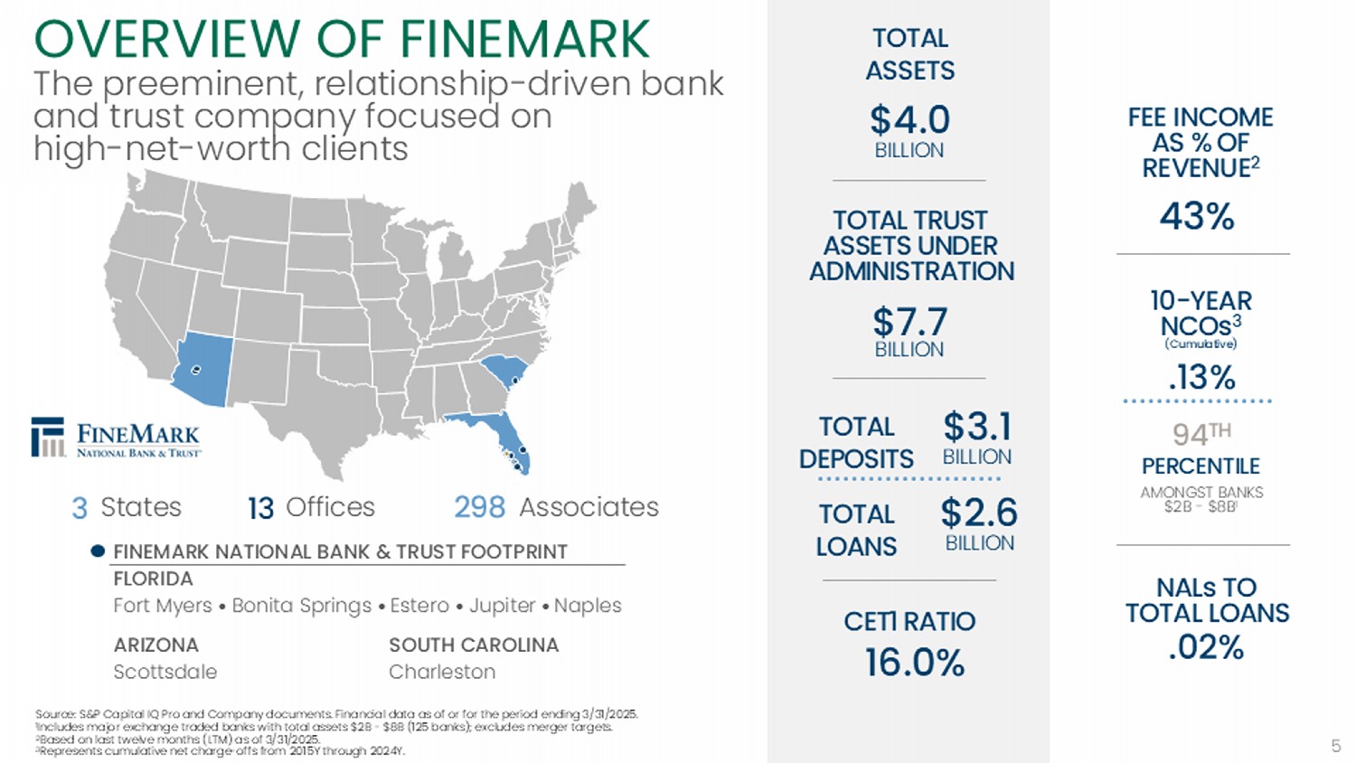 As of March 31, 2025, FineMark had assets of $4.0 billion, deposits of $3.1 billion and loans of $2.6 billion. FineMark’s Trust and Investment business delivers a comprehensive suite of highly personalized services to approximately 2,000 clients with approximately $7.7 billion in assets under administration (“AUA”).