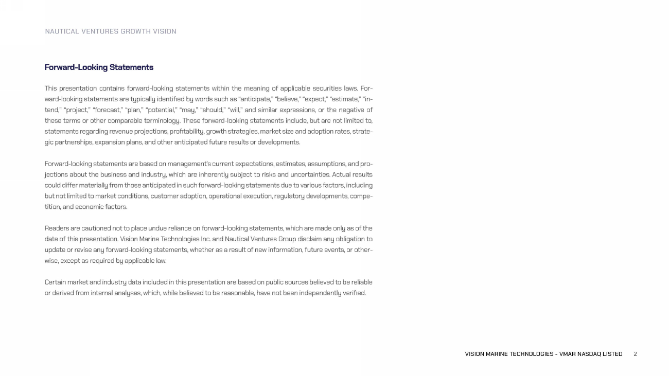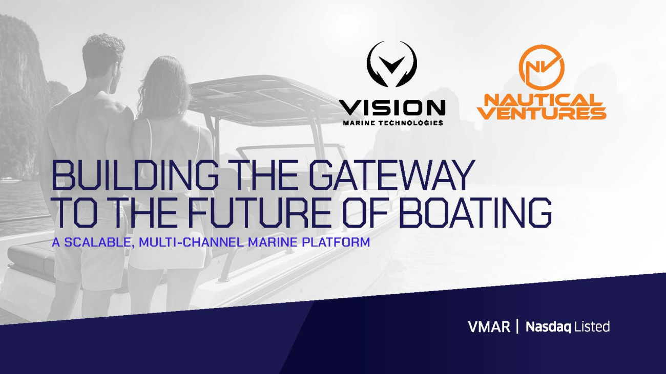 BUILDING THE G A T E W A Y T O THE FUTURE OF B O A T ING A SCALABLE, MULTI - CHANNEL MARINE PLATFORM VISION MARINE TECHNOLOGIES - VMAR NASDAQ LISTED 1 VISION MARINE TECHNOLOGIES - VMAR NASDAQ LISTED 2 NAUTICAL VENTURES GROWTH VISION Forward - Looking Statements This presentation contains forward - looking statements within the meaning of applicable securities laws . For - ward - looking statements are typically identified by words such as “anticipate,” “believe,” “expect,” “estimate,” “in - tend,” “project,” “forecast,” “plan,” “potential,” “may,” “should,” “will,” and similar expressions, or the negative of these terms or other comparable terminology . These forward - looking statements include, but are not limited to, statements regarding revenue projections, profitability, growth strategies, market size and adoption rates, strate - gic partnerships, expansion plans, and other anticipated future results or developments . Forward - looking statements are based on management’s current expectations, estimates, assumptions, and pro - jections about the business and industry, which are inherently subject to risks and uncertainties . Actual results could differ materially from those anticipated in such forward - looking statements due to various factors, including but not limited to market conditions, customer adoption, operational execution, regulatory developments, compe - tition, and economic factors . Readers are cautioned not to place undue reliance on forward - looking statements, which are made only as of the date of this presentation . Vision Marine Technologies Inc . and Nautical Ventures Group disclaim any obligation to update or revise any forward - looking statements, whether as a result of new information, future events, or other - wise, except as required by applicable law . Certain market and industry data included in this presentation are based on public sources believed to be reliable or derived from internal analyses, which, while believed to be reasonable, have not been independently verified .