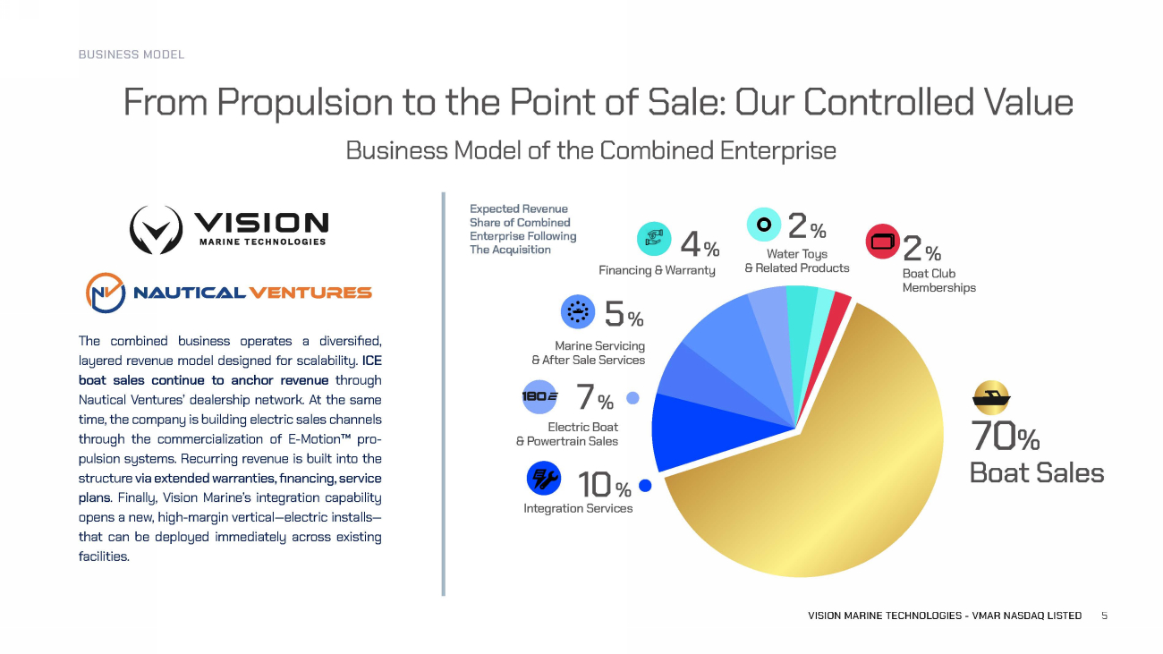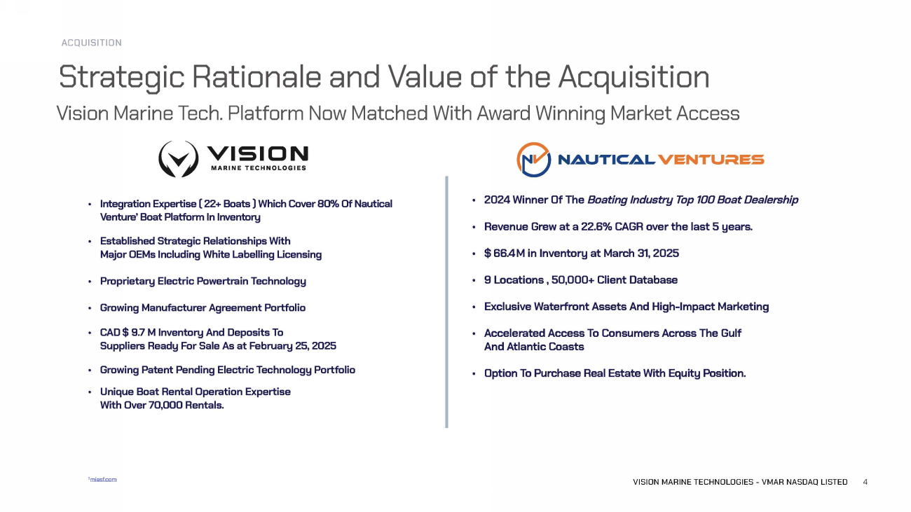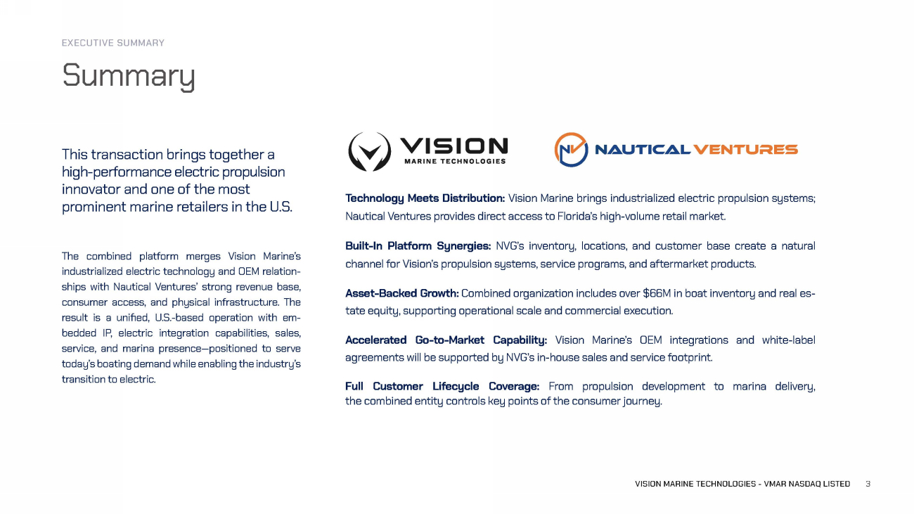 EXECUTIVE SUMMARY Summary This transaction brings together a high - performance electric propulsion innovator and one of the most prominent marine retailers in the U.S. The combined platform merges Vision Marine’s industrialized electric technology and OEM relation - ships with Nautical Ventures’ strong revenue base, consumer access, and physical infrastructure . The result is a unified, U . S . - based operation with em - bedded IP, electric integration capabilities, sales, service, and marina presence — positioned to serve today’s boating demand while enabling the industry’s transition to electric . Technology Meets Distribution: Vision Marine brings industrialized electric propulsion systems; Nautical Ventures provides direct access to Florida’s high - volume retail market. Built - In Platform Synergies: NVG’s inventory, locations, and customer base create a natural channel for Vision’s propulsion systems, service programs, and aftermarket products. Asset - Backed Growth: Combined organization includes over $66M in boat inventory and real es - tate equity, supporting operational scale and commercial execution. Accelerated Go - to - Market Capability: Vision Marine’s OEM integrations and white - label agreements will be supported by NVG’s in - house sales and service footprint. Full Customer Lifecycle Coverage: From propulsion development to marina delivery, the combined entity controls key points of the consumer journey. VISION MARINE TECHNOLOGIES - VMAR NASDAQ LISTED 3 ACQUISITION VISION MARINE TECHNOLOGIES - VMAR NASDAQ LISTED 4 Strategic Rationale and Value of the Acquisition Vision Marine Tech.