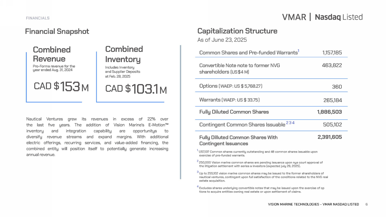 The addition of Vision and are Marine’s E - Motion opportunitys to Nautical the last inventory diversify revenue integration streams and capability expand margins. With additional electric offerings, recurring services, and value - added financing, the combined entity will position itself to potentially generate increasing annual revenue . Financial Snapshot Combined Revenue Pro - Forma revenue for the year ended Aug. 31, 2024 CAD $ 153 M Combined Inventory Includes Inventory and Supplier Deposits at Feb. 28, 2025 CAD $ 10 3 . 1 M Capitalization Structure As of June 23, 2025 Common Shares and Pre - funded Warrants 1 Convertible Note note to former NVG share holders (US$4 M) Options (WAEP: US $ 5,768.27) Warrants (WAEP: US $ 33.75) Fully Diluted Common Shares Contingent Common Shares Issuable 2 3 4 Fully Dilluted Common Shares With Contingent Issuances 1 1,157,137 Common shares currently outstanding and 48 common shares issuable upon exercise of pre - funded warrants. 2 250,000 Vision marine common shares are pending issuance upon nys court approval of the litigation settlement with series a investors (expected july 29, 2025). 3 Up to 255,102 vision marine common shares may be issued to the former shareholders of nautical ventures, contingent upon full satisfaction of the conditions related to the NVG real estate acquisition. 4 Excludes shares underlying convertible notes that may be issued upon the exercise of op tions to acquire entities owning real estate or upon settlement of claims. 1,157,185 463,822 360 265,184 1,886,503 505,102 2,391,605 VISION MARINE TECHNOLOGIES - VMAR NASDAQ LISTED 6 VISION MARINE TECHNOLOGIES - VMAR NASDAQ LISTED 7 NAUTICAL VENTURES ASSETS 9 Locations Robust Installations Strong Brand Presence Nautical Ventures serves as the commercial foundation of the platform.