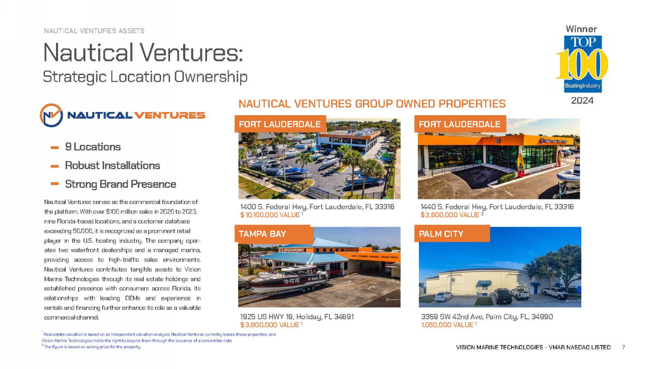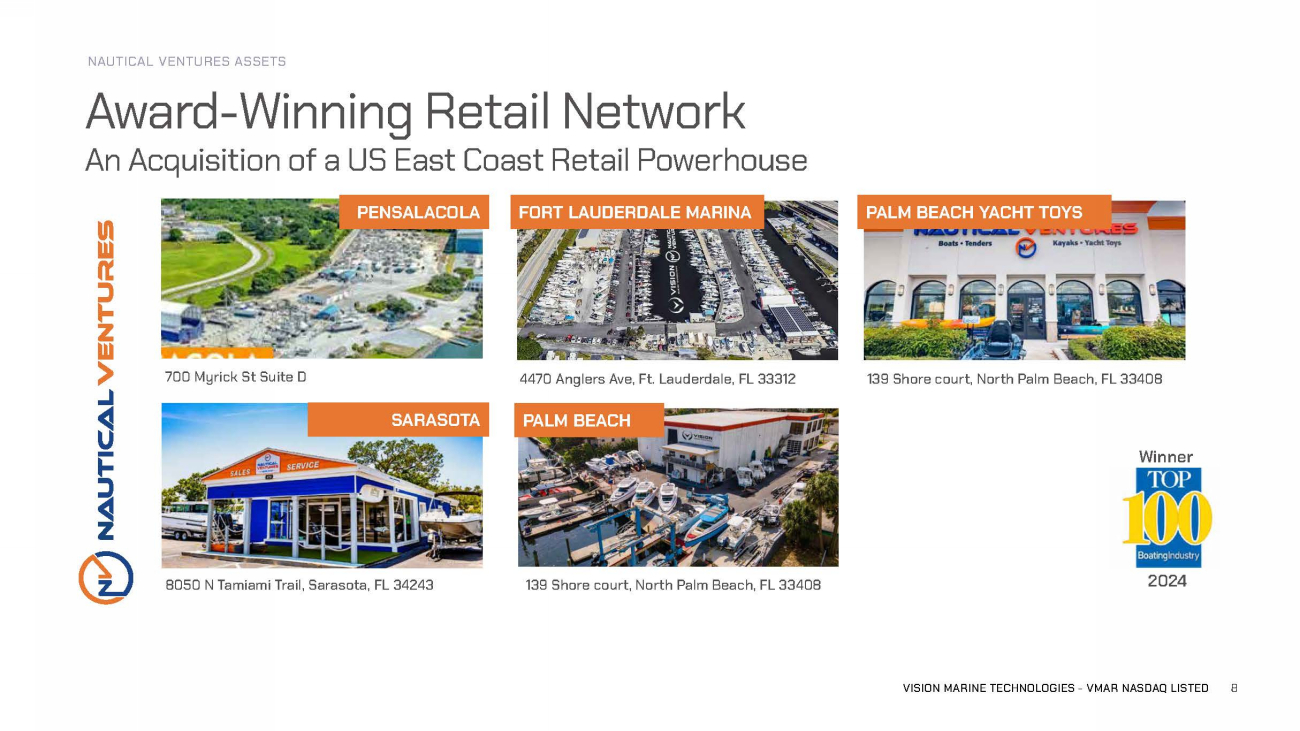NAUTICAL VENTURES ASSETS 139 Shore court, North Palm Beach, FL 33408 700 Myrick St Suite D 8050 N Tamiami Trail, Sarasota, FL 34243 4470 Anglers Ave, Ft. Lauderdale, FL 33312 139 Shore court, North Palm Beach, FL 33408 PENSALACOLA PALM BEACH SARASOTA FORT LAUDERDALE MARINA PALM BEACH YACHT TOYS An Acquisition of a US East Coast Retail Powerhouse Award - Winning Retail Network Winner 2024 VISION MARINE TECHNOLOGIES - VMAR NASDAQ LISTED 8 VISION MARINE TECHNOLOGIES platforms.
