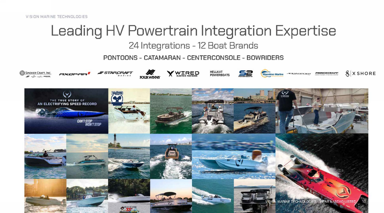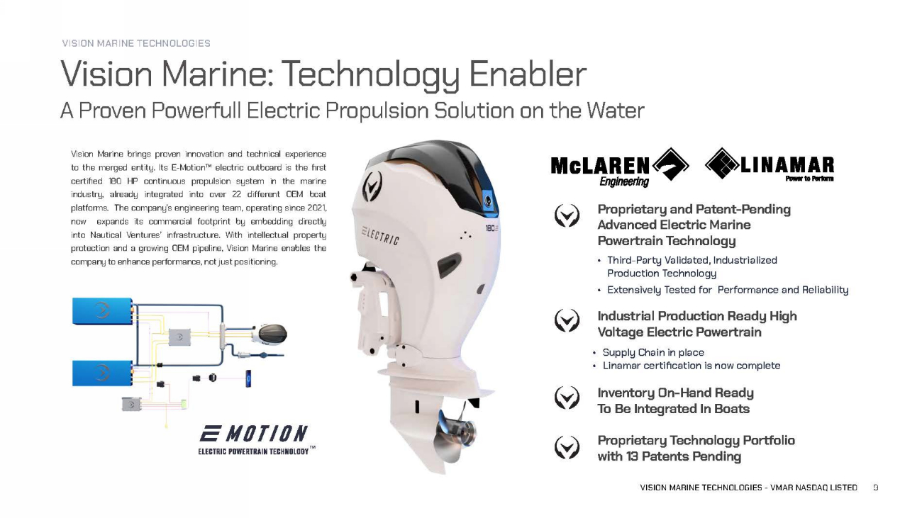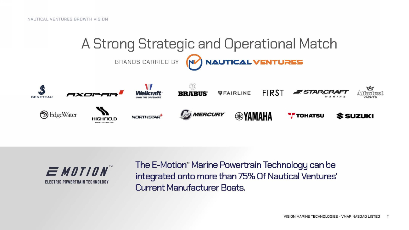 The company’s engineering team, operating since 2021, now expands its commercial footprint by embedding directly into Nautical Ventures’ infrastructure . With intellectual property protection and a growing OEM pipeline, Vision Marine enables the company to enhance performance, not just positioning . A Proven Powerfull Electric Propulsion Solution on the Water Vision Marine brings proven innovation and technical experience to the merged entity . Its E - Motion electric outboard is the first certified 180 HP continuous propulsion system in the marine industry, already integrated into over 22 different OEM boat Vision Marine: T echnolog y Enabler • Extensively Tested for Performance and Reliability Industrial Production Ready High Voltage Electric Powertrain • Supply Chain in place • Linamar certification is now complete Inventory On - Hand Ready To Be Integrated In Boats Proprietary and Patent - Pending Advanced Electric Marine Powertrain Technology • Third - Party Validated, Industrialized Production Technology Proprietary Technology Portfolio with 13 Patents Pending VISION MARINE TECHNOLOGIES - VMAR NASDAQ LISTED 9 VISIO N MARINE TECHNOLOGIES - VMAR NASDAQ LISTED 10 Leading HV Powertrain Integration Expertise 24 Integrations - 12 Boat Brands PONTOONS - CATAMARAN - CENTERCONSOLE - BOWRIDERS HELLKAT POWERBOATS VISION MARINE TECHNOLOGIES VISION MARINE TECHNOLOGIES - VMAR NASDAQ LISTED 10