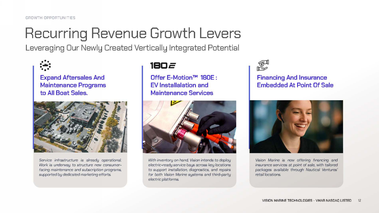 A Strong Strategic and Operational Match VISION MARINE TECHNOLOGIES - VMAR NASDAQ LISTED 11 GROWTH OPPORTUNITIES Expand Aftersales And Maintenance Programs to All Boat Sales . Offer E - Motion 180E : EV Installalation and Maintenance Services Financing And Insurance Embedded At Point Of Sale Service infrastructure is already operational . Work is underway to structure new consumer - facing maintenance and subscription programs, supported by dedicated marketing efforts . With inventory on hand, Vision intends to deploy electric - ready service bays across key locations to support installation, diagnostics, and repairs for both Vision Marine systems and third - party electric platforms . Vision Marine is now offering financing and insurance services at point of sale, with tailored packages available through Nautical Ventures’ retail locations .