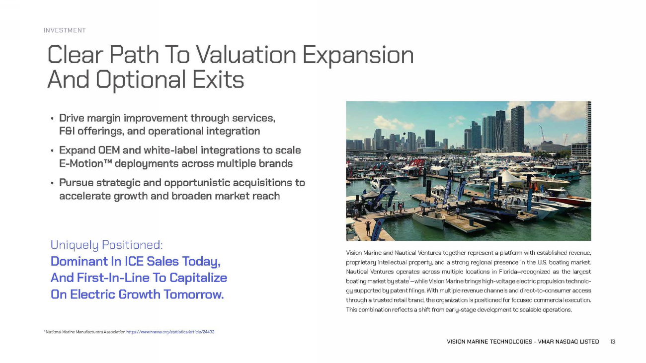 Recurring Revenue Growth Levers Leveraging Our Newly Created Vertically Integrated Potential VISION MARINE TECHNOLOGIES - VMAR NASDAQ LISTED 12 INVESTMENT • Drive margin improvement through services, F&I offerings, and operational integration • Expand OEM and white - label integrations to scale E - Motion deployments across multiple brands • Pursue strategic and opportunistic acquisitions to accelerate growth and broaden market reach Vision Marine and Nautical Ventures together represent a platform with established revenue, proprietary intellectual property, and a strong regional presence in the U . S . boating market . Nautical Ventures operates across multiple locations in Florida — recognized as the largest boating market by state 1 — while Vision Marine brings high - voltage electric propulsion technolo - gy supported by patent filings . With multiple revenue channels and direct - to - consumer access through a trusted retail brand, the organization is positioned for focused commercial execution . This combination reflects a shift from early - stage development to scalable operations . Clear Path T o Valuation Expansion And Optional Exits Uniquely Positioned: Dominant In ICE Sales Today, And First - In - Line To Capitalize On Electric Growth Tomorrow.