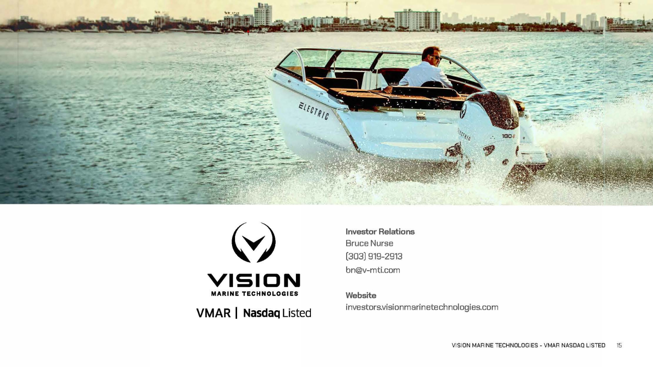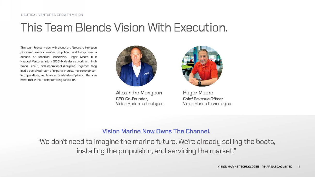 ¹ National Marine Manufacturers Association h ttps://www.nmma.org/statistics/article/24433 VISION MARINE TECHNOLOGIES - VMAR NASDAQ LISTED 13 NAUTICAL VENTURES GROWTH VISION Alexandre Mongeon CEO, Co - Founder, Vision Marine technologies Roger Moore Chief Revenue Officer Vision Marine Technologies This team blends vision with execution . Alexandre Mongeon pioneered electric marine propulsion and brings over a decade of technical leadership . Roger Moore built Nautical Ventures into a $ 100 M+ dealer network with high brand equity and operational discipline . Together, they lead a combined team of experts in sales, marine engineer - ing, operations, and finance . It’s a leadership bench that can move fast without compromising execution . This T e a m Blends Vision With Execution. Vision Marine Now Owns The Channel. “We don’t need to imagine the marine future. We’re already selling the boats, installing the propulsion, and servicing the market.” VISION MARINE TECHNOLOGIES - VMAR NASDAQ LISTED 14 VISION Investor Relations Bruce Nurse (303) 919 - 2913 bn@v - mti.com Website investors.visionmarinetechnologies.com VISION MARINE TECHNOLOGIES - VMAR NASDAQ LISTED 15