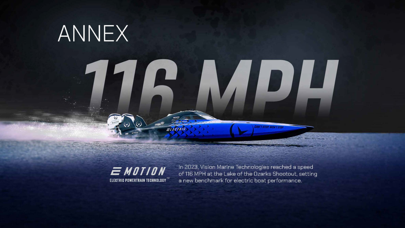 ANNEX In 2023, Vision Marine Technologies reached a speed of 116 MPH at the Lake of the Ozarks Shootout, setting a new benchmark for electric boat performance.