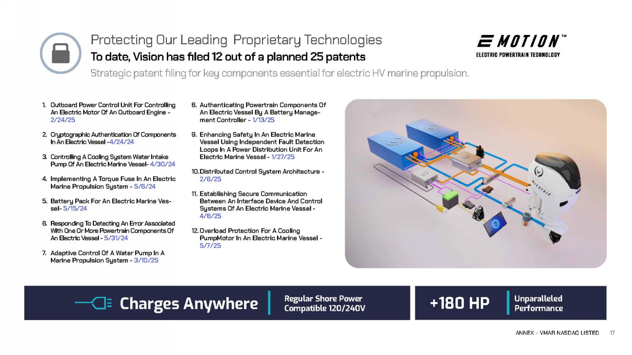 Protecting Our Leading Proprietary Technologies To date, Vision has filed 12 out of a planned 25 patents Strategic patent filing for key components essential for electric HV marine propulsion. Regular Shore Power Compatible 120/240V Unparalleled Performance +180 HP Charges Anywhere 1. Outboard Power Control Unit For Controlling An Electric Motor Of An Outboard Engine - 2/24/25 2. Cryptographic Authentication Of Components In An Electric Vessel - 4/24/24 3. Controlling A Cooling System Water Intake Pump Of An Electric Marine Vessel - 4/30/24 4. Implementing A Torque Fuse In An Electric Marine Propulsion System - 5/6/24 5. Battery Pack For An Electric Marine Ves - sel - 5/15/24 6. Responding To Detecting An Error Associated With One Or More Powertrain Components Of An Electric Vessel - 5 / 31 / 24 7. Adaptive Control Of A Water Pump In A Marine Propulsion System - 3/10/25 ANNEX - VMAR NASDAQ LISTED 17 8. Authenticating Powertrain Components Of An Electric Vessel By A Battery Manage - ment Controller - 1/13/25 9. Enhancing Safety In An Electric Marine Vessel Using Independent Fault Detection Loops In A Power Distribution Unit For An Electric Marine Vessel - 1/27/25 10. Distributed Control System Architecture - 2/6/25 11. Establishing Secure Communication Between An Interface Device And Control Systems Of An Electric Marine Vessel - 4/8/25 12. Overload Protection For A Cooling PumpMotor In An Electric Marine Vessel - 5/7/25 T echnolog y Integration Pushing the Limits of Electric Speed Performance.