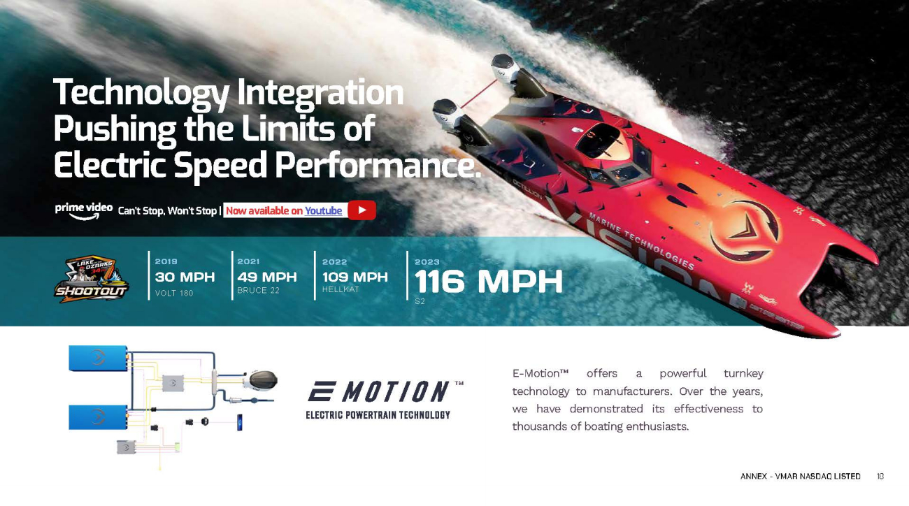 Can’t Stop, Won’t Stop | E - Motion offers a powerful turnkey technology to manufacturers . Over the years, we have demonstrated its effectiveness to thousands of boating enthusiasts . 116 MPH S2 2019 30 MPH VOLT 180 2021 49 MPH BRUCE 22 2022 109 MPH HELLKAT 2023 Now available on Youtube ANNEX - VMAR NASDAQ LISTED 18