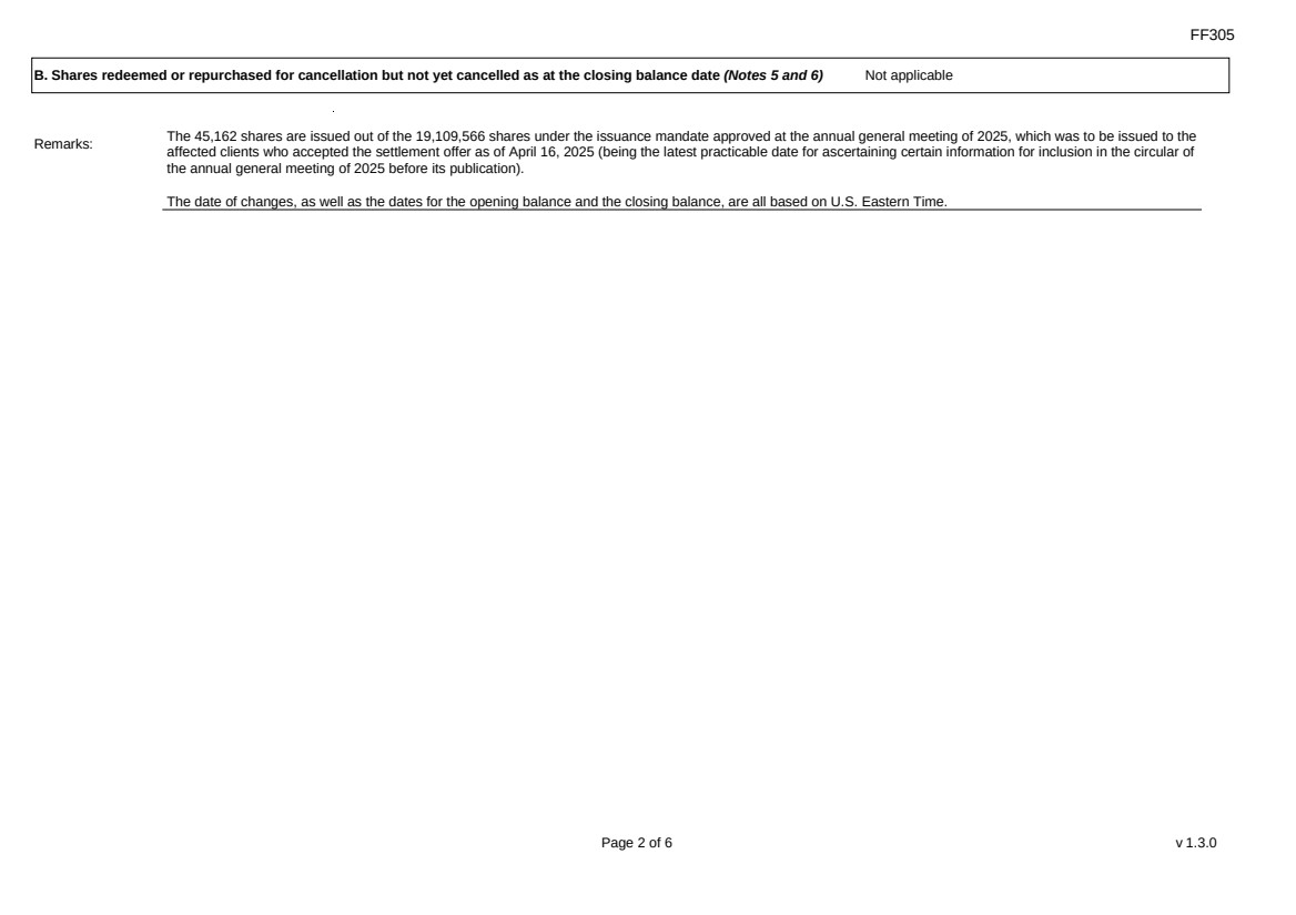 FF305 Page 2 of 6 v 1.3.0 B. Shares redeemed or repurchased for cancellation but not yet cancelled as at the closing balance date (Notes 5 and 6) Not applicable Remarks: The 45,162 shares are issued out of the 19,109,566 shares under the issuance mandate approved at the annual general meeting of 2025, which was to be issued to the affected clients who accepted the settlement offer as of April 16, 2025 (being the latest practicable date for ascertaining certain information for inclusion in the circular of the annual general meeting of 2025 before its publication). The date of changes, as well as the dates for the opening balance and the closing balance, are all based on U.S. Eastern Time. |