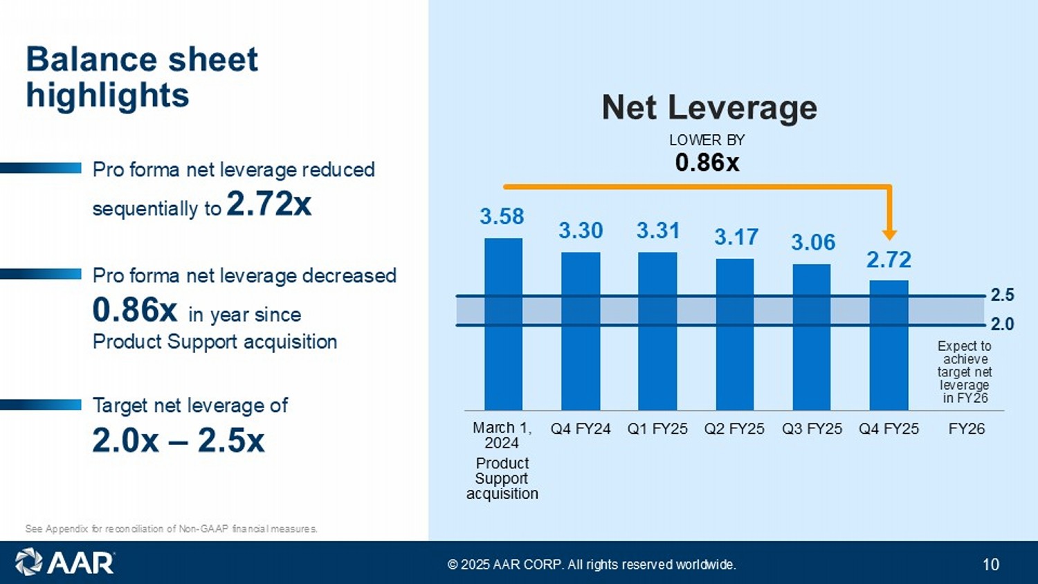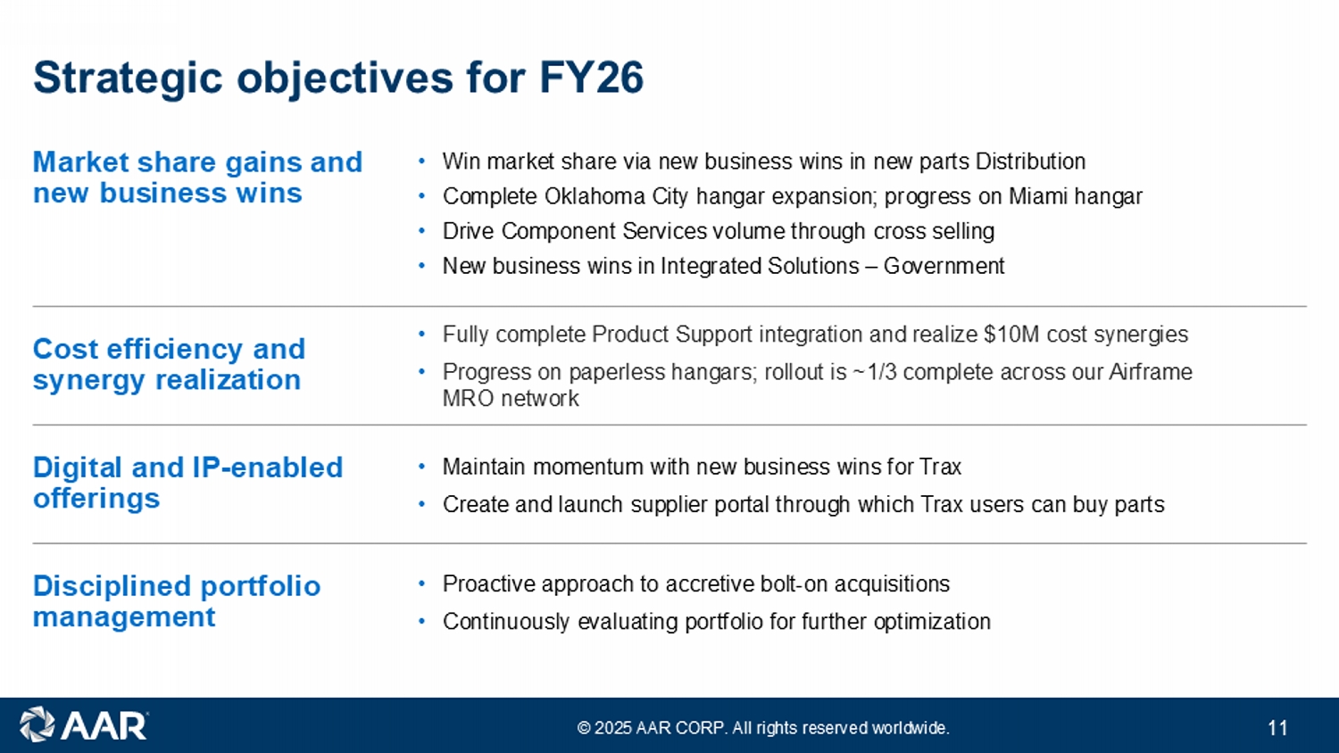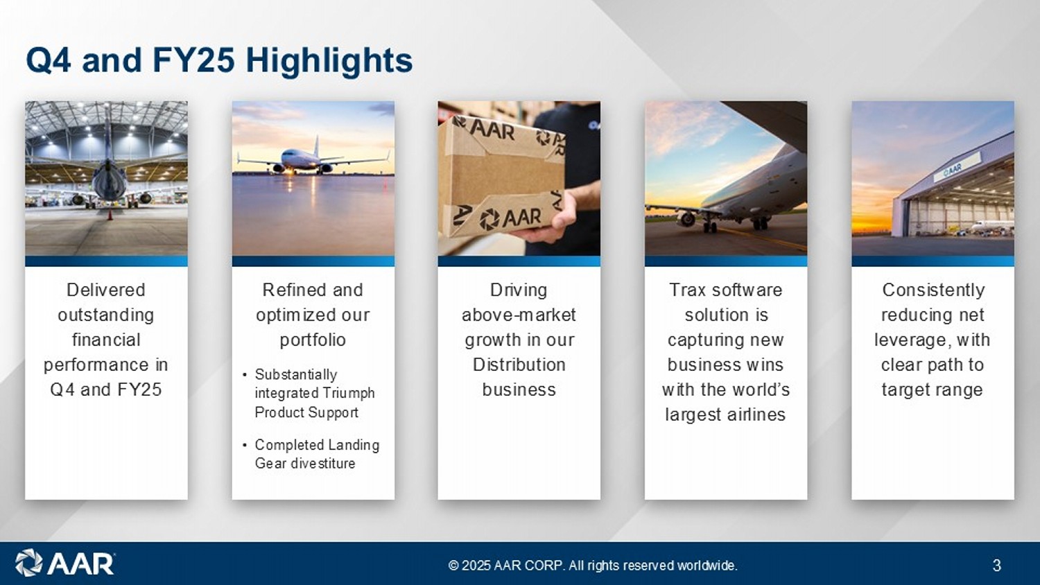 「AARの会長兼社長兼最高経営責任者(CEO)であるジョン・M・ホームズ氏は、「2025年度は、過去最高の売上高と収益性を達成し、戦略目標に対して有意義な進展を遂げました。「プロダクト・サポート買収の統合を実質的に完了し、ランディングギア・オーバーホール事業の売却によりポートフォリオの最適化を継続しました。また、急成長している新規部品販売事業への投資をさらに進め、2つの格納庫の拡張を開始し、トラックス・ソフトウェア・ソリューションのいくつかの重要な新規事業獲得を発表しました。当社は引き続きネット・レバレッジを引き下げ、会計年度を2.72倍で終えました。当社の最適化されたポートフォリオは、強化されたバランスシートと相まって、より高い成長、より高い利益率、より強いリターンをもたらしています。"