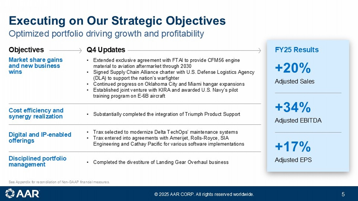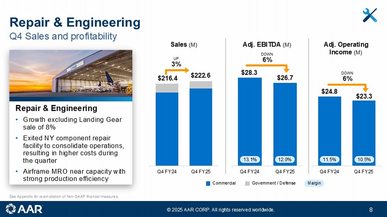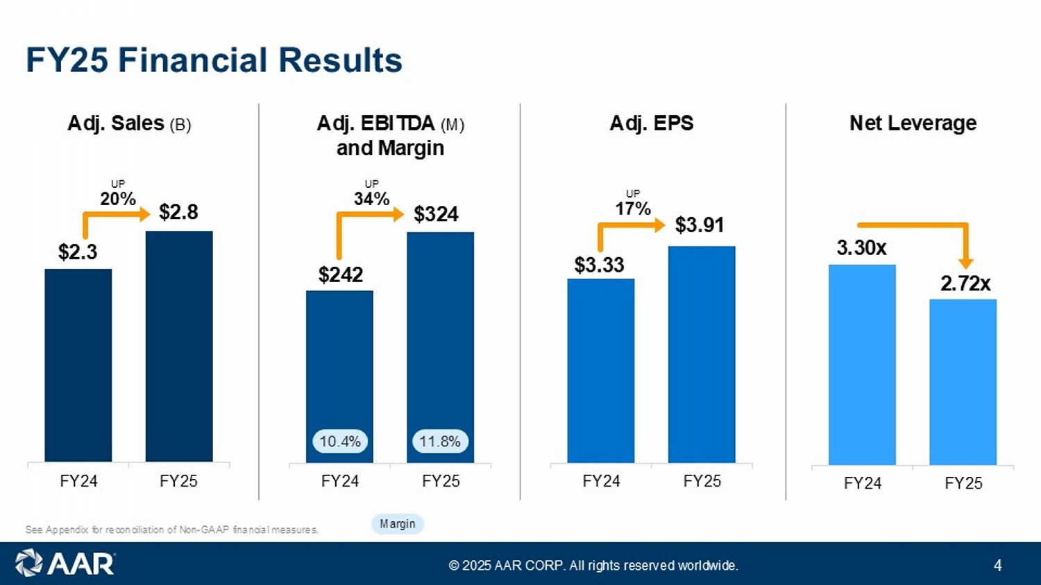 イリノイ州ウッドデール、2025年7月16日 - AAR CORP. (NYSE:AIR)は本日、民間および政府機関、MRO、OEMに航空サービスを提供するリーディング・カンパニーとして、2025年5月31日を期末とする第4四半期および会計年度の業績を発表した。