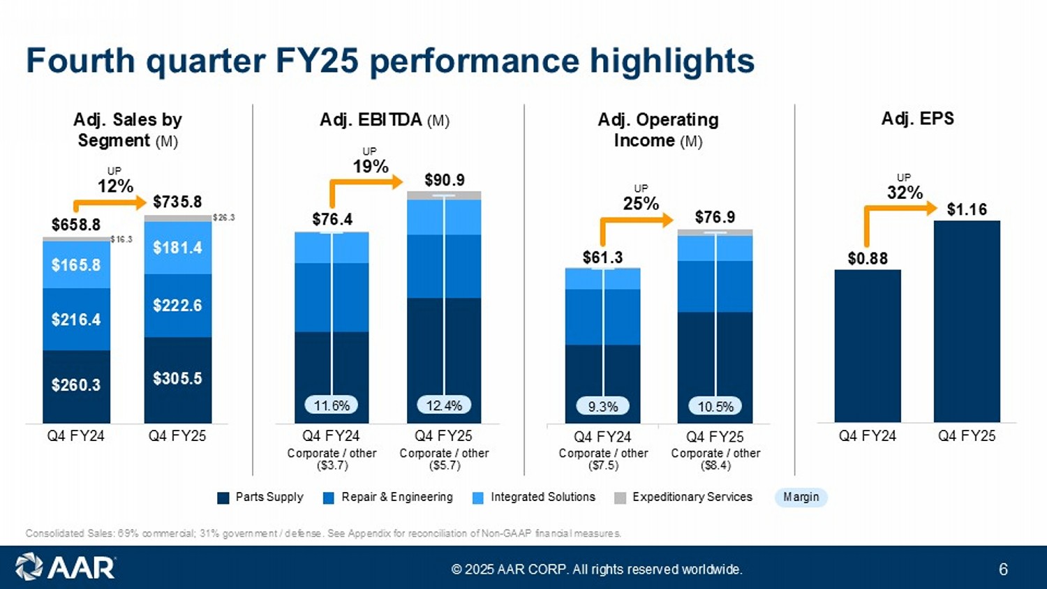第 4 四半期の連結売上高は、前年同期の 6 億 5,650 万ドルに対し、15%増の 7 億 5,450 万ドルとなりました。2025年度第4四半期の売上高には、パワー・バイ・ザ・アワー・プログラムの終了に伴う、ある特定の回転式資産の大手地域航空会社への1,870万ドルでの売却が含まれており、調整後の売上高からは除外されています。法人顧客向け連結売上高は、主に新規部品販売活動に対する旺盛な需要と回転可能資産の売却により、12%増の5,650万ドルとなった。官公庁向け売上高は前年同期比21%増となりましたが、これは主に新規部品販売事業の受注量の増加と統合ソリューション部門の2桁成長によるものです。法人顧客向け売上高は連結売上高の 69%(前年同期は 70%)でした。