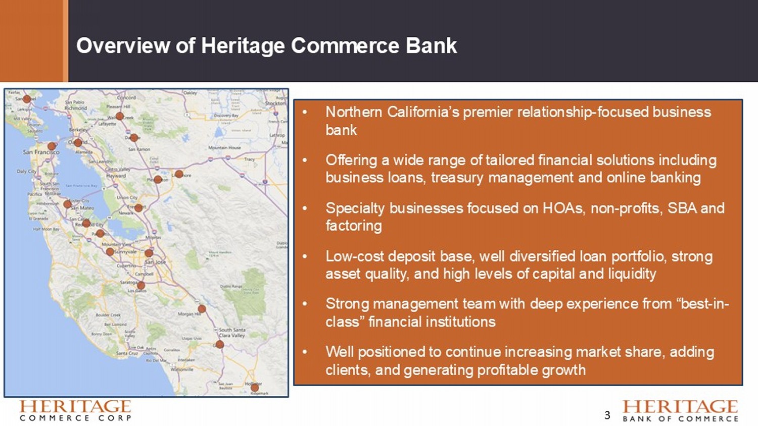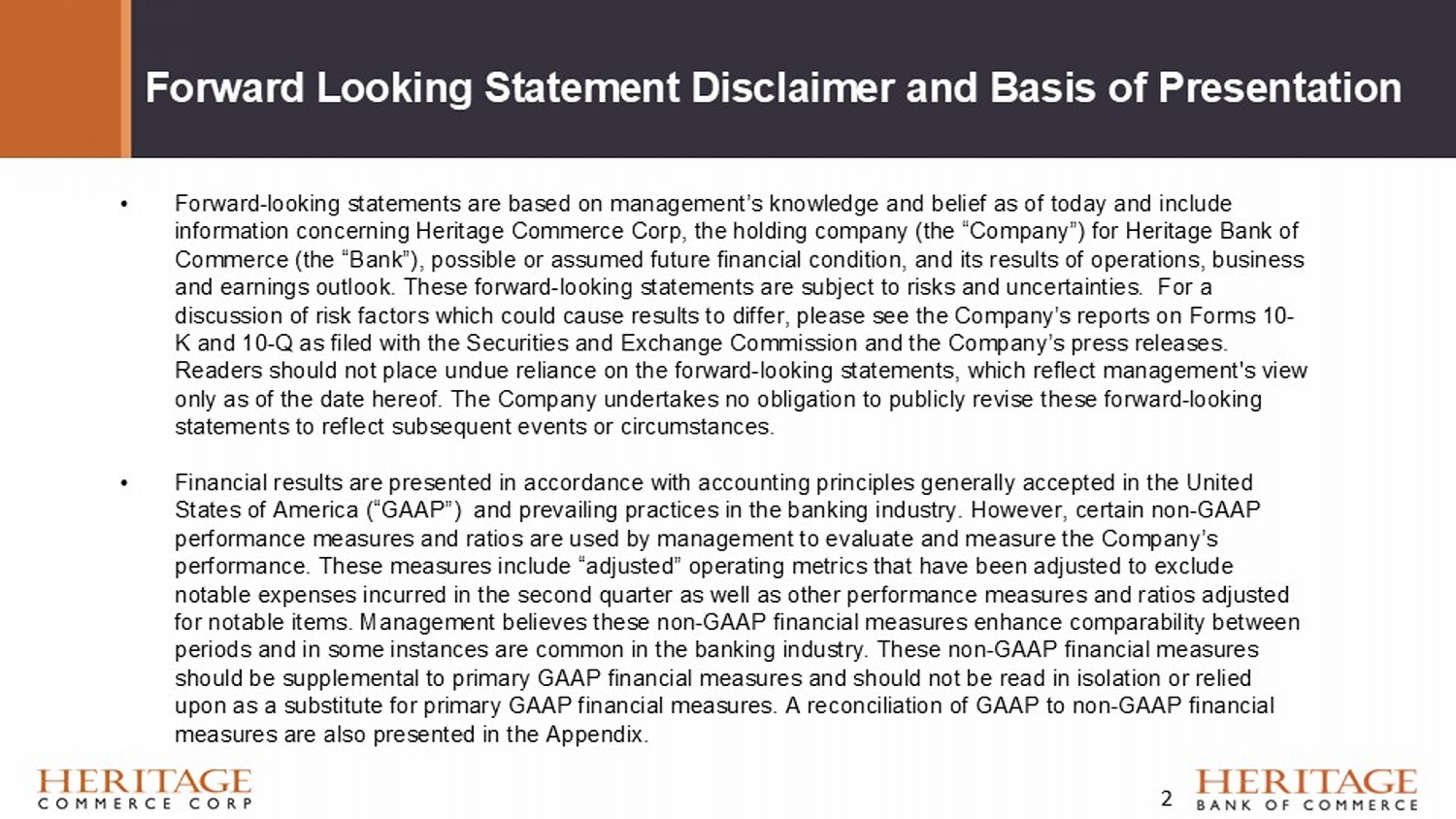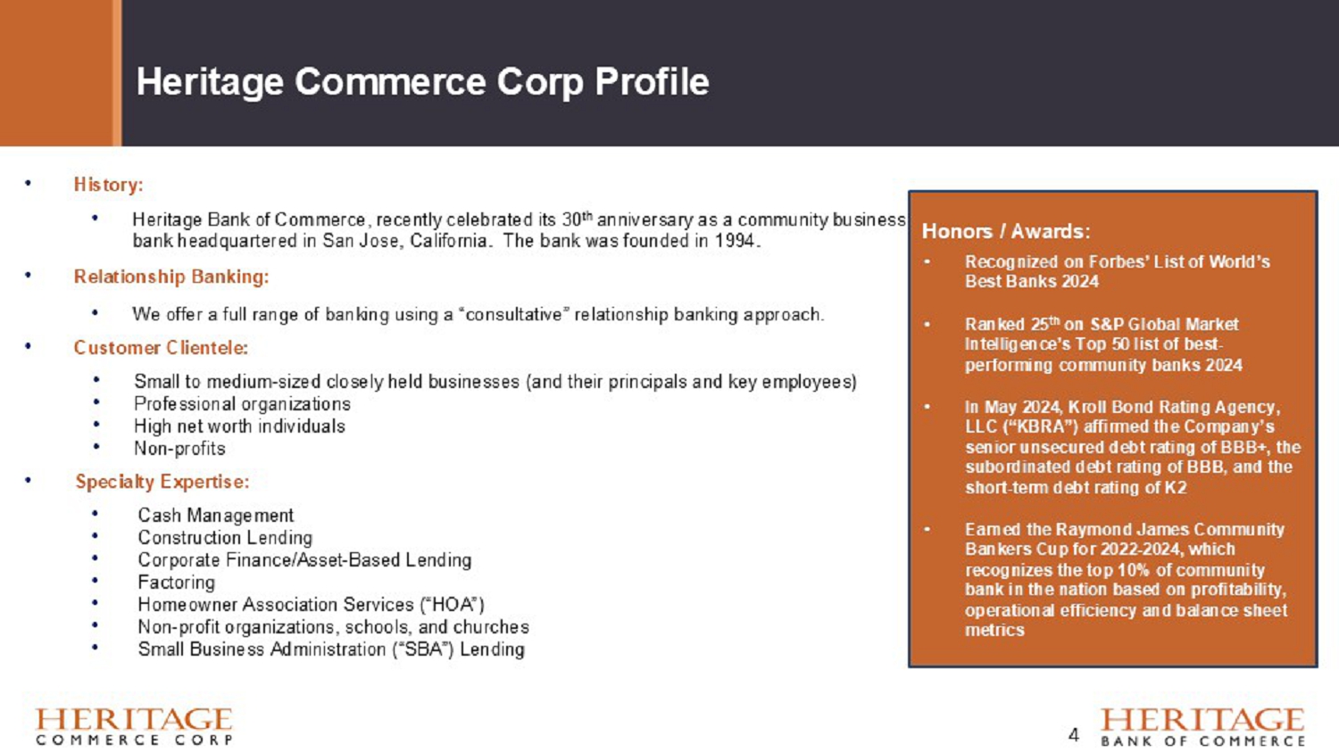 Forward Looking Statement Disclaimer and Basis of Presentation • Forward - looking statements are based on management’s knowledge and belief as of today and include information concerning Heritage Commerce Corp, the holding company (the “Company”) for Heritage Bank of Commerce (the “Bank”), possible or assumed future financial condition, and its results of operations, business and earnings outlook. These forward - looking statements are subject to risks and uncertainties. For a discussion of risk factors which could cause results to differ, please see the Company’s reports on Forms 10 - K and 10 - Q as filed with the Securities and Exchange Commission and the Company’s press releases. Readers should not place undue reliance on the forward - looking statements, which reflect management's view only as of the date hereof. The Company undertakes no obligation to publicly revise these forward - looking statements to reflect subsequent events or circumstances. • Financial results are presented in accordance with accounting principles generally accepted in the United States of America (“GAAP”) and prevailing practices in the banking industry. However, certain non - GAAP performance measures and ratios are used by management to evaluate and measure the Company’s performance. These measures include “adjusted” operating metrics that have been adjusted to exclude notable expenses incurred in the second quarter as well as other performance measures and ratios adjusted for notable items. Management believes these non - GAAP financial measures enhance comparability between periods and in some instances are common in the banking industry. These non - GAAP financial measures should be supplemental to primary GAAP financial measures and should not be read in isolation or relied upon as a substitute for primary GAAP financial measures. A reconciliation of GAAP to non - GAAP financial measures are also presented in the Appendix. 2 Overview of Heritage Commerce Bank 3 • Northern California’s premier relationship - focused business bank • Offering a wide range of tailored financial solutions including business loans, treasury management and online banking • Specialty businesses focused on HOAs, non - profits, SBA and factoring • Low - cost deposit base, well diversified loan portfolio, strong asset quality, and high levels of capital and liquidity • Strong management team with deep experience from “best - in - class” financial institutions • Well positioned to continue increasing market share, adding clients, and generating profitable growth