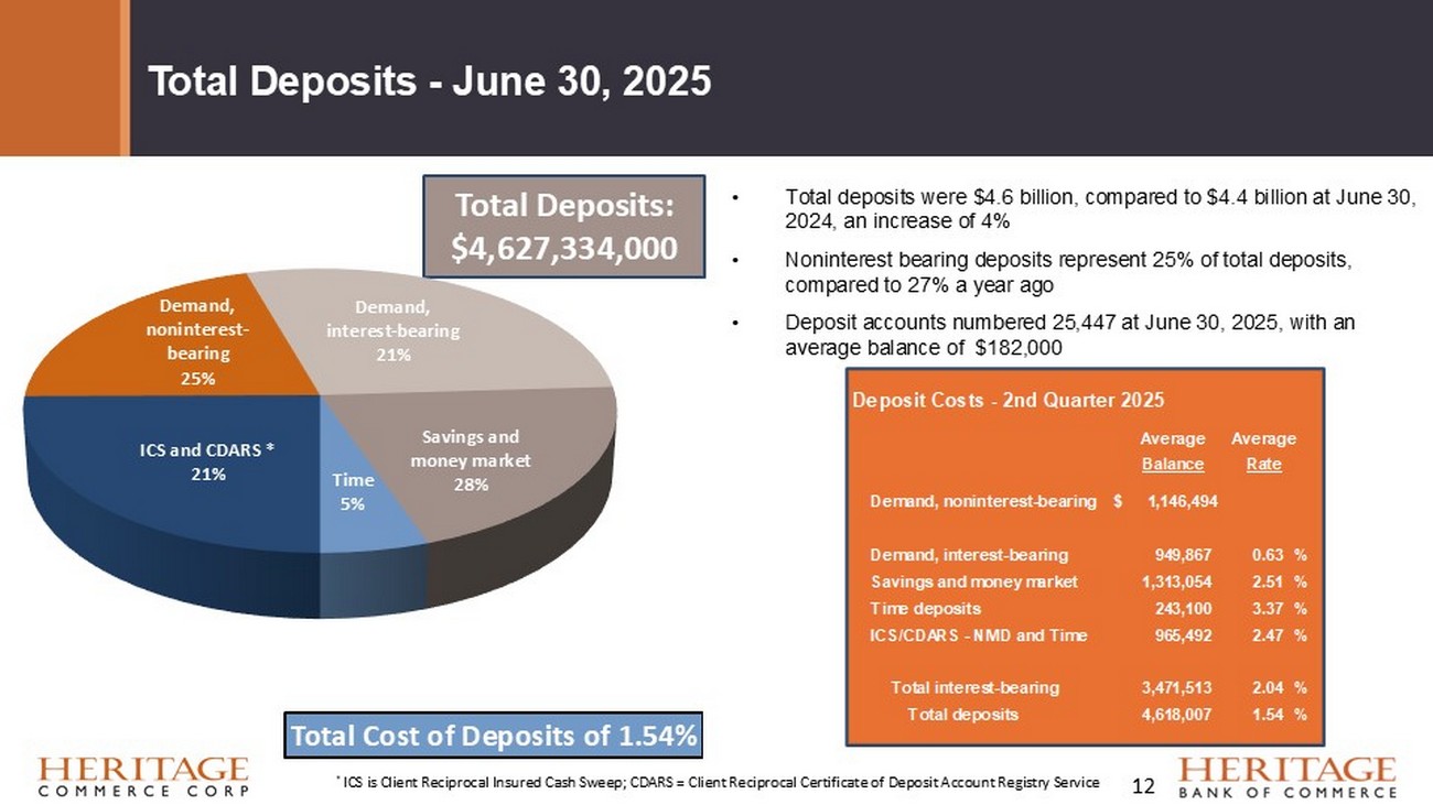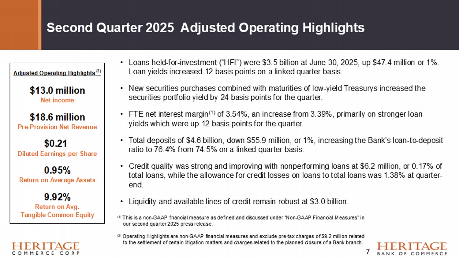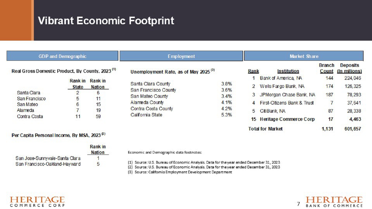 Forward Looking Statement Disclaimer and Basis of Presentation • Forward - looking statements are based on management’s knowledge and belief as of today and include information concerning Heritage Commerce Corp, the holding company (the “Company”) for Heritage Bank of Commerce (the “Bank”), possible or assumed future financial condition, and its results of operations, business and earnings outlook. These forward - looking statements are subject to risks and uncertainties. For a discussion of risk factors which could cause results to differ, please see the Company’s reports on Forms 10 - K and 10 - Q as filed with the Securities and Exchange Commission and the Company’s press releases. Readers should not place undue reliance on the forward - looking statements, which reflect management's view only as of the date hereof. The Company undertakes no obligation to publicly revise these forward - looking statements to reflect subsequent events or circumstances. • Financial results are presented in accordance with accounting principles generally accepted in the United States of America (“GAAP”) and prevailing practices in the banking industry. However, certain non - GAAP performance measures and ratios are used by management to evaluate and measure the Company’s performance. These measures include “adjusted” operating metrics that have been adjusted to exclude notable expenses incurred in the second quarter as well as other performance measures and ratios adjusted for notable items. Management believes these non - GAAP financial measures enhance comparability between periods and in some instances are common in the banking industry. These non - GAAP financial measures should be supplemental to primary GAAP financial measures and should not be read in isolation or relied upon as a substitute for primary GAAP financial measures. A reconciliation of GAAP to non - GAAP financial measures are also presented in the Appendix. 2 Overview of Heritage Commerce Bank 3 • Northern California’s premier relationship - focused business bank • Offering a wide range of tailored financial solutions including business loans, treasury management and online banking • Specialty businesses focused on HOAs, non - profits, SBA and factoring • Low - cost deposit base, well diversified loan portfolio, strong asset quality, and high levels of capital and liquidity • Strong management team with deep experience from “best - in - class” financial institutions • Well positioned to continue increasing market share, adding clients, and generating profitable growth