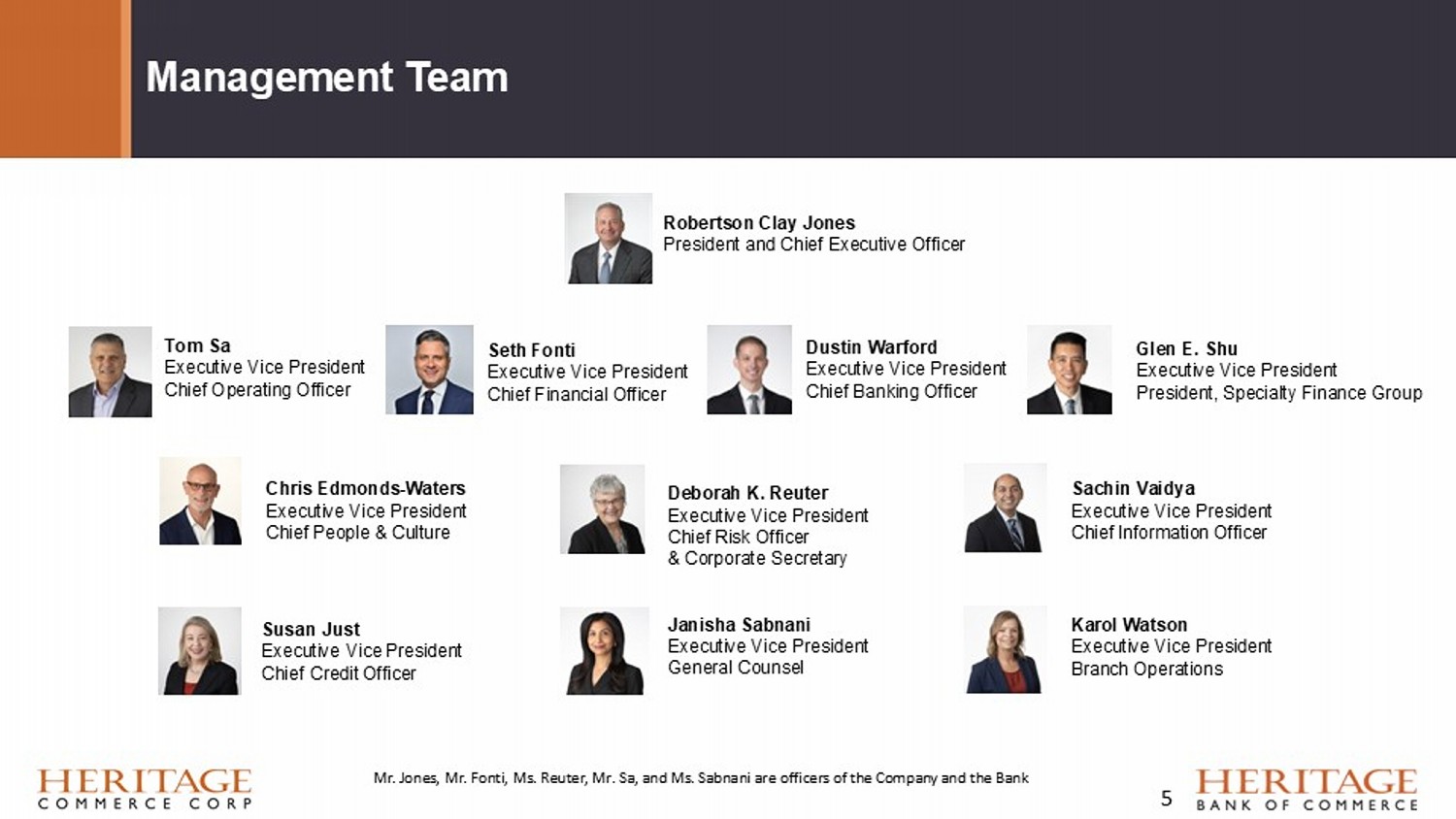 Heritage Commerce Corp Profile History: Heritage Bank of Commerce, recently celebrated its 30th anniversary as a community business bank headquartered in San Jose, California. The bank was founded in 1994. Relationship Banking: We offer a full range of banking using a consultative relationship banking approach. Customer Clientele: Small to medium-sized closely held businesses (and their principals and key employees) Professional organizations High net worth individuals Non-profits Specialty Expertise: Cash Management Construction Lending Corporate Finance/Asset-Based Lending Factoring Homeowner Association Services (HOA) Non-profit organizations, schools, and churches Small Business Administration (SBA) Lending Honors / Awards: Recognized on Forbes List of Worlds Best Banks 2024 Ranked 25th on SP Global Market Intelligences Top 50 list of bestperforming community banks 2024 In May 2024, Kroll Bond Rating Agency, LLC (KBRA) affirmed the Companys senior unsecured debt rating of BBB+, the subordinated debt rating of BBB, and the short-term debt rating of K2 Earned the Raymond James Community Bankers Cup for 2022-2024, which recognizes the top 10% of community bank in the nation based on profitability, operational efficiency and balance sheet metrics 4 Management Team Robertson Clay Jones President and Chief Executive Officer Chris Edmonds - Waters Executive Vice President Chief People & Culture Deborah K. Reuter Executive Vice President Chief Risk Officer & Corporate Secretary Janisha Sabnani Executive Vice President General Counsel Sachin Vaidya Executive Vice President Chief Information Officer Karol Watson Executive Vice President Branch Operations Tom Sa Executive Vice President Chief Operating Officer Glen E. Shu Executive Vice President President, Specialty Finance Group Dustin Warford Executive Vice President Chief Banking Officer Mr . Jones, Mr . Fonti, Ms . Reuter, Mr . Sa, and Ms . Sabnani are officers of the Company and the Bank 5 Seth Fonti Executive Vice President Chief Financial Officer Susan Just Executive Vice President Chief Credit Officer