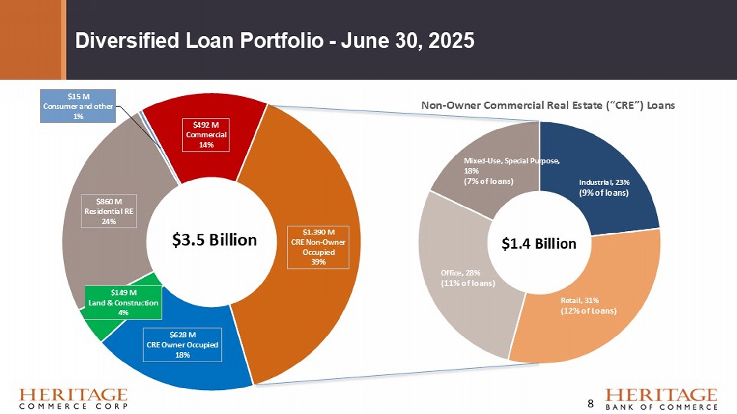 Vibrant Economic Footprint 7 Market Share Branch Deposits Rank Institution Count (In millions) 1 Bank of America, NA 144 224,046 2 Wells Fargo Bank, NA 174 126,325 3 JPMorgan Chase Bank, NA 187 78,293 4 First-Citizens Bank & Trust 7 37,641 5 CitiBank, NA 87 28,338 15 Heritage Commerce Corp 17 4,463 Total for Market 1,131 601,657 Economic and Demographic data footnotes: (1) Source: U.S. Bureau of Economic Analysis. Data for the year ended December 31, 2023 (2) Source: U.S. Bureau of Economic Analysis. Data for the year ended December 31, 2023 (3) Source: California Employment Development Department GDP and Demographic Real Gross Domestic Product, By County, 2023 (1) Rank in State Rank in Nation Santa Clara 2 6 San Francisco 5 11 San Mateo 6 15 Alameda 7 19 Contra Costa 11 59 Per Capita Personal Income, By MSA, 2023 (2) Rank in Nation San Jose-Sunnyvale-Santa Clara 1 San Francisco-Oakland-Hayward 5 Employment Unemployment Rate, as of May 2025 (3) Santa Clara County 3.8% San Francisco County 3.6% San Mateo County 3.4% Alameda County 4.1% Contra Costa County 4.2% California State 5.3% • Loans held - for - investment (“HFI”) were $3.5 billion at June 30, 2025, up $47.4 million or 1%.