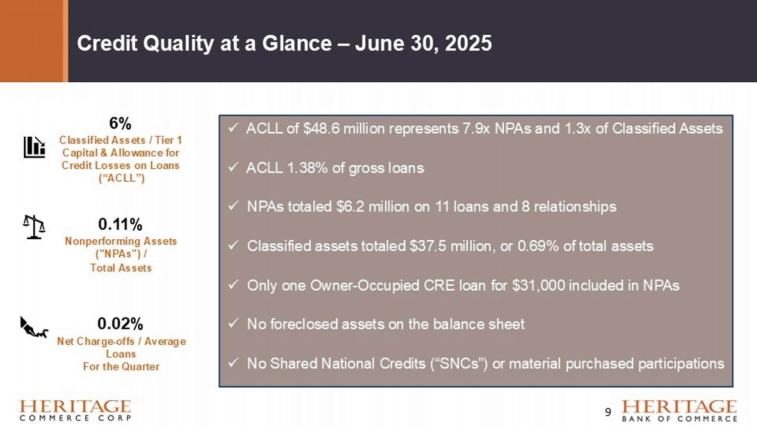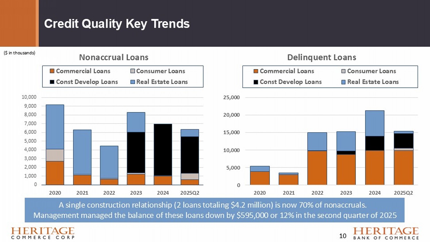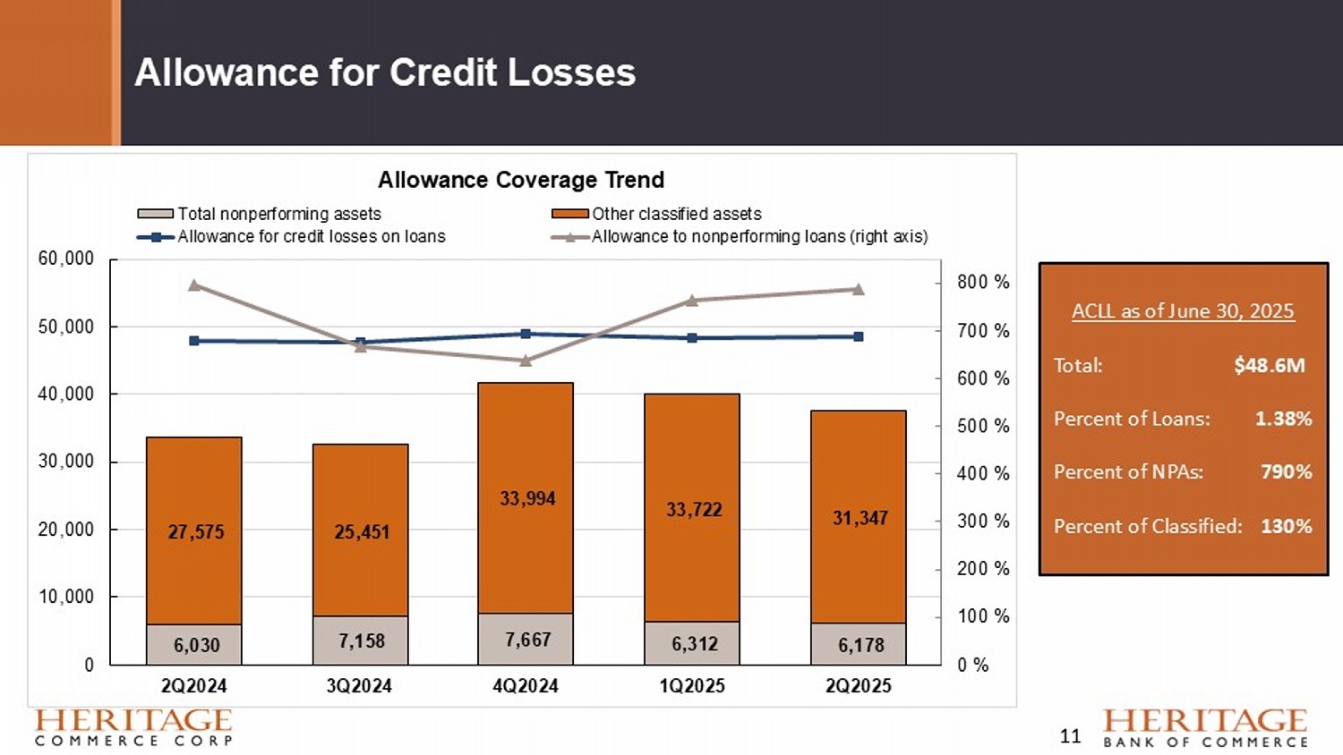 Tangible Common Equity Diversified Loan Portfolio - June 30, 2025 Industrial , 23% (9% of loans) Retail , 31% (12% of Loans) Office , 28% (11% of loans) Mixed - Use, Special Purpose , 18% (7% of loans) Non - Owner Commercial Real Estate (“CRE”) Loans $1.4 Billion $492 M Commercial 14% $1,390 M CRE Non - Owner Occupied 39% $628 M CRE Owner Occupied 18% $149 M Land & Construction 4% $860 M Residential RE 24% $15 M Consumer and other 1% $3.5 Billion 8 Credit Quality at a Glance – June 30, 2025 x ACLL of $48.6 million represents 7.9x NPAs and 1.3x of Classified Assets x ACLL 1.38% of gross loans x NPAs totaled $6.2 million on 11 loans and 8 relationships x Classified assets totaled $37.5 million, or 0.69% of total assets x Only one Owner - Occupied CRE loan for $31,000 included in NPAs x No foreclosed assets on the balance sheet x No Shared National Credits (“SNCs”) or material purchased participations 6% Classified Assets / Tier 1 Capital & Allowance for Credit Losses on Loans (“ACLL”) 0.11% Nonperforming Assets ("NPAs") / Total Assets 0.02% Net Charge - offs / Average Loans For the Quarter 9 Credit Quality Key Trends ($ in thousands) 10 0 5,000 10,000 15,000 20,000 25,000 2020 2021 2022 2023 2024 2025Q2 Delinquent Loans Commercial Loans Consumer Loans Const Develop Loans Real Estate Loans 0 1,000 2,000 3,000 4,000 5,000 6,000 7,000 8,000 9,000 10,000 2020 2021 2022 2023 2024 2025Q2 Nonaccrual Loans Commercial Loans Consumer Loans Const Develop Loans Real Estate Loans A single construction relationship (2 loans totaling $4.2 million) is now 70% of nonaccruals.