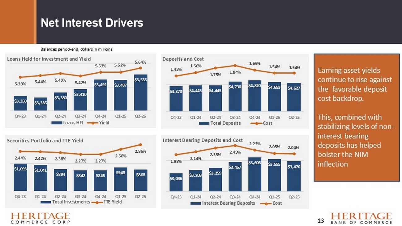 Total Deposits - June 30, 2025 • Total deposits were $4.6 billion, compared to $4.4 billion at June 30, 2024, an increase of 4% • Noninterest bearing deposits represent 25% of total deposits, compared to 27% a year ago • Deposit accounts numbered 23,231 at June 30, 2025, with an average balance of $199,000 Total Deposits: $4,627,334,000 * ICS is Client Reciprocal Insured Cash Sweep; CDARS = Client Reciprocal Certificate of Deposit Account Registry Service Demand, noninterest - bearing 25% Demand, interest - bearing 21% Savings and money market 28% ICS and CDARS * 21% Time 5% Total Cost of Deposits of 1.54% 12 Deposit Costs - 2nd Quarter 2025 Average Average Balance Rate Demand, noninterest-bearing $ 1,146,494 Demand, interest-bearing 949,867 0.63 % Savings and money market 1,313,054 2.51 % Time deposits 243,100 3.37 % ICS/CDARS - NMD and Time 965,492 2.47 % Total interest-bearing 3,471,513 2.04 % Total deposits 4,618,007 1.54 % Net Interest Drivers $3,350 $3,336 $3,380 $3,410 $3,492 $3,487 $3,535 5.39% 5.44% 5.49% 5.42% 5.53% 5.52% 5.64% Q4-23 Q1-24 Q2-24 Q3-24 Q4-24 Q1-25 Q2-25 Loans Held for Investment and Yield Loans HFI Yield $1,093 $1,041 $894 $842 $846 $948 $868 2.44% 2.42% 2.38% 2.27% 2.27% 2.61% 2.85% Q4-23 Q1-24 Q2-24 Q3-24 Q4-24 Q1-25 Q2-25 Securities Portfolio and FTE Yield Total Investments FTE Yield $4,378 $4,445 $4,445 $4,730 $4,820 $4,683 $4,627 1.43% 1.56% 1.75% 1.84% 1.66% 1.54% 1.54% Q4-23 Q1-24 Q2-24 Q3-24 Q4-24 Q1-25 Q2-25 Deposits and Cost Total Deposits Cost $3,086 $3,203 $3,259 $3,457 $3,606 $3,555 $3,476 1.98% 2.14% 2.35% 2.49% 2.23% 2.05% 2.04% Q4-23 Q1-24 Q2-24 Q3-24 Q4-24 Q1-25 Q2-25 Interest Bearing Deposits and Cost Interest Bearing Deposits Cost Balances period - end, dollars in millions 13 Earning asset yields continue to rise against the favorable deposit cost backdrop.