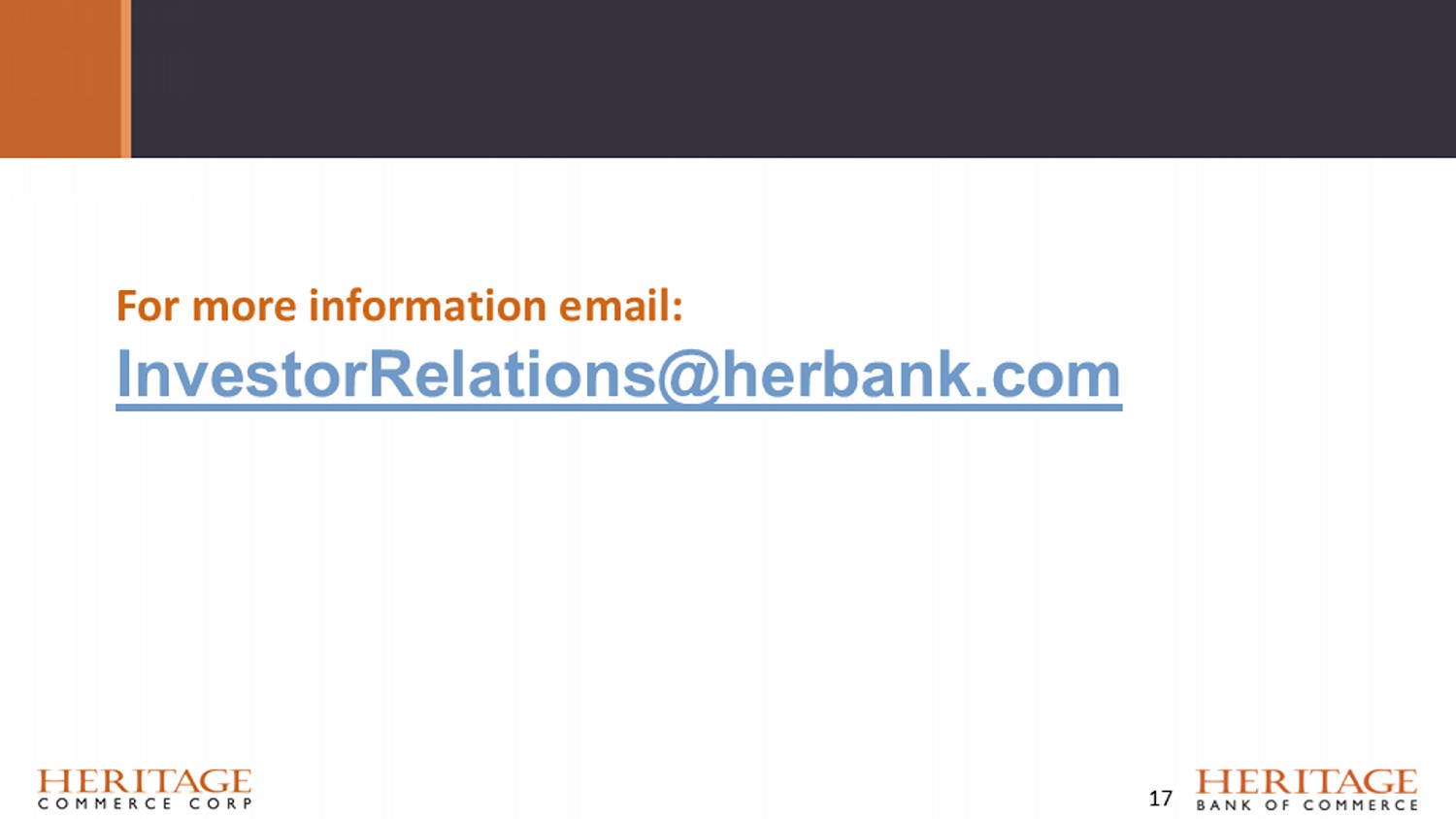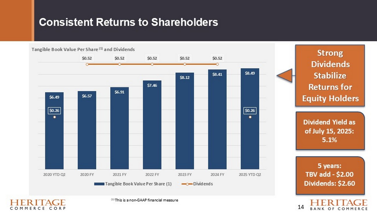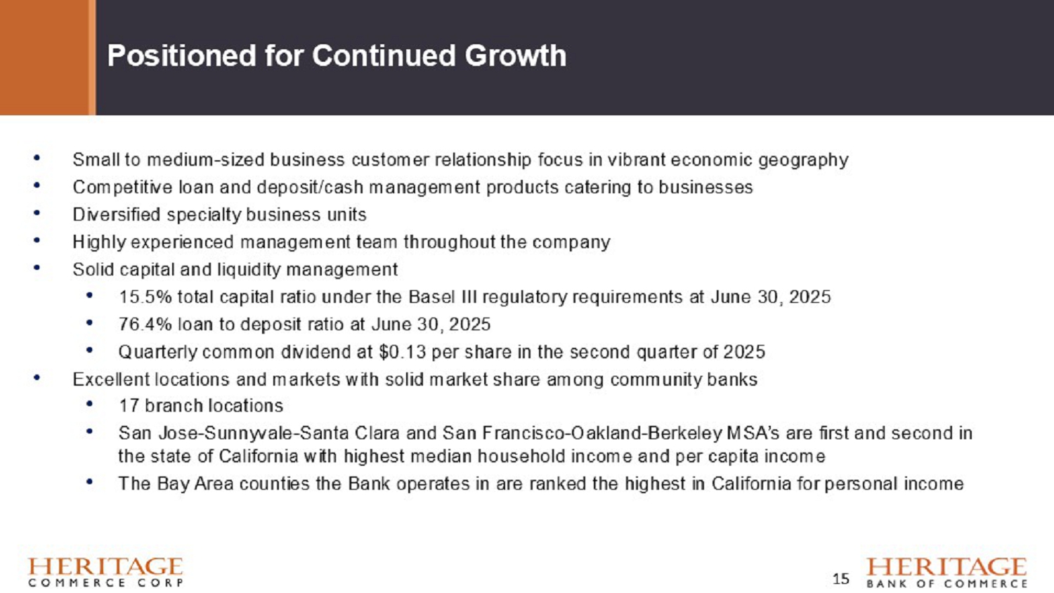This, combined with stabilizing levels of non - interest bearing deposits has helped bolster the NIM inflection Consistent Returns to Shareholders Strong Dividends Stabilize Returns for Equity Holders Dividend Yield as of July 15, 2025: 5.0% $6.49 $6.57 $6.91 $7.46 $8.12 $8.41 $8.49 $0.26 $0.52 $0.52 $0.52 $0.52 $0.52 $0.26 2020 YTD Q2 2020 FY 2021 FY 2022 FY 2023 FY 2024 FY 2025 YTD Q2 Tangible Book Value Per Share (1) and Dividends Tangible Book Value Per Share (1) Dividends 14 (1) This is a non - GAAP financial measure 5 years: TBV add - $2.00 Dividends: $2.60 Positioned for Continued Growth • Small to medium-sized business customer relationship focus in vibrant economic geography • Competitive loan and deposit/cash management products catering to businesses • Diversified specialty business units • Highly experienced management team throughout the company • Solid capital and liquidity management • 15.5% total capital ratio under the Basel III regulatory requirements at June 30, 2025 • 76.4% loan to deposit ratio at June 30, 2025 • Quarterly common dividend at $0.13 per share in the second quarter of 2025 • Excellent locations and markets with solid market share among community banks • 17 branch locations • San Jose-Sunnyvale-Santa Clara and San Francisco-Oakland-Berkeley MSA’s are first and second in the state of California with highest median household income and per capita income • The Bay Area counties the Bank operates in are ranked the highest in California for personal income 15 Long - Term Strategic Goals Drive Operating Leverage to enhance profitability Focus on high - quality loan and deposit growth Scale via organic growth and acquisitions to gain efficiency Grow non - interest income through best - in - class service levels Invest in talent and emerging technology A disciplined and strategic approach to delivering value long - term 16