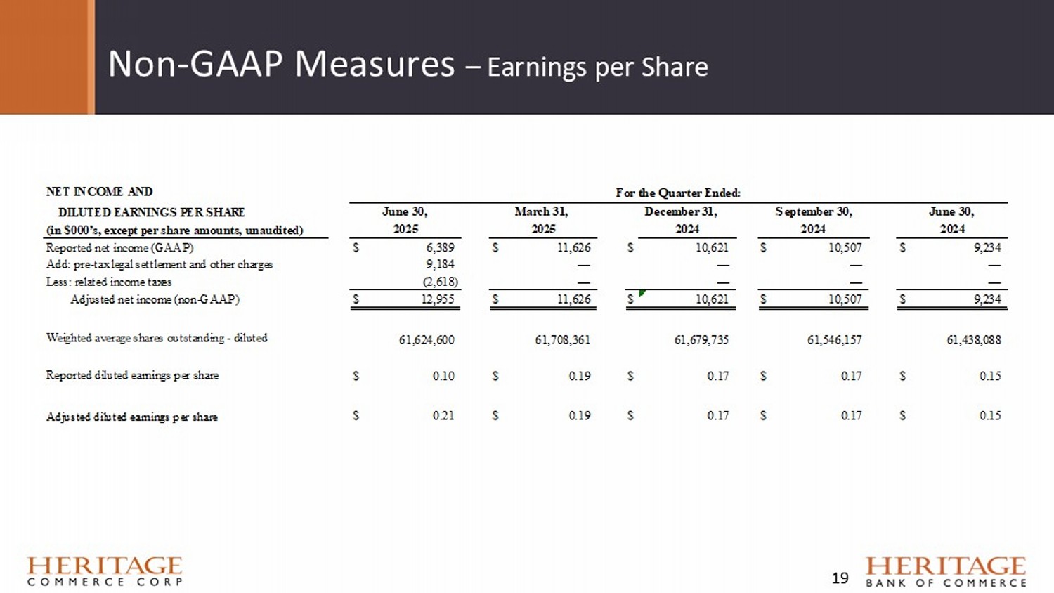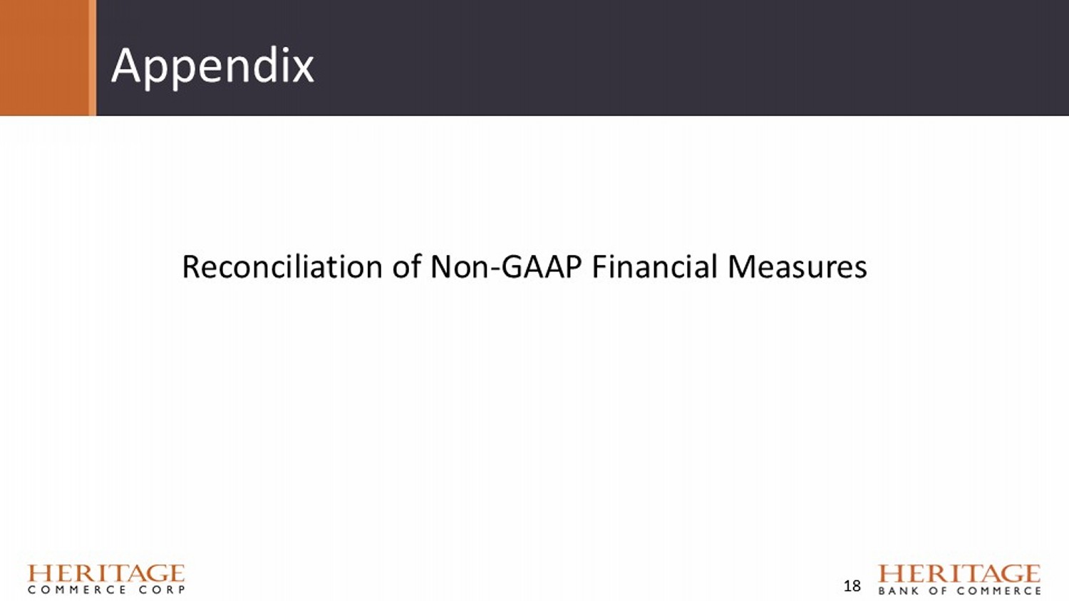 For more information email: InvestorRelations@herbank.com Economic and Demographic data footnotes: (1) HBC ranks second amongst inde pendent community banks headquartered in t he Metropolitan Statistical Area (“MSA”) of San Francisco - Oakland - Fremont, CA and San J ose - Sunnyvale - Santa Clara, CA. Source: S&P Global Market Intelligence as of June 30, 2024. (2) San Francisco Bay Area refers to Alameda, Contra Costa, Marin, San Benito, San Francisco, San Mateo, and Santa Clara counties . S ource: FDIC, Summary of Deposits as of June 30, 20 24 (3) Source: U.S. Bureau of Economic Analysis. Data for the year ended December 31, 2023 (4) Source: U.S. Bureau of Economic Analysis. Data for the year ended December 31, 2023 (5) Source: California Employment Development Department 17 Reconciliation of Non - GAAP Financial Measures Appendix 18
