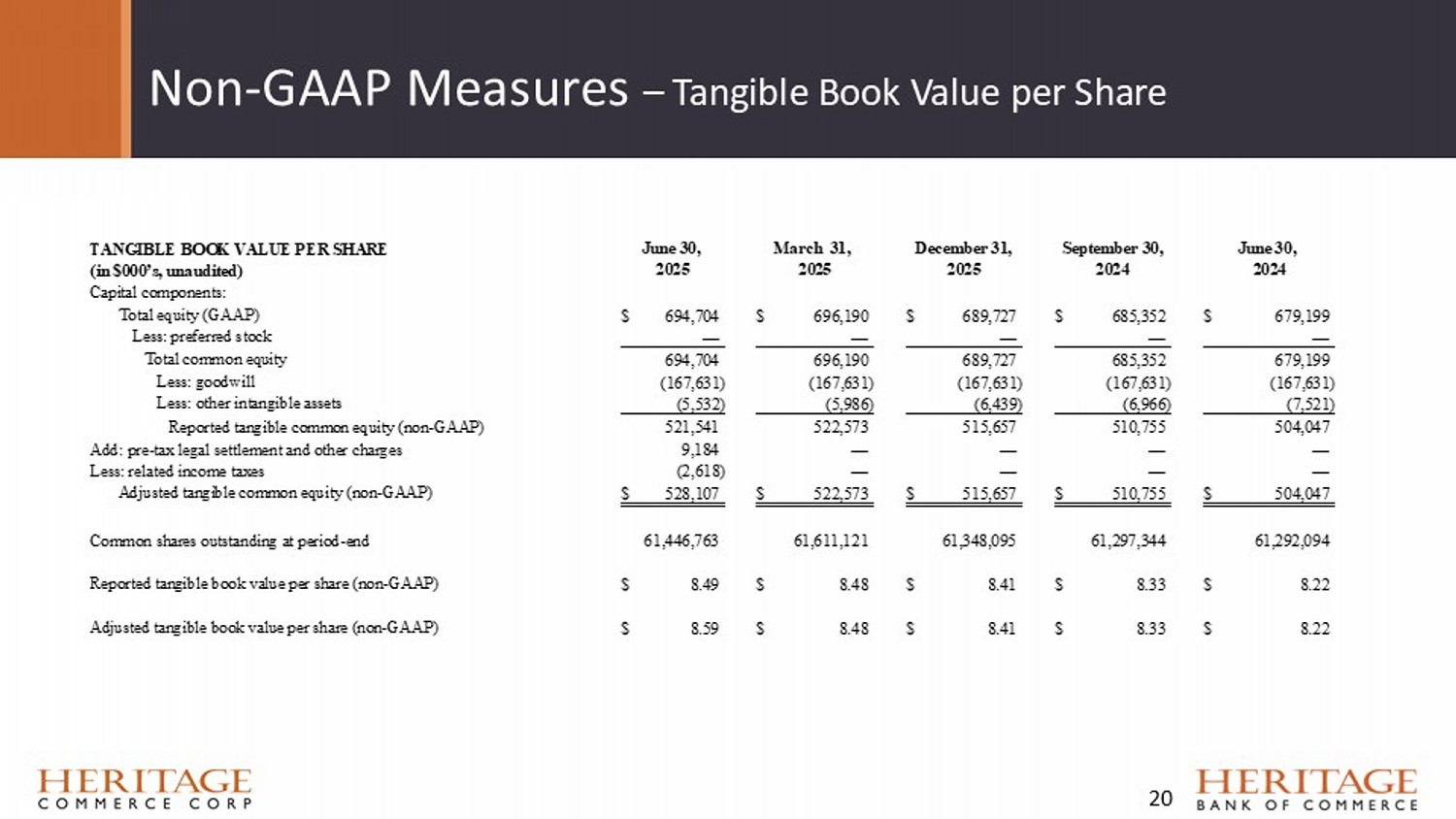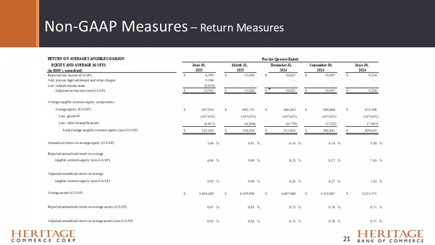 Non - GAAP Measures – Earnings per Share 19 NET INCOME AND DILUTED EARNINGS PER SHARE (in $000’s, except per share amounts, unaudited) 2024 Reported net income (GAAP) $ 6,389 $ 11,626 $ 10,621 $ 10,507 $ 9,234 Add: pre-tax legal settlement and other charges 9,184 — — — — Less: related income taxes (2,618) — — — — Adjusted net income (non-GAAP) $ 12,955 $ 11,626 $ 10,621 $ 10,507 $ 9,234 Weighted average shares outstanding - diluted 61,624,600 61,708,361 61,679,735 61,546,157 61,438,088 Reported diluted earnings per share $ 0.10 $ 0.19 $ 0.17 $ 0.17 $ 0.15 Adjusted diluted earnings per share $ 0.21 $ 0.19 $ 0.17 $ 0.17 $ 0.15 2025 2025 2024 2024 For the Quarter Ended: June 30, March 31, December 31, September 30, June 30, Non - GAAP Measures – Tangible Book Value per Share 20 TANGIBLE BOOK VALUE PER SHARE June 30, March 31, December 31, September 30, June 30, (in $000’s, unaudited) 2025 2025 2025 2024 2024 Capital components: Total equity (GAAP) $ 694,704 $ 696,190 $ 689,727 $ 685,352 $ 679,199 Less: preferred stock — — — — — Total common equity 694,704 696,190 689,727 685,352 679,199 Less: goodwill (167,631) (167,631) (167,631) (167,631) (167,631) Less: other intangible assets (5,532) (5,986) (6,439) (6,966) (7,521) Reported tangible common equity (non -GAAP) 521,541 522,573 515,657 510,755 504,047 Add: pre-tax legal settlement and other charges 9,184 — — — — Less: related income taxes (2,618) — — — — Adjusted tangible common equity (non -GAAP) $ 528,107 $ 522,573 $ 515,657 $ 510,755 $ 504,047 Common shares outstanding at period -end 61,446,763 61,611,121 61,348,095 61,297,344 61,292,094 Reported tangible book value per share (non -GAAP) $ 8.49 $ 8.48 $ 8.41 $ 8.33 $ 8.22 Adjusted tangible book value per share (non -GAAP) $ 8.59 $ 8.48 $ 8.41 $ 8.33 $ 8.22 Non - GAAP Measures – Return Measures 21 RETURN ON AVERAGE TANGIBLE COMMON EQUITY AND AVERAGE ASSETS (in $000’s, unaudited) 2024 Reported net income (GAAP) $ 6,389 $ 11,626 $ 10,621 $ 10,507 $ 9,234 Add: pre-tax legal settlement and other charges 9,184 — — — — Less: related income taxes (2,618) — — — — Adjusted net income (non-GAAP) $ 12,955 $ 11,626 $ 10,621 $ 10,507 $ 9,234 Average tangible common equity components: Average equity (GAAP) $ 697,016 $ 692,733 $ 686,263 $ 680,404 $ 675,108 Less: goodwill (167,631) (167,631) (167,631) (167,631) (167,631) Less: other intangible assets (5,817) (6,264) (6,770) (7,322) (7,867) Total average tangible common equity (non-GAAP) $ 523,568 $ 518,838 $ 511,862 $ 505,451 $ 499,610 Annualized return on average equity (GAAP) 3.68 % 6.81 % 6.16 % 6.14 % 5.50 % Reported annualized return on average tangible common equity (non-GAAP) 4.89 % 9.09 % 8.25 % 8.27 % 7.43 % Adjusted annualized return on average tangible common equity (non-GAAP) 9.92 % 9.09 % 8.25 % 8.27 % 7.43 % Average assets (GAAP) $ 5,458,420 $ 5,559,896 $ 5,607,840 $ 5,352,067 $ 5,213,171 Reported annualized return on average assets (GAAP) 0.47 % 0.85 % 0.75 % 0.78 % 0.71 % Adjusted annualized return on average assets (non-GAAP) 0.95 % 0.85 % 0.75 % 0.78 % 0.71 % September 30, June 30, 2024 2024 For the Quarter Ended: June 30, March 31, December 31, 2025 2025