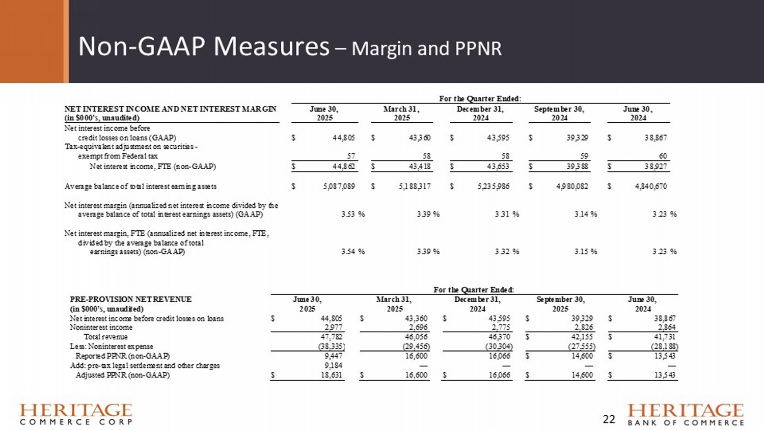 Non - GAAP Measures – Margin and PPNR 22 For the Quarter Ended: NET INTEREST INCOME AND NET INTEREST MARGIN June 30, March 31, December 31, September 30, June 30, (in $000’s, unaudited) 2025 2025 2024 2024 2024 Net interest income before credit losses on loans (GAAP) $ 44,805 $ 43,360 $ 43,595 $ 39,329 $ 38,867 Tax-equivalent adjustment on securities - exempt from Federal tax 57 58 58 59 60 Net interest income, FTE (non-GAAP) $ 44,862 $ 43,418 $ 43,653 $ 39,388 $ 38,927 Average balance of total interest earning assets $ 5,087,089 $ 5,188,317 $ 5,235,986 $ 4,980,082 $ 4,840,670 Net interest margin (annualized net interest income divided by the average balance of total interest earnings assets) (GAAP) 3.53 % 3.39 % 3.31 % 3.14 % 3.23 % Net interest margin, FTE (annualized net interest income, FTE, divided by the average balance of total earnings assets) (non-GAAP) 3.54 % 3.39 % 3.32 % 3.15 % 3.23 % For the Quarter Ended: PRE-PROVISION NET REVENUE June 30, March 31, December 31, September 30, June 30, (in $000’s, unaudited) 2025 2025 2024 2025 2024 Net interest income before credit losses on loans $ 44,805 $ 43,360 $ 43,595 $ 39,329 $ 38,867 Noninterest income 2,977 2,696 2,775 2,826 2,864 Total revenue 47,782 46,056 46,370 $ 42,155 $ 41,731 Less: Noninterest expense (38,335) (29,456) (30,304) (27,555) (28,188) Reported PPNR (non-GAAP) 9,447 16,600 16,066 $ 14,600 $ 13,543 Add: pre-tax legal settlement and other charges 9,184 — — — — Adjusted PPNR (non-GAAP) $ 18,631 $ 16,600 $ 16,066 $ 14,600 $ 13,543