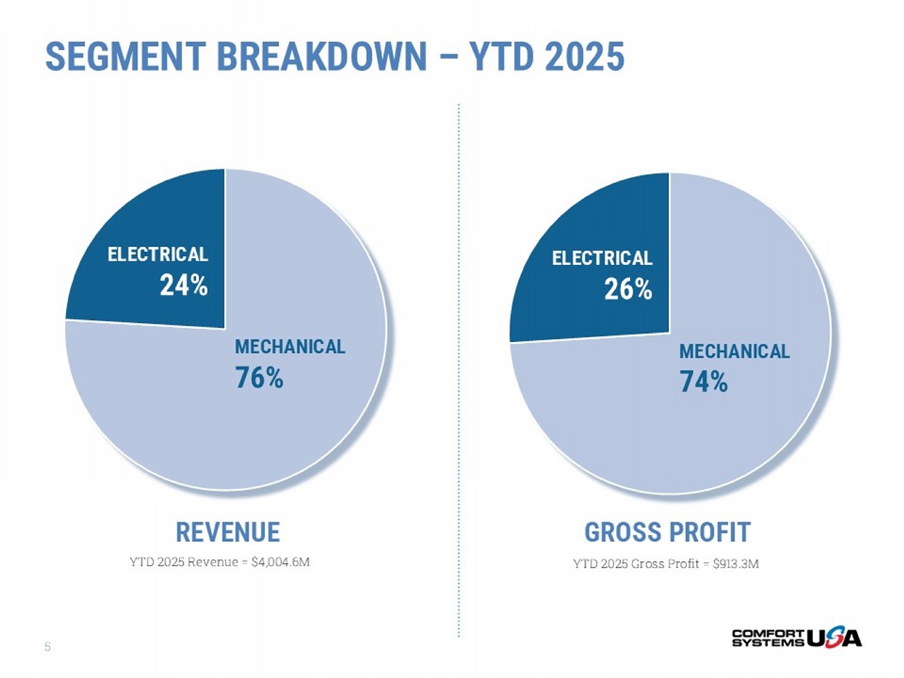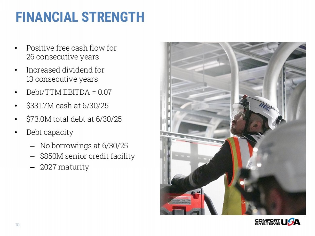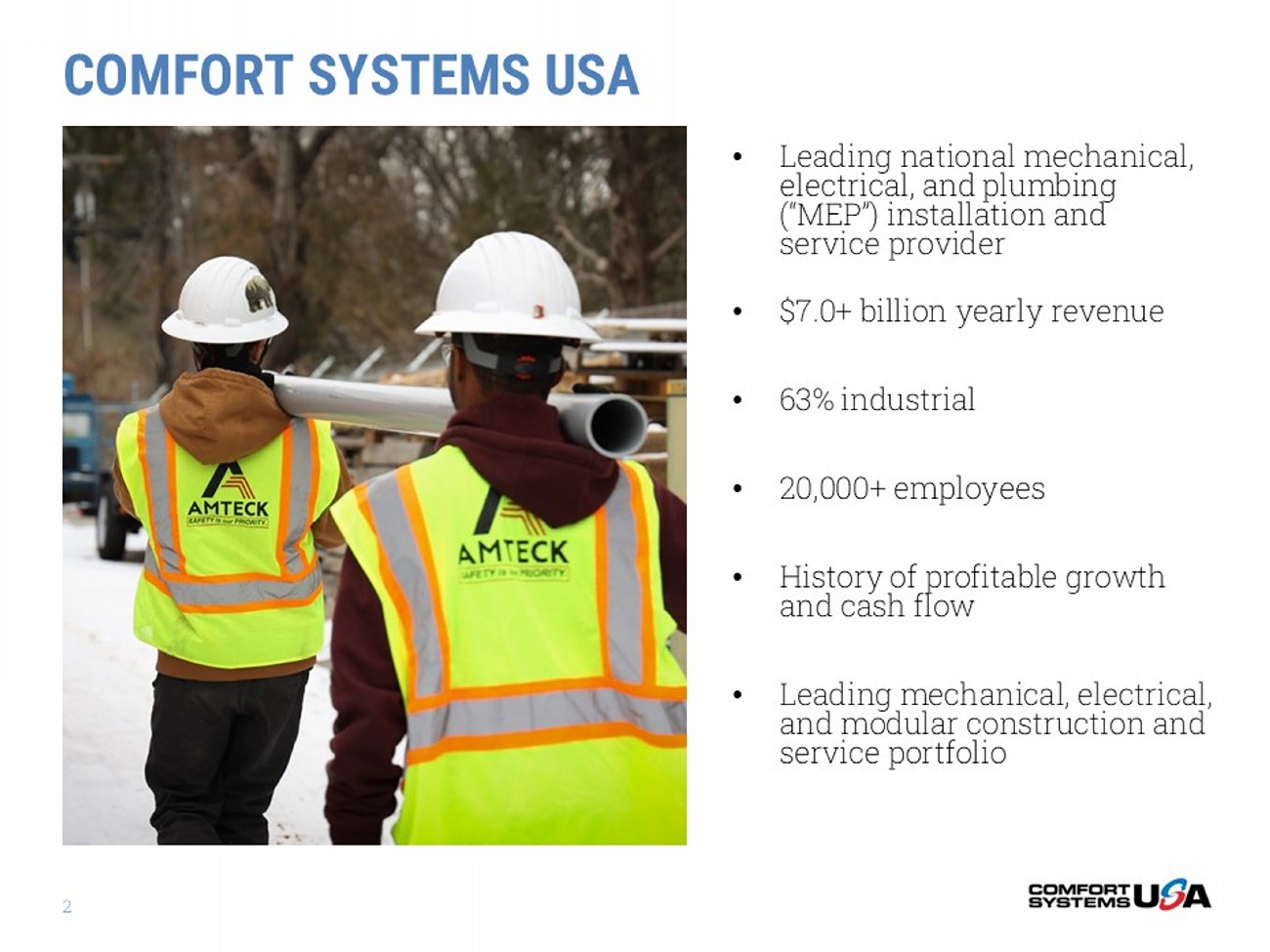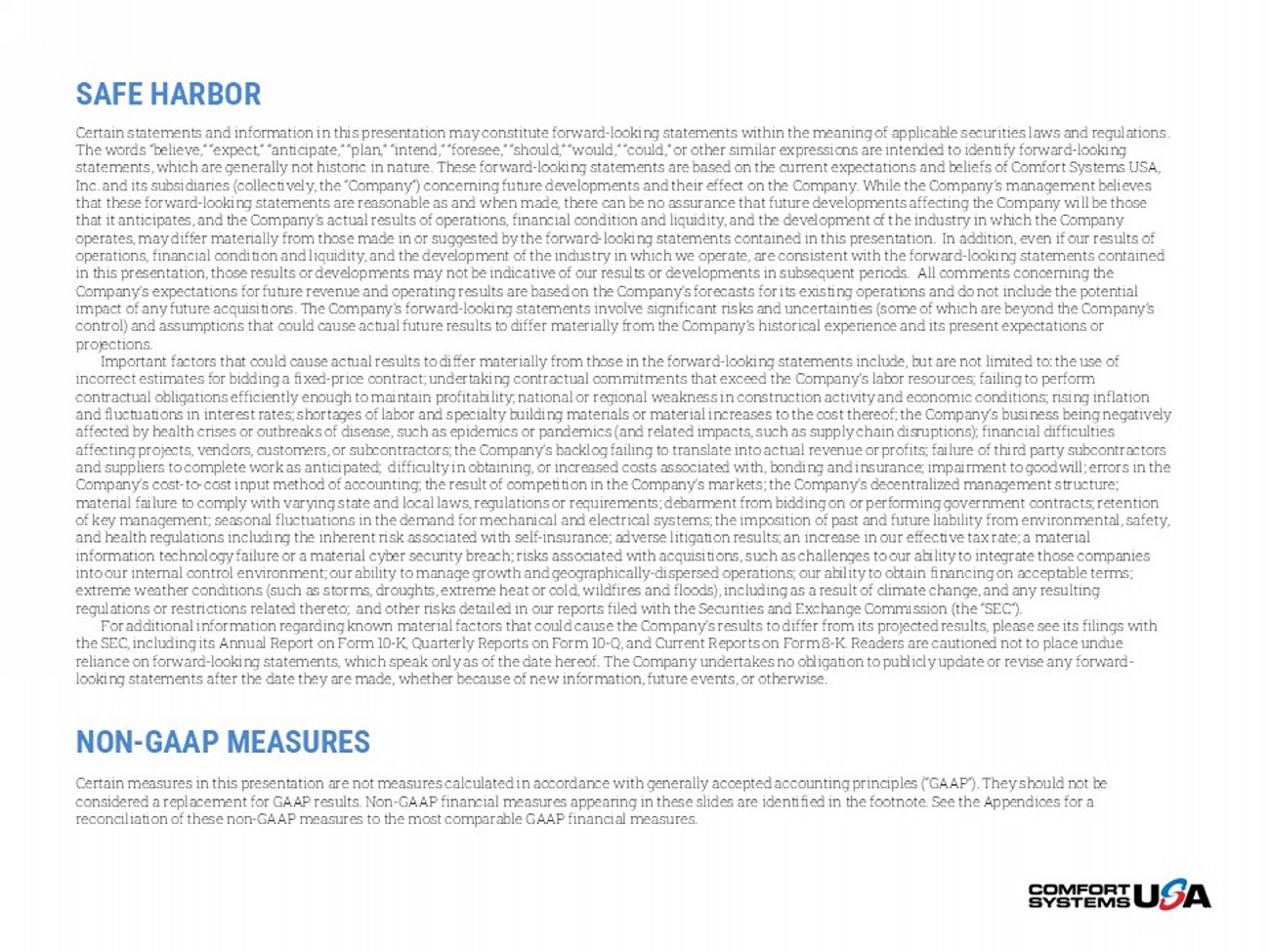 SAFE HARBOR Certain statements and information in this presentation may constitute forward - looking statements within the meaning of applicab le securities laws and regulations. The words “believe,” “expect,” “anticipate,” “plan,” “intend,” “foresee,” “should,” “would,” “could,” or other similar expres sio ns are intended to identify forward - looking statements, which are generally not historic in nature. These forward - looking statements are based on the current expectations a nd beliefs of Comfort Systems USA, Inc. and its subsidiaries (collectively, the “Company”) concerning future developments and their effect on the Company. While th e Company’s management believes that these forward - looking statements are reasonable as and when made, there can be no assurance that future developments affect ing the Company will be those that it anticipates, and the Company’s actual results of operations, financial condition and liquidity, and the development o f t he industry in which the Company operates, may differ materially from those made in or suggested by the forward - looking statements contained in this presentation . In addition, even if our results of operations, financial condition and liquidity, and the development of the industry in which we operate, are consistent with t he forward - looking statements contained in this presentation, those results or developments may not be indicative of our results or developments in subsequent period s. All comments concerning the Company’s expectations for future revenue and operating results are based on the Company’s forecasts for its existing operati ons and do not include the potential impact of any future acquisitions. The Company’s forward - looking statements involve significant risks and uncertainties (some of which are beyond the Company’s control) and assumptions that could cause actual future results to differ materially from the Company’s historical experience an d its present expectations or projections. Important factors that could cause actual results to differ materially from those in the forward - looking statements include, but are not limited to: the use of incorrect estimates for bidding a fixed - price contract; undertaking contractual commitments that exceed the Company’s labor reso urces; failing to perform contractual obligations efficiently enough to maintain profitability; national or regional weakness in construction activity and economic conditions; rising inflation and fluctuations in interest rates; shortages of labor and specialty building materials or material increases to the cost the reo f; the Company’s business being negatively affected by health crises or outbreaks of disease, such as epidemics or pandemics (and related impacts, such as supply chain dis ruptions); financial difficulties affecting projects, vendors, customers, or subcontractors; the Company’s backlog failing to translate into actual revenue or pro fits; failure of third party subcontractors and suppliers to complete work as anticipated; difficulty in obtaining, or increased costs associated with, bonding and insu ran ce; impairment to goodwill; errors in the Company’s cost - to - cost input method of accounting; the result of competition in the Company’s markets; the Company’s decentraliz ed management structure; material failure to comply with varying state and local laws, regulations or requirements; debarment from bidding on or perfo rmi ng government contracts; retention of key management; seasonal fluctuations in the demand for mechanical and electrical systems; the imposition of past and futu re liability from environmental, safety, and health regulations including the inherent risk associated with self - insurance; adverse litigation results; an increase in ou r effective tax rate; a material information technology failure or a material cyber security breach; risks associated with acquisitions, such as challenges to ou r ability to integrate those companies into our internal control environment; our ability to manage growth and geographically - dispersed operations; our ability to obta in financing on acceptable terms; extreme weather conditions (such as storms, droughts, extreme heat or cold, wildfires and floods), including as a result of c lim ate change, and any resulting regulations or restrictions related thereto; and other risks detailed in our reports filed with the Securities and Exchange Com mission (the “SEC”). For additional information regarding known material factors that could cause the Company’s results to differ from its project ed results, please see its filings with the SEC, including its Annual Report on Form 10 - K, Quarterly Reports on Form 10 - Q, and Current Reports on Form 8 - K. Readers are cautioned not to place undue reliance on forward - looking statements, which speak only as of the date hereof. The Company undertakes no obligation to publicly update or revise any forward - looking statements after the date they are made, whether because of new information, future events, or otherwise. NON - GAAP MEASURES Certain measures in this presentation are not measures calculated in accordance with generally accepted accounting principles (“ GAAP”). They should not be considered a replacement for GAAP results. Non - GAAP financial measures appearing in these slides are identified in the footnote. See the Appendices for a reconciliation of these non - GAAP measures to the most comparable GAAP financial measures.