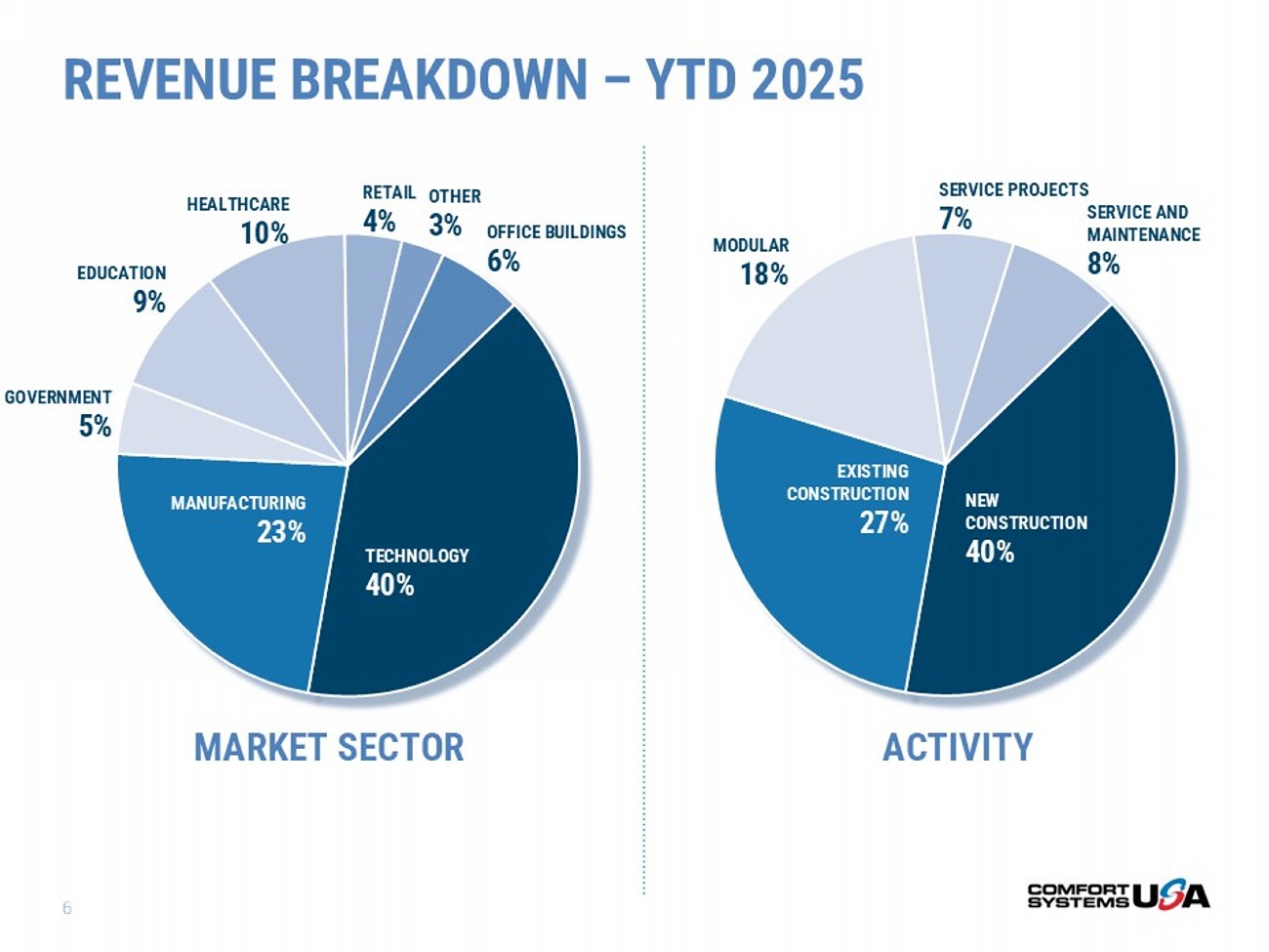 MARKET OUTLOOK 4 STRONG MARKETS • Technology – Data Centers and Chip Manufacturing • Life Sciences – Pharmaceuticals • Food Processing • Manufacturing • Healthcare • Energy Storage TRENDS • Technology • On - Shoring • Modular • Service 5 REVENUE GROSS PROFIT YTD 2025 Gross Profit = $913.3M YTD 2025 Revenue = $4,004.6M SEGMENT BREAKDOWN – YTD 2025 MECHANICAL 76% ELECTRICAL 24% MECHANICAL 74% ELECTRICAL 26%