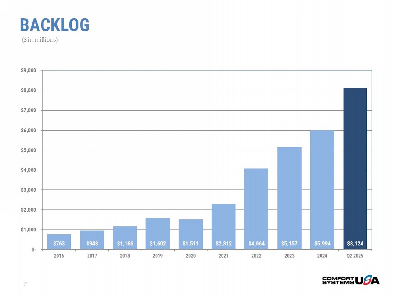 6 MARKET SECTOR ACTIVITY REVENUE BREAKDOWN – YTD 2025 TECHNOLOGY 40% MANUFACTURING 23% GOVERNMENT 5% EDUCATION 9% HEALTHCARE 10% RETAIL 4% OTHER 3% OFFICE BUILDINGS 6% NEW CONSTRUCTION 40% EXISTING CONSTRUCTION 27% MODULAR 18% SERVICE PROJECTS 7% SERVICE AND MAINTENANCE 8% BACKLOG 7 $763 $948 $1,166 $1,602 $1,511 $2,312 $4,064 $5,157 $5,994 $8,124 $- $1,000 $2,000 $3,000 $4,000 $5,000 $6,000 $7,000 $8,000 $9,000 2016 2017 2018 2019 2020 2021 2022 2023 2024 Q2 2025 ($ in millions)