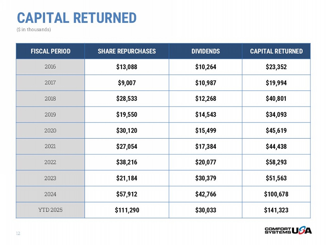 RECENT FINANCIAL PERFORMANCE FINANCIAL STRENGTH • Positive free cash flow for 26 consecutive years • Increased dividend for 13 consecutive years • Debt/TTM EBITDA = 0.07 • $331.7M cash at 6/30/25 • $73.0M total debt at 6/30/25 • Debt capacity – No borrowings at 6/30/25 – $850M senior credit facility – 2027 maturity 10 11 $93,906 75% $18,176 14% $13,496 11% AVERAGE 2007 - 2024 Acquisitions Share Repurchases Dividends CAPITAL ALLOCATION ($ in thousands)
