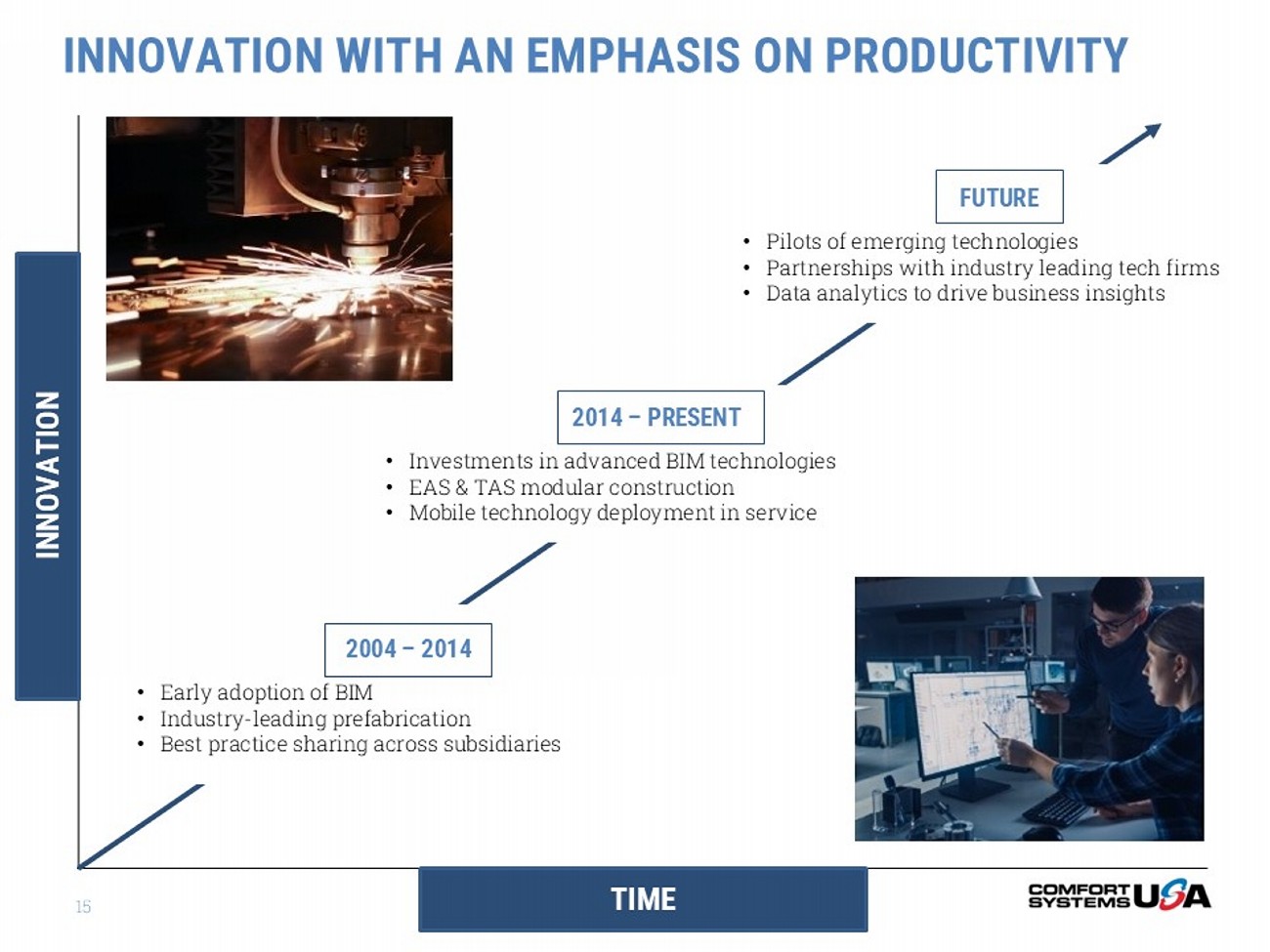 Foster a safe, collaborative, and inclusive environment for our employees • Recently launched a Talent Advisory Group, consisting of a broad group of internal stakeholders to ensure the Company continually takes meaningful steps to remain an inclusive place of business. • 100% of operational sites have conducted an employee health and safety risk assessment and utilize the CAUSE Mapping program and the “5x5” initiative. • As part of our commitment to employee health and well - being, Comfort Systems USA offers all employees and family members in their household access to 24/7 support for confidential emotional support, work - life solutions, legal guidance, financial resources, and suicide prevention. Our sustainability goals are embedded in how we operate as a business – they are part of our very foundation and core values of being safe, honest, respectful, collaborative, and innovative – and we have diligently sought to develop transparent disclosures to su pport our sustainability commitments. As a company, we recognize that while our work lends itself to sustainable best practices, th ere is more we can do to create a positive impact. We are committed to a continual improvement approach to sustainability. PEOPLE PARTNERS PLANET Be reliable, honest, and innovative partners to our customers and suppliers • 100% of all operational sites have completed an internal audit/risk assessment concerning business ethics issues. • Bronze EcoVadis Sustainability Rating achieved in 2024. • Best in - class cybersecurity program. • We report under the GRI, SASB, and IFRS Sustainability Disclosure Standards and are a signatory to the UN Global Compact. • Developed a Supplier Diversity Program and launched a Supplier Code of Conduct in 2021. • Developed and implemented a Human Rights Policy in 2022. Operate with the intention to positively impact the environment through our work and the services we provide to our customers • Comfort Systems USA has completed a Greenhouse Gas ("GHG") Inventory covering all relevant Scope 1 and 2 emissions across our operations since 2021, facilitating a deeper analysis and comparative data in our 2024 Sustainability Report. • In 2024, we conducted a Scope 3 emissions readiness assessment. • In April 2025, we announced a target to reduce Scope 1 and 2 emissions on an intensity basis by 35% by 2035, using a 2023 baseline. • To meet our reduction goals, we’re conducting energy efficiency audits at opcos and have kicked off an electric vehicle pilot program. Energy Efficiency GHG Emissions Data Privacy/ Cybersecurity Risk Management Employee Hiring and Retention Training and Development Worker Health and Safety Diversity, Equity, and Inclusion Material Topics Material Topics Material Topics SUSTAINABILITY OVERVIEW 14 TIME INNOVATION INNOVATION WITH AN EMPHASIS ON PRODUCTIVITY 2004 – 2014 • Early adoption of BIM • Industry - leading prefabrication • Best practice sharing across subsidiaries 2014 – PRESENT • Investments in advanced BIM technologies • EAS & TAS modular construction • Mobile technology deployment in service FUTURE • Pilots of emerging technologies • Partnerships with industry leading tech firms • Data analytics to drive business insights 15