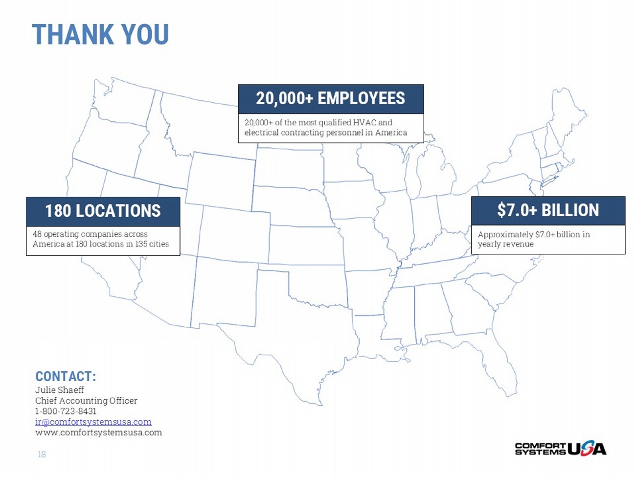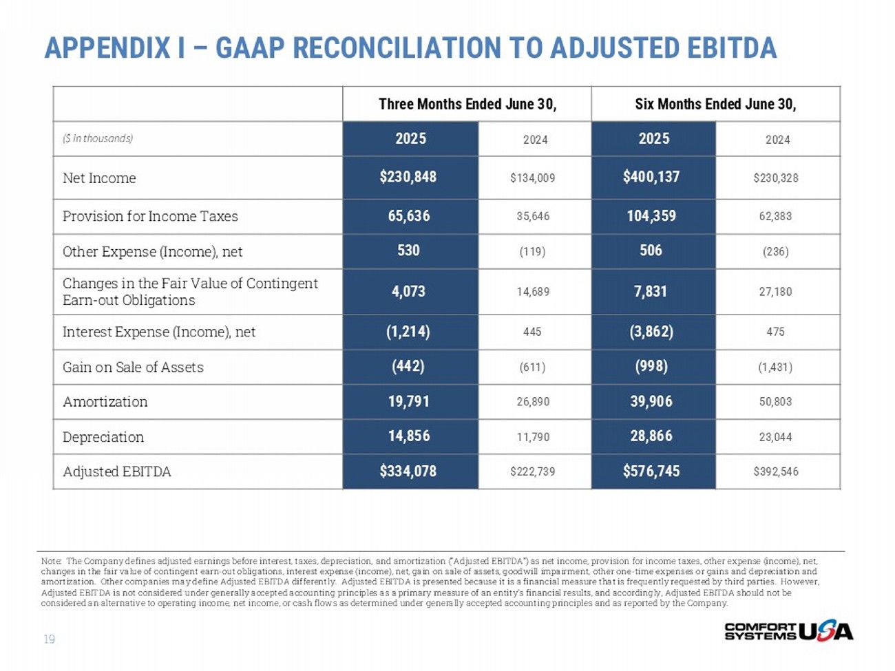 THANK YOU 18 180 LOCATIONS 48 operating companies across America at 180 locations in 135 cities 20,000+ of the most qualified HVAC and electrical contracting personnel in America 20,000+ EMPLOYEES $7.0+ BILLION Approximately $7.0+ billion in yearly revenue CONTACT: Julie Shaeff Chief Accounting Officer 1 - 800 - 723 - 8431 ir@comfortsystemsusa.com www.comfortsystemsusa.com APPENDIX I – GAAP RECONCILIATION TO ADJUSTED EBITDA 19 Six Months Ended June 30, Three Months Ended June 30, 2024 2025 2024 2025 ($ in thousands) $230,328 $400,137 $134,009 $230,848 Net Income 62,383 104,359 35,646 65,636 Provision for Income Taxes (236) 506 (119) 530 Other Expense (Income), net 27,180 7,831 14,689 4,073 Changes in the Fair Value of Contingent Earn - out Obligations 475 (3,862) 445 (1,214) Interest Expense (Income), net (1,431) (998) (611) (442) Gain on Sale of Assets 50,803 39,906 26,890 19,791 Amortization 23,044 28,866 11,790 14,856 Depreciation $392,546 $576,745 $222,739 $334,078 Adjusted EBITDA Note: The Company defines adjusted earnings before interest, taxes, depreciation, and amortization (“Adjusted EBITDA”) as ne t i ncome, provision for income taxes, other expense (income), net, changes in the fair value of contingent earn - out obligations, interest expense (income), net, gain on sale of assets, goodwill i mpairment, other one - time expenses or gains and depreciation and amortization. Other companies may define Adjusted EBITDA differently. Adjusted EBITDA is presented because it is a financia l m easure that is frequently requested by third parties. However, Adjusted EBITDA is not considered under generally accepted accounting principles as a primary measure of an entity’s financia l r esults, and accordingly, Adjusted EBITDA should not be considered an alternative to operating income, net income, or cash flows as determined under generally accepted accounting pr inc iples and as reported by the Company.