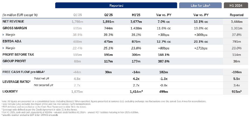 Revenues for the first half of the year grew by 7.0% cc to EUR 3,677 million, driven by the performance of the Biopharma business, which increased by 8.2% cc. Adjusted EBITDA reached EUR 876 million, up by 12.7% cc year-over-year, representing a 23.8% margin, supported by product mix, continuous improvement initiatives and operational leverage. Net profit surged to EUR 177 million, reflecting a 387.6% increase compared to the same period of 2024.