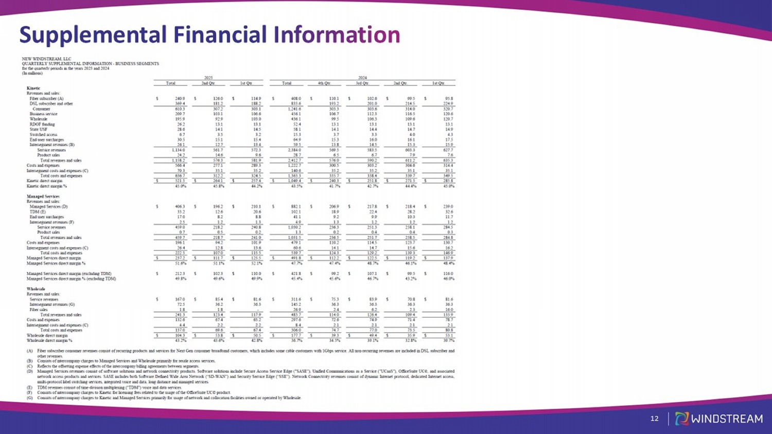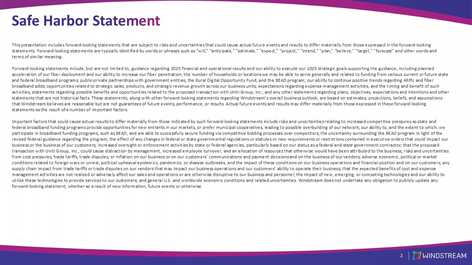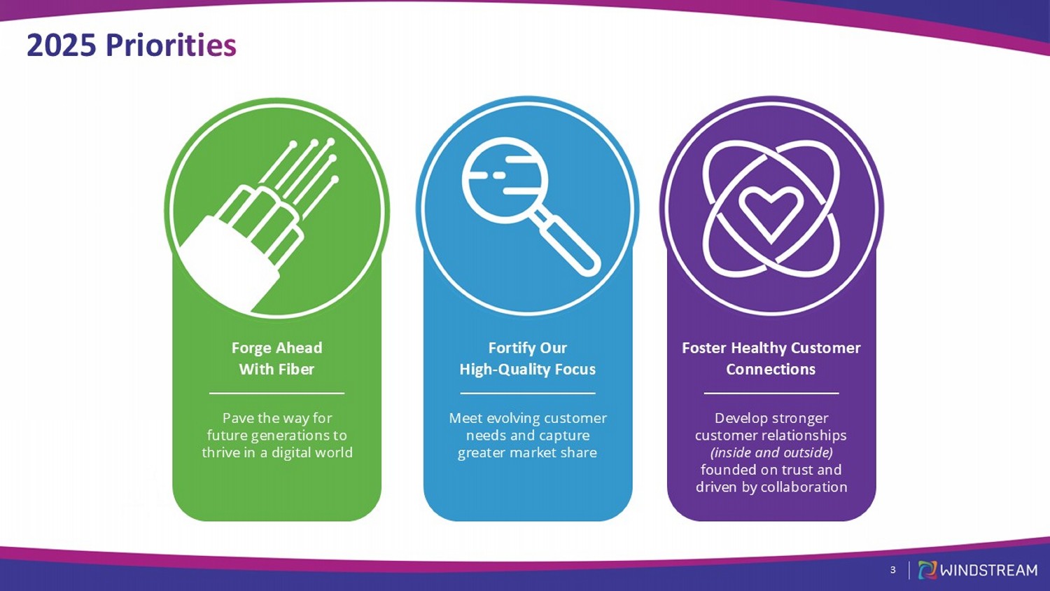 2 This presentation includes forward - looking statements that are subject to risks and uncertainties that could cause actual future events and results to differ materially from those expressed in the forward - looking statements. Forward - looking statements are typically identified by words or phrases such as “will,” “anticipate,” “estimate,” “e xpect,” “project,” “intend,” “plan,” “believe,” “target,” “forecast” and other words and terms of similar meaning. Forward - looking statements include, but are not limited to, guidance regarding 2025 financial and operational results and our ab ility to execute our 2025 strategic goals supporting the guidance, including planned acceleration of our fiber deployment and our ability to increase our fiber penetration; the number of households or locations we may be able to serve generally and related to funding from various current or future state and federal broadband programs, public - private partnerships with government entities, the Rural Digital Opportunity Fund, and th e BEAD program; our ability to continue positive trends regarding ARPU and fiber broadband adds; opportunities related to strategic sales, products, and strategic revenue growth across our business units; e xpe ctations regarding expense management activities, and the timing and benefit of such activities; statements regarding possible benefits and opportunities related to the proposed transaction with Uniti Group, In c.; and any other statements regarding plans, objectives, expectations and intentions and other statements that are not historical facts. These statements, along with other forward - looking statements regarding Windstream’s o verall business outlook, are based on estimates, projections, beliefs, and assumptions that Windstream believes are reasonable but are not guarantees of future events, performance, or results. Actual future event s a nd results may differ materially from those expressed in these forward - looking statements as the result of a number of important factors. Important factors that could cause actual results to differ materially from those indicated by such forward - looking statements i nclude risks and uncertainties relating to increased competitive pressures as state and federal broadband funding programs provide opportunities for new entrants in our markets, or prefer municipal cooperatives, leading to possible overbuilding of our network; our ability to, and the extent to which, we participate in broadband funding programs, such as BEAD, and are able to successfully secure funding via competitive bidding pro cesses over competitors; the uncertainty surrounding the BEAD program in light of the revised federal guidance regarding the program; the effect of any changes in federal or state governmental regulations or sta tut es or new requirements or restrictions contained in executive orders that could impact our business or the business of our customers; increased oversight or enforcement activities by state or federal agencies, partic ula rly based on our status as a federal and state government contractor; that the proposed transaction with Uniti Group, Inc., could cause distraction by management, increased employee turnover, and an allocation of res ources that otherwise would have been attributed to the business; risks and uncertainties from cost pressures, trade tariffs, trade disputes, or inflation on our business or on our customers’ communications and paym ent decisions and on the business of our vendors; adverse economic, political or market conditions related to foreign wars or unrest, political upheaval epidemics, pandemics, or disease outbreaks, and the impact o f t hese conditions on our business operations and financial position and on our customers; any supply chain impact from trade tariffs or trade disputes on our vendors that may impact our business operations and our custo mer s’ ability to operate their business; that the expected benefits of cost and expense management activities are not realized or adversely affect our sales and operations or are otherwise disruptive to our busine ss and personnel; the impact of new, emerging, or competing technologies and our ability to utilize these technologies to provide services to our customers; and general U.S. and worldwide economic conditions and relat ed uncertainties. Windstream does not undertake any obligation to publicly update any forward - looking statement, whether as a result of new information, future events or otherwise.