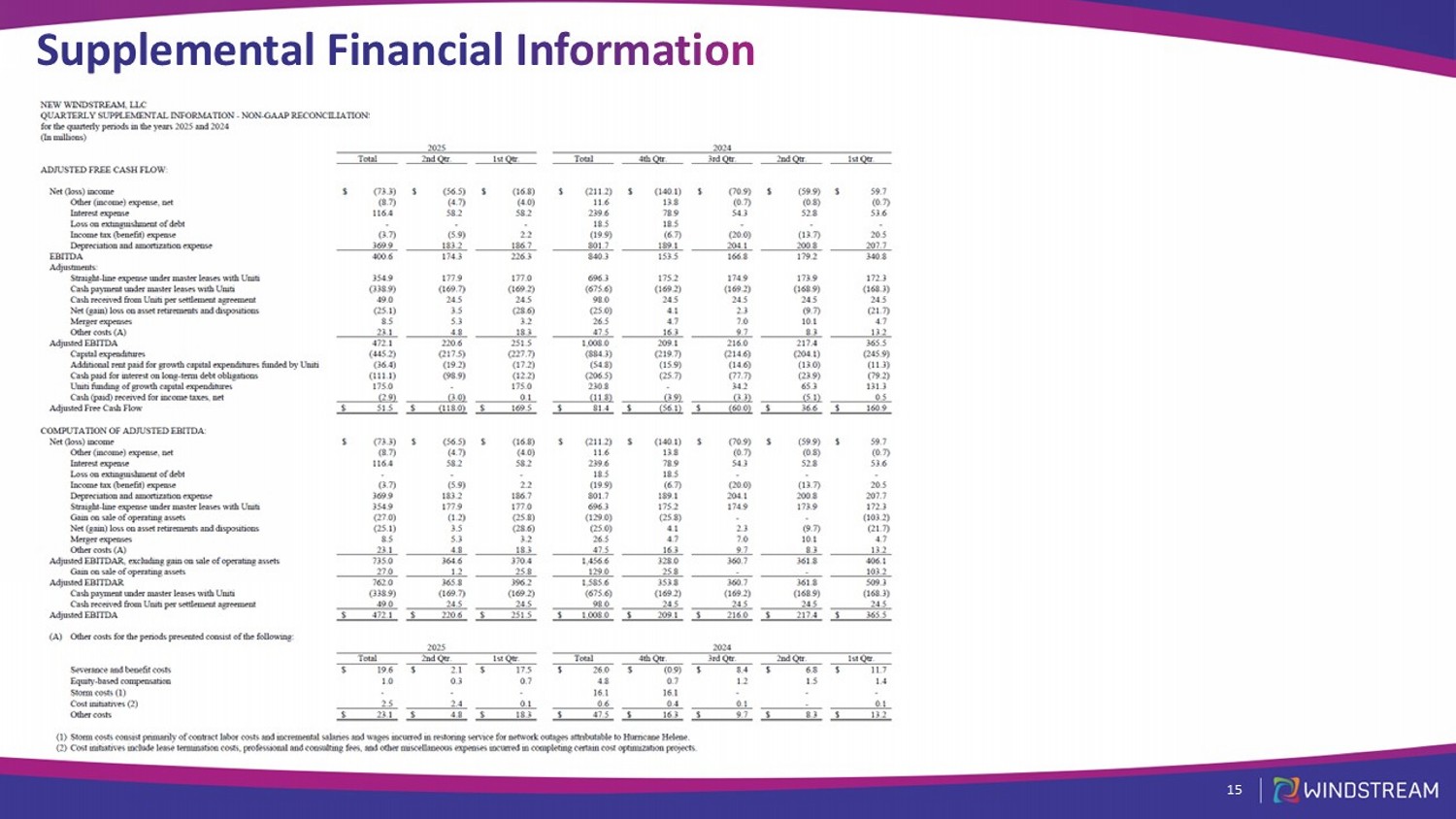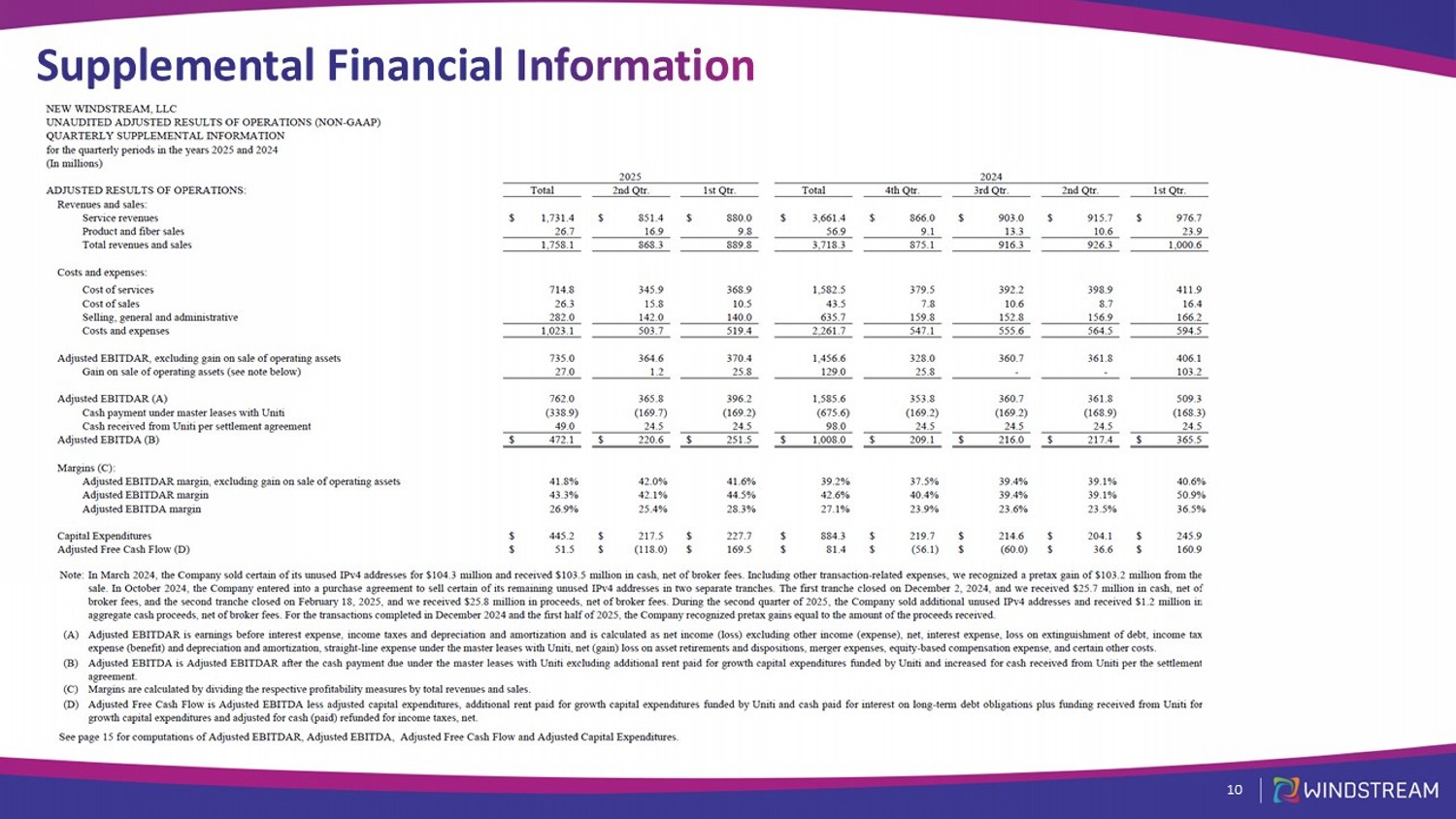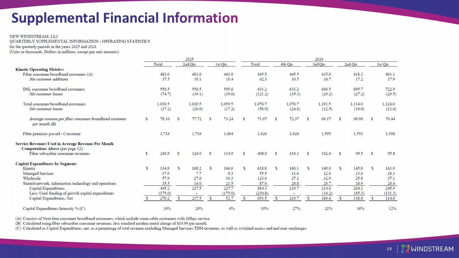 2 This presentation includes forward - looking statements that are subject to risks and uncertainties that could cause actual future events and results to differ materially from those expressed in the forward - looking statements. Forward - looking statements are typically identified by words or phrases such as “will,” “anticipate,” “estimate,” “e xpect,” “project,” “intend,” “plan,” “believe,” “target,” “forecast” and other words and terms of similar meaning. Forward - looking statements include, but are not limited to, guidance regarding 2025 financial and operational results and our ab ility to execute our 2025 strategic goals supporting the guidance, including planned acceleration of our fiber deployment and our ability to increase our fiber penetration; the number of households or locations we may be able to serve generally and related to funding from various current or future state and federal broadband programs, public - private partnerships with government entities, the Rural Digital Opportunity Fund, and th e BEAD program; our ability to continue positive trends regarding ARPU and fiber broadband adds; opportunities related to strategic sales, products, and strategic revenue growth across our business units; e xpe ctations regarding expense management activities, and the timing and benefit of such activities; statements regarding possible benefits and opportunities related to the proposed transaction with Uniti Group, In c.; and any other statements regarding plans, objectives, expectations and intentions and other statements that are not historical facts. These statements, along with other forward - looking statements regarding Windstream’s o verall business outlook, are based on estimates, projections, beliefs, and assumptions that Windstream believes are reasonable but are not guarantees of future events, performance, or results. Actual future event s a nd results may differ materially from those expressed in these forward - looking statements as the result of a number of important factors. Important factors that could cause actual results to differ materially from those indicated by such forward - looking statements i nclude risks and uncertainties relating to increased competitive pressures as state and federal broadband funding programs provide opportunities for new entrants in our markets, or prefer municipal cooperatives, leading to possible overbuilding of our network; our ability to, and the extent to which, we participate in broadband funding programs, such as BEAD, and are able to successfully secure funding via competitive bidding pro cesses over competitors; the uncertainty surrounding the BEAD program in light of the revised federal guidance regarding the program; the effect of any changes in federal or state governmental regulations or sta tut es or new requirements or restrictions contained in executive orders that could impact our business or the business of our customers; increased oversight or enforcement activities by state or federal agencies, partic ula rly based on our status as a federal and state government contractor; that the proposed transaction with Uniti Group, Inc., could cause distraction by management, increased employee turnover, and an allocation of res ources that otherwise would have been attributed to the business; risks and uncertainties from cost pressures, trade tariffs, trade disputes, or inflation on our business or on our customers’ communications and paym ent decisions and on the business of our vendors; adverse economic, political or market conditions related to foreign wars or unrest, political upheaval epidemics, pandemics, or disease outbreaks, and the impact o f t hese conditions on our business operations and financial position and on our customers; any supply chain impact from trade tariffs or trade disputes on our vendors that may impact our business operations and our custo mer s’ ability to operate their business; that the expected benefits of cost and expense management activities are not realized or adversely affect our sales and operations or are otherwise disruptive to our busine ss and personnel; the impact of new, emerging, or competing technologies and our ability to utilize these technologies to provide services to our customers; and general U.S. and worldwide economic conditions and relat ed uncertainties. Windstream does not undertake any obligation to publicly update any forward - looking statement, whether as a result of new information, future events or otherwise.