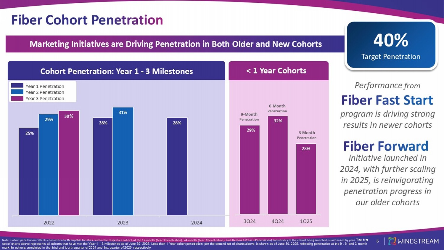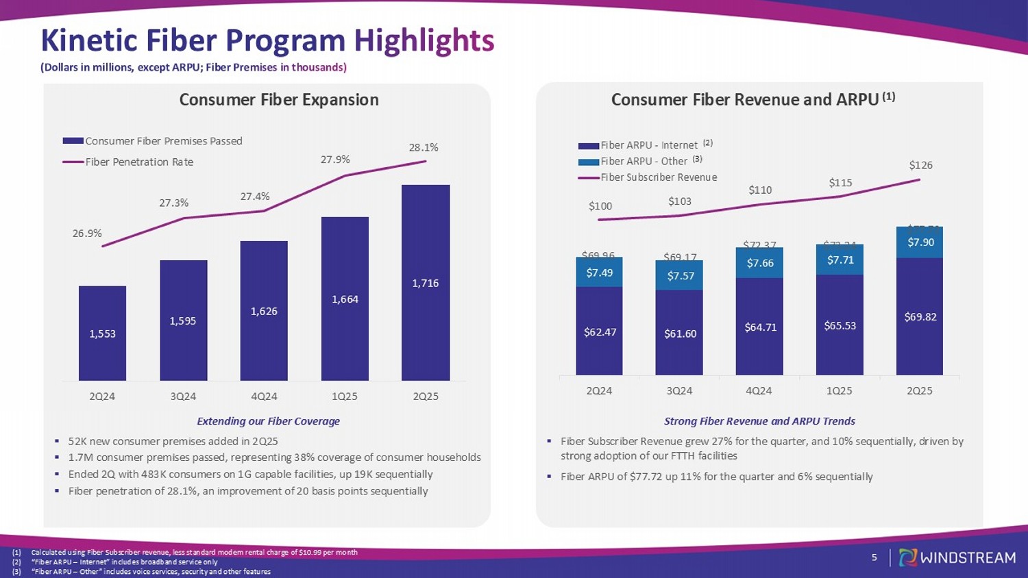 3 Be the PREMIER broadband provider Be the INNOVATIVE wholesale leader OPERATIONS & SUPPORT Be the unwavering foundation that aligns, nurtures and enables us to be our best Focus o diversity and inclusion Forge Ahead With Fiber Fortify Our High - Quality Focus Foster Healthy Customer Connections Pave the way for future generations to thrive in a digital world Meet evolving customer needs and capture greater market share Develop stronger customer relationships (inside and outside) founded on trust and driven by collaboration 4 ▪ Continued progress towards planned Uniti merger, with close expected on or around August 1, 2025 ▪ Completed sales of IPv4 assets for $27M year to date ($156M over last 6 quarters) ▪ Achieved Adjusted EBITDAR (1) of $365M , up 1% y - o - y ▪ Consumer fiber expansion continued with 52K new premises constructed during the quarter, bringing fiber coverage to over 38% of our Kinetic markets ▪ Grew Fiber Subscribers by 15% y - o - y, resulting in fiber penetration of 28% ▪ Fiber Subscriber Revenue growth of 27 % y - o - y, with Fiber ARPU up 11% y - o - y ▪ Generated solid Wholesale strategic revenue performance highlighted by high demand from carriers, content providers and hyperscalers ▪ Continued execution of our Managed Services optimization strategy, which is shifting away from legacy TDM revenues and narrowing focus to emphasize profitability for the valuable base of Managed Services customers (1) Adjusted EBITDAR excluding gain on sale of IPv4 assets & 5 Consumer Fiber Expansion Extending our Fiber Coverage ▪ 52K new consumer premises added in 2Q25 ▪ 1.7M consumer premises passed, representing 38% coverage of consumer households ▪ Ended 2Q with 483K consumers on 1G capable facilities, up 19K sequentially ▪ Fiber penetration of 28.1%, an improvement of 20 basis points sequentially Consumer Fiber Revenue and ARPU (1) 1,553 1,595 1,626 1,664 1,716 26.9% 27.3% 27.4% 27.9% 28.1% 2Q24 3Q24 4Q24 1Q25 2Q25 Consumer Fiber Premises Passed Fiber Penetration Rate Strong Fiber Revenue and ARPU Trends ▪ Fiber Subscriber Revenue grew 27% for the quarter, and 10% sequentially, driven by strong adoption of our FTTH facilities ▪ Fiber ARPU of $77.72 up 11% for the quarter and 6% sequentially (1) Calculated using Fiber Subscriber revenue, less standard modem rental charge of $10.99 per month (2) “Fiber ARPU – Internet” includes broadband service only (3) “Fiber ARPU – Other” includes voice services, security and other features $62.47 $61.60 $64.71 $65.53 $69.82 $7.49 $7.57 $7.66 $7.71 $7.90 $100 $103 $110 $115 $126 2Q24 3Q24 4Q24 1Q25 2Q25 Fiber ARPU - Internet Fiber ARPU - Other Fiber Subscriber Revenue $69.96 $69.17 $72.37 $73.24 $77.72 (3) (2)