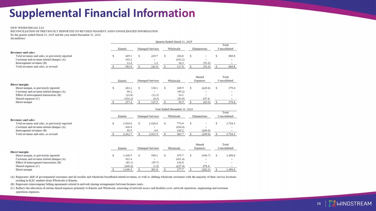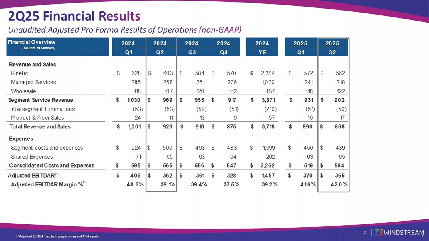 25% 28% 28% 29% 31% 30% 2022 2023 2024 Marketing Initiatives are Driving Penetration in Both Older and New Cohorts Note: Cohort penetration reflects consumers on 1G capable facilities, within the respective cohort, at the 12 - month (Year 1 Pene tration), 24 - month (Year 2 Penetration), and 36 - month (Year 3 Penetration) anniversary of the cohort being launched, summarized by year. The first set of charts above represents all cohorts that have met the Year 1 – 3 milestones as of June 30, 2025. Less than 1 Year cohort penetration, per the second set of charts above, is shown as of June 30, 2025, reflecting penetration at the 9 - , 6 - and 3 - month mark for cohorts completed in the third and fourth quarter of 2024 and first quarter of 2025, respectively Cohort Penetration: Year 1 - 3 Milestones 6 Year 1 Penetration Year 2 Penetration Year 3 Penetration 40% Target Penetration Performance from program is driving strong results in newer cohorts initiative launched in 2024, with further scaling in 2025, is reinvigorating penetration progress in our older cohorts 29% 32% 23% 3Q24 4Q24 1Q25 3 - Month Penetration 6 - Month Penetration 9 - Month Penetration < 1 Year Cohorts Financial Overview 2024 2024 2024 2024 2024 2025 2025 Q1 Q2 Q3 Q4 YE Q1 Q2 Revenue and Sales Kinetic 628$ 603$ 584$ 570$ 2,384$ 572$ 562$ Managed Services 285 258 251 236 1,030 241 218 Wholesale 118 107 120 112 457 118 122 Segment Service Revenue 1,030$ 969$ 955$ 917$ 3,871$ 931$ 902$ Intersegment Eliminations (53) (53) (52) (51) (210) (51) (50) Product & Fiber Sales 24 11 13 9 57 10 17 Total Revenue and Sales 1,001$ 926$ 916$ 875$ 3,718$ 890$ 868$ Expenses Segment costs and expenses 524$ 500$ 493$ 483$ 1,999$ 456$ 439$ Shared Expenses 71 65 63 64 262 63 65 Consolidated Costs and Expenses 595$ 565$ 556$ 547$ 2,262$ 519$ 504$ Adjusted EBITDAR 406$ 362$ 361$ 328$ 1,457$ 370$ 365$ Adjusted EBITDAR Margin % 40.6% 39.1% 39.4% 37.5% 39.2% 41.6% 42.0% (Dollars in Millions) 7 (1) Adjusted EBITDAR excluding gain on sale of IPv4 assets (1) (1) 7