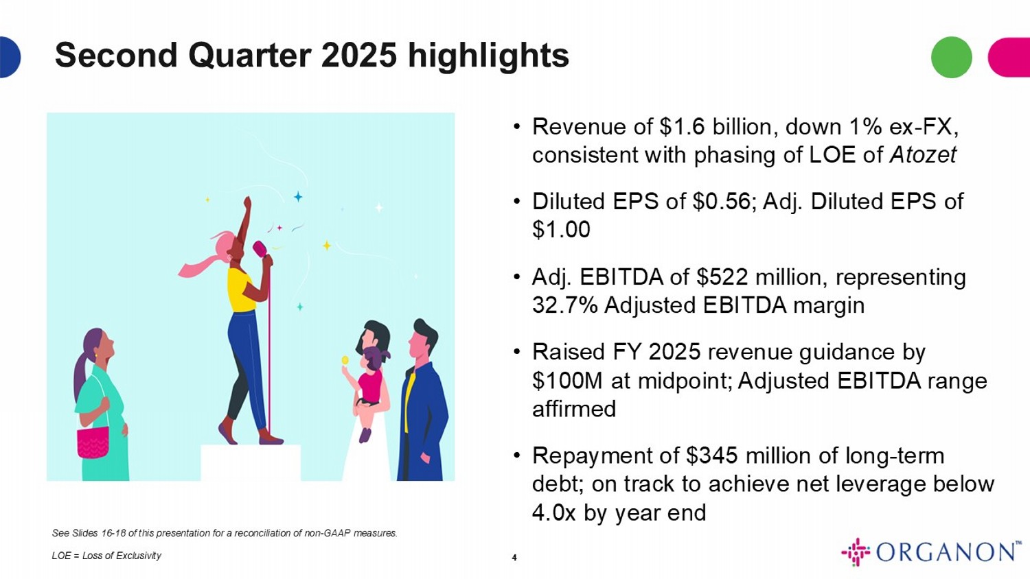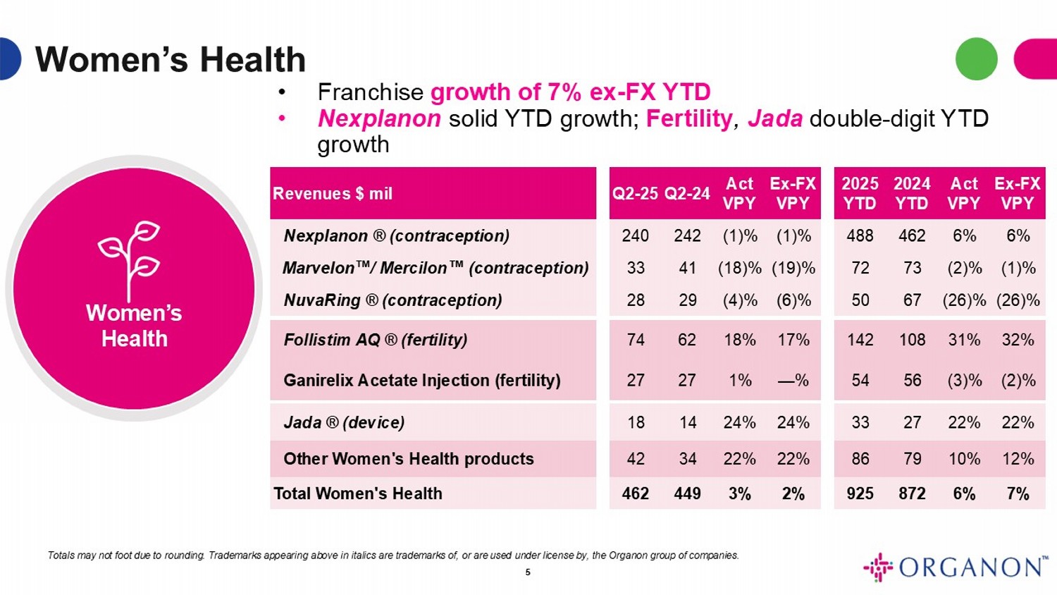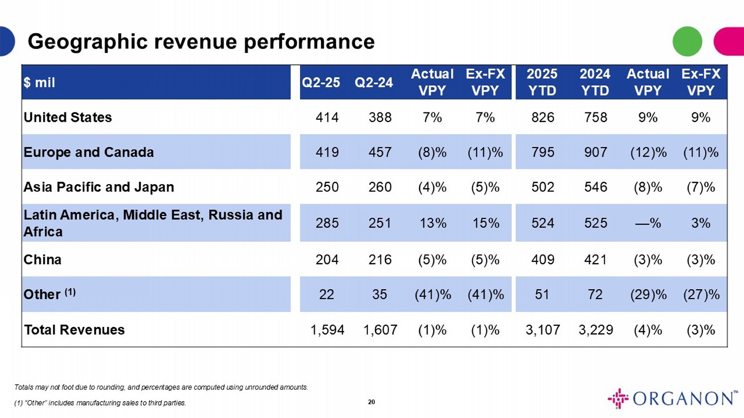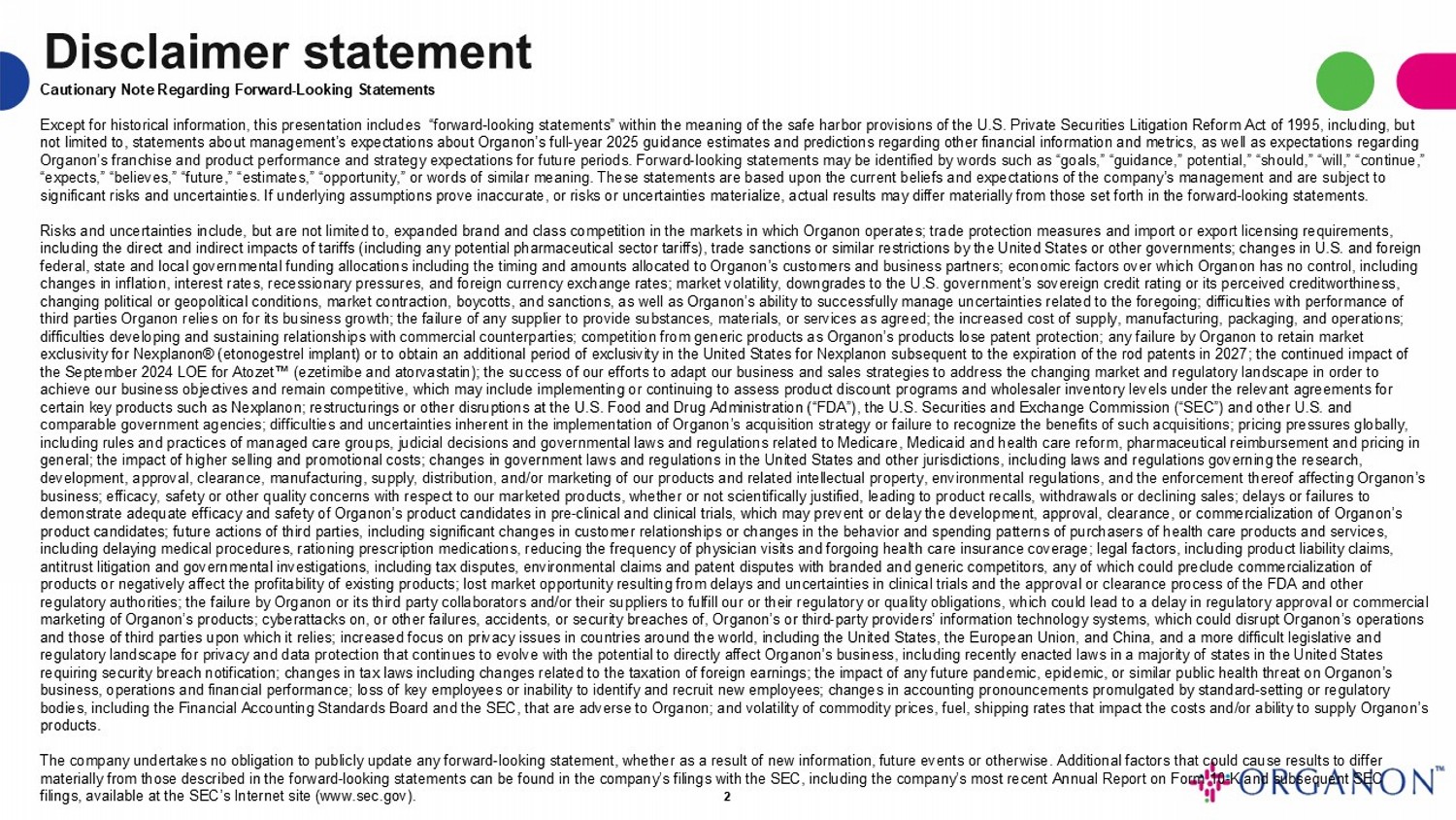 Except for historical information, this press release includes “forward-looking statements” within the meaning of the safe harbor provisions of the U.S. Private Securities Litigation Reform Act of 1995, including, but not limited to, statements about management’s expectations about Organon’s full-year 2025 guidance estimates and predictions regarding other financial information and metrics, as well as expectations regarding Organon’s franchise and product performance and strategy expectations for future periods. Forward-looking statements may be identified by words such as “goals,” “guidance,” potential,” “should,” “will,” “continue,” “expects,” “believes,” “future,” “estimates,” “opportunity,” or words of similar meaning. These statements are based upon the current beliefs and expectations of the company’s management and are subject to significant risks and uncertainties. If underlying assumptions prove inaccurate, or risks or uncertainties materialize, actual results may differ materially from those set forth in the forward-looking statements. Risks and uncertainties include, but are not limited to, expanded brand and class competition in the markets in which Organon operates; trade protection measures and import or export licensing requirements, including the direct and indirect impacts of tariffs (including any potential pharmaceutical sector tariffs), trade sanctions or similar restrictions by the United States or other governments; changes in U.S. and foreign federal, state and local governmental funding allocations including the timing and amounts allocated to Organon’s customers and business partners; economic factors over which Organon has no control, including changes in inflation, interest rates, recessionary pressures, and foreign currency exchange rates; market volatility, downgrades to the U.S. government’s sovereign credit rating or its perceived creditworthiness, changing political or geopolitical conditions, market contraction, boycotts, and sanctions, as well as Organon’s ability to successfully manage uncertainties related to the foregoing; difficulties with performance of third parties Organon relies on for its business growth; the failure of any supplier to provide substances, materials, or services as agreed; the increased cost of supply, manufacturing, packaging, and operations; difficulties developing and sustaining relationships with commercial counterparties; competition from generic products as Organon’s products lose patent protection; any failure by Organon to retain market exclusivity for Nexplanon® (etonogestrel implant) or to obtain an additional period of exclusivity in the United States for Nexplanon subsequent to the expiration of the rod patents in 2027; the continued impact of the September 2024 LOE for Atozet™ (ezetimibe and atorvastatin); the success of our efforts to adapt our business and sales strategies to address the changing market and regulatory landscape in order to achieve our business objectives and remain competitive, which may include implementing or continuing to assess product discount programs and wholesaler inventory levels under the relevant agreements for certain key products such as Nexplanon; restructurings or other disruptions at the U.S. Food and Drug Administration (“FDA”), the U.S. Securities and Exchange Commission (“SEC”) and other U.S. and comparable government agencies; difficulties and uncertainties inherent in the implementation of Organon’s acquisition strategy or failure to recognize the benefits of such acquisitions; pricing pressures globally, including rules and practices of managed care groups, judicial decisions and governmental laws and regulations related to Medicare, Medicaid and health care reform, pharmaceutical reimbursement and pricing in general; the impact of higher selling and promotional costs; changes in government laws and regulations in the United States and other jurisdictions, including laws and regulations governing the research, development, approval, clearance, manufacturing, supply, distribution, and/or marketing of our products and related intellectual property, environmental regulations, and the enforcement thereof affecting Organon’s business; efficacy, safety or other quality concerns with respect to our marketed products, whether or not scientifically justified, leading to product recalls, withdrawals or declining sales; delays or failures to demonstrate adequate efficacy and safety of Organon’s product candidates in pre-clinical and clinical trials, which may prevent or delay the development, approval, clearance, or commercialization of Organon’s product candidates; future actions of third parties, including significant changes in customer relationships or changes in the behavior and spending patterns of purchasers of health care products and services, including delaying medical procedures, rationing prescription medications, reducing the frequency of physician visits and forgoing health care insurance coverage; legal factors, including product liability claims, antitrust litigation and governmental investigations, including tax disputes, environmental claims and patent disputes with branded and generic competitors, any of which could preclude commercialization of products or negatively affect the profitability of existing products; lost market opportunity resulting from delays and uncertainties in clinical trials and the approval or clearance process of the FDA and other regulatory authorities; the failure by Organon or its third party collaborators and/or their suppliers to fulfill our or their regulatory or quality obligations, which could lead to a delay in regulatory approval or commercial marketing of Organon’s products; cyberattacks on, or other failures, accidents, or security breaches of, Organon’s or third-party providers’ information technology systems, which could disrupt Organon’s operat