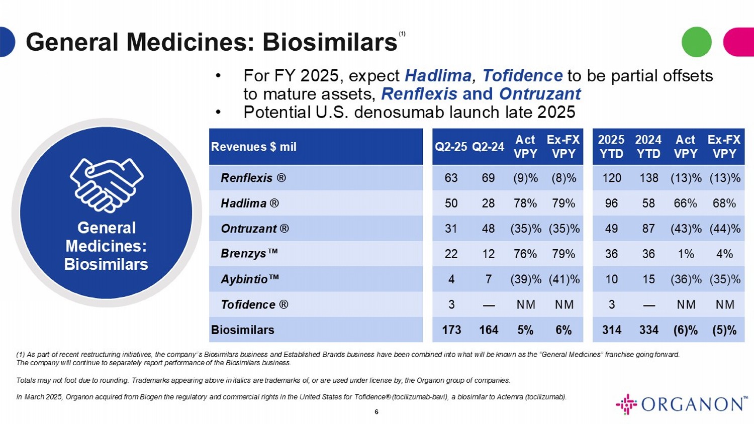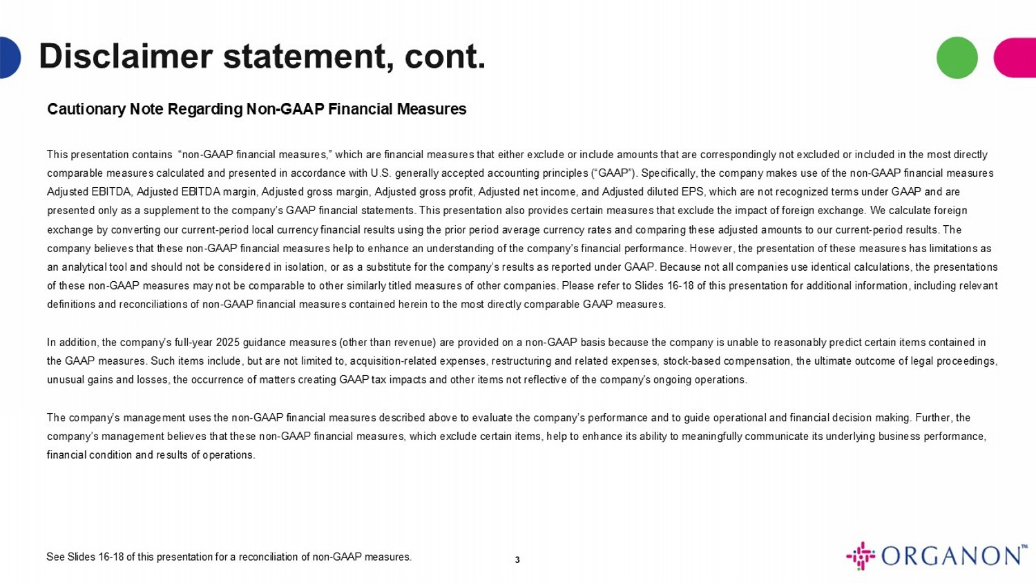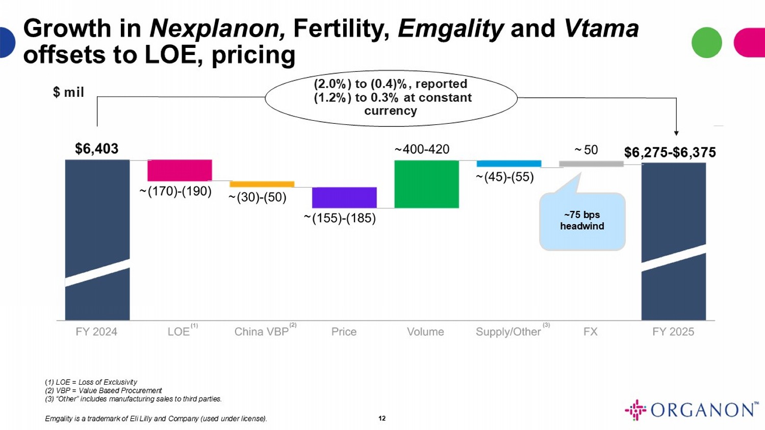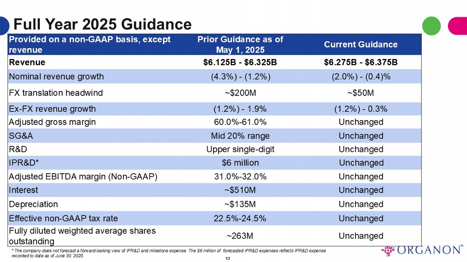 Except for historical information, this press release includes “forward-looking statements” within the meaning of the safe harbor provisions of the U.S. Private Securities Litigation Reform Act of 1995, including, but not limited to, statements about management’s expectations about Organon’s full-year 2025 guidance estimates and predictions regarding other financial information and metrics, as well as expectations regarding Organon’s franchise and product performance and strategy expectations for future periods. Forward-looking statements may be identified by words such as “goals,” “guidance,” potential,” “should,” “will,” “continue,” “expects,” “believes,” “future,” “estimates,” “opportunity,” or words of similar meaning. These statements are based upon the current beliefs and expectations of the company’s management and are subject to significant risks and uncertainties. If underlying assumptions prove inaccurate, or risks or uncertainties materialize, actual results may differ materially from those set forth in the forward-looking statements. Risks and uncertainties include, but are not limited to, expanded brand and class competition in the markets in which Organon operates; trade protection measures and import or export licensing requirements, including the direct and indirect impacts of tariffs (including any potential pharmaceutical sector tariffs), trade sanctions or similar restrictions by the United States or other governments; changes in U.S. and foreign federal, state and local governmental funding allocations including the timing and amounts allocated to Organon’s customers and business partners; economic factors over which Organon has no control, including changes in inflation, interest rates, recessionary pressures, and foreign currency exchange rates; market volatility, downgrades to the U.S. government’s sovereign credit rating or its perceived creditworthiness, changing political or geopolitical conditions, market contraction, boycotts, and sanctions, as well as Organon’s ability to successfully manage uncertainties related to the foregoing; difficulties with performance of third parties Organon relies on for its business growth; the failure of any supplier to provide substances, materials, or services as agreed; the increased cost of supply, manufacturing, packaging, and operations; difficulties developing and sustaining relationships with commercial counterparties; competition from generic products as Organon’s products lose patent protection; any failure by Organon to retain market exclusivity for Nexplanon® (etonogestrel implant) or to obtain an additional period of exclusivity in the United States for Nexplanon subsequent to the expiration of the rod patents in 2027; the continued impact of the September 2024 LOE for Atozet™ (ezetimibe and atorvastatin); the success of our efforts to adapt our business and sales strategies to address the changing market and regulatory landscape in order to achieve our business objectives and remain competitive, which may include implementing or continuing to assess product discount programs and wholesaler inventory levels under the relevant agreements for certain key products such as Nexplanon; restructurings or other disruptions at the U.S. Food and Drug Administration (“FDA”), the U.S. Securities and Exchange Commission (“SEC”) and other U.S. and comparable government agencies; difficulties and uncertainties inherent in the implementation of Organon’s acquisition strategy or failure to recognize the benefits of such acquisitions; pricing pressures globally, including rules and practices of managed care groups, judicial decisions and governmental laws and regulations related to Medicare, Medicaid and health care reform, pharmaceutical reimbursement and pricing in general; the impact of higher selling and promotional costs; changes in government laws and regulations in the United States and other jurisdictions, including laws and regulations governing the research, development, approval, clearance, manufacturing, supply, distribution, and/or marketing of our products and related intellectual property, environmental regulations, and the enforcement thereof affecting Organon’s business; efficacy, safety or other quality concerns with respect to our marketed products, whether or not scientifically justified, leading to product recalls, withdrawals or declining sales; delays or failures to demonstrate adequate efficacy and safety of Organon’s product candidates in pre-clinical and clinical trials, which may prevent or delay the development, approval, clearance, or commercialization of Organon’s product candidates; future actions of third parties, including significant changes in customer relationships or changes in the behavior and spending patterns of purchasers of health care products and services, including delaying medical procedures, rationing prescription medications, reducing the frequency of physician visits and forgoing health care insurance coverage; legal factors, including product liability claims, antitrust litigation and governmental investigations, including tax disputes, environmental claims and patent disputes with branded and generic competitors, any of which could preclude commercialization of products or negatively affect the profitability of existing products; lost market opportunity resulting from delays and uncertainties in clinical trials and the approval or clearance process of the FDA and other regulatory authorities; the failure by Organon or its third party collaborators and/or their suppliers to fulfill our or their regulatory or quality obligations, which could lead to a delay in regulatory approval or commercial marketing of Organon’s products; cyberattacks on, or other failures, accidents, or security breaches of, Organon’s or third-party providers’ information technology systems, which could disrupt Organon’s operat