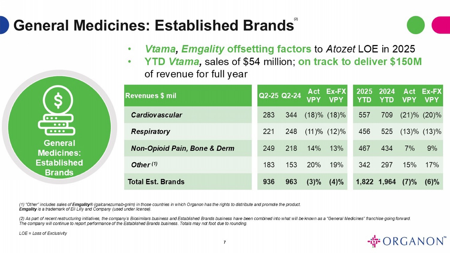 エスタブリッシュト・ブランドの売上高は報告ベースで3%減、為替変動の影響を除くと4%減となった。Emgality®(1)(galcanezumab-gnlm)およびVtama®(2)(tapinarof)の売上寄与は、欧州の主要市場におけるAtozet™(エゼチミブおよびアトルバスタチン)の独占的販売権(LOE)喪失の影響、および特に中国と日本におけるSingulair®(モンテルカスト・ナトリウム)の売上減少の影響を一部相殺した。