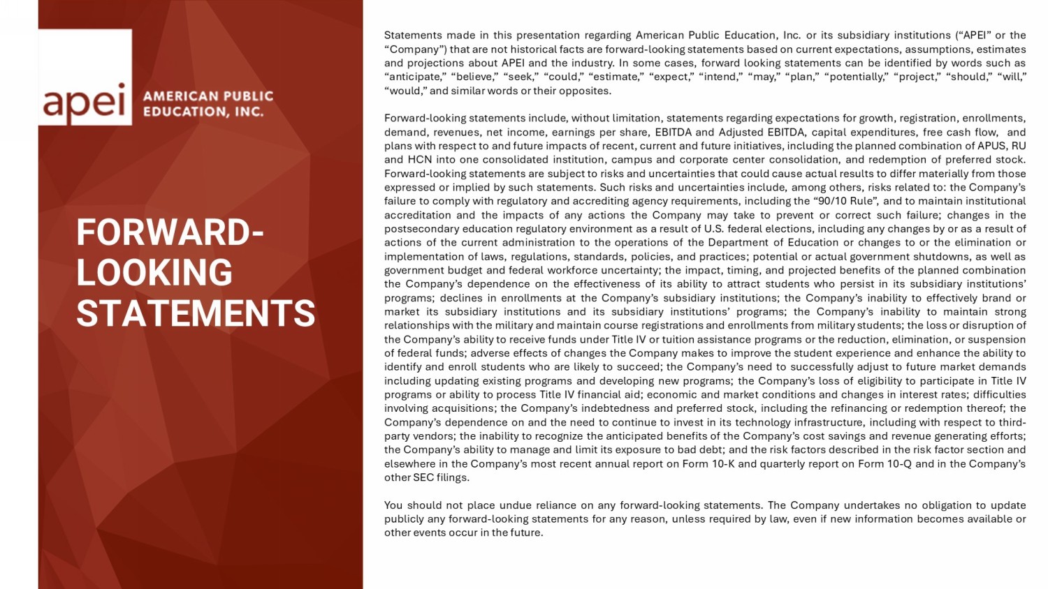 アメリカン・パブリック・エデュケーション社(Nasdaq: APEI)は、その教育機関であるアメリカン・パブリック・ユニバーシティ・システム、ラスムッセン大学、ホンドロス・カレッジ・オブ・ナーシングを通して、人生を変え、キャリアを伸ばし、地域社会を改善する教育を提供している。