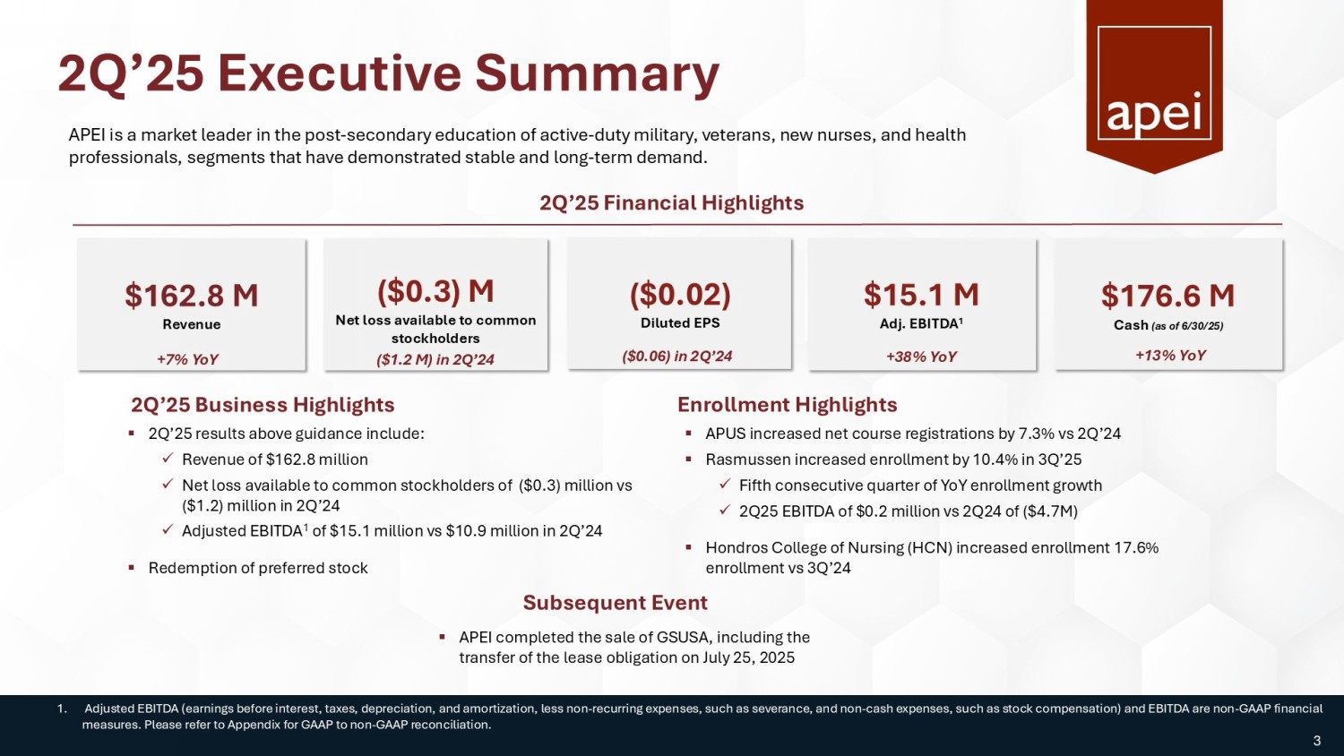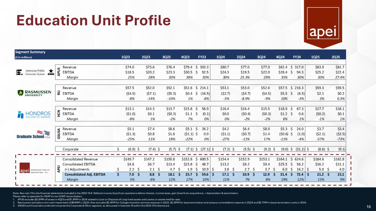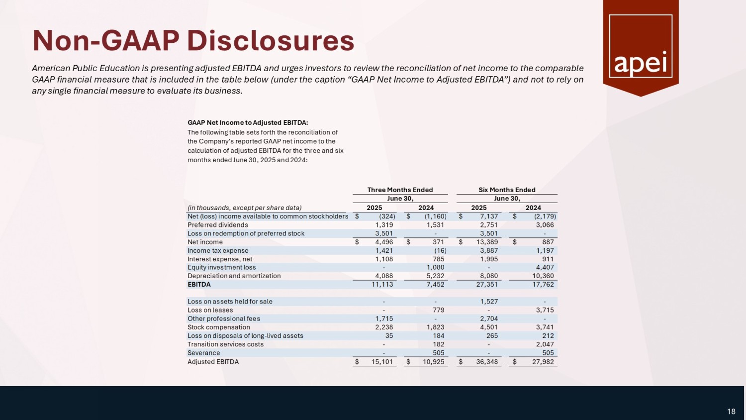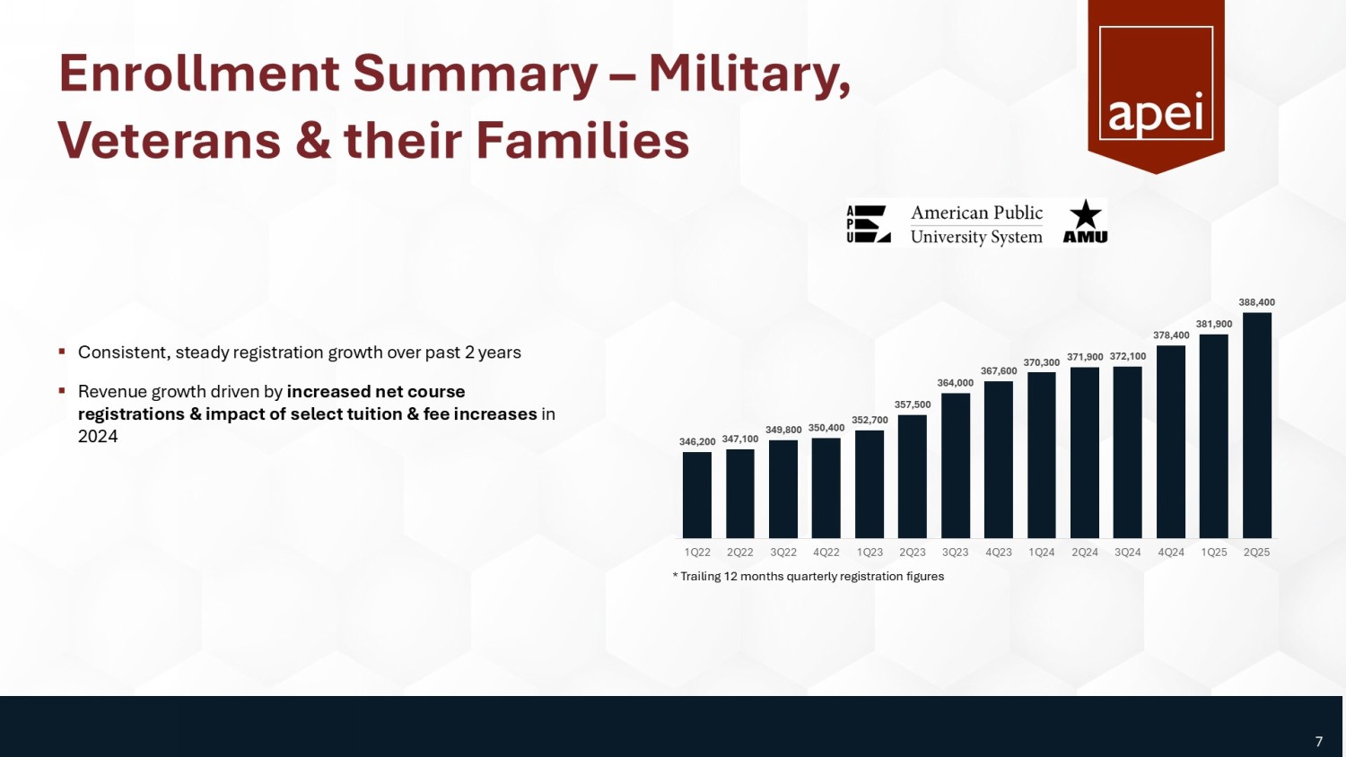 ウェストバージニア州チャールズタウン発-2025年8月6日-3つの子会社を通じて10万5,000人以上の学生にオンラインおよびキャンパスベースの中等後教育を提供する教育企業のポートフォリオであるアメリカン・パブリック・エデュケーション社(Nasdaq: APEI)は、2025年6月30日に終了した第2四半期の未監査の財務および経営成績を発表した。