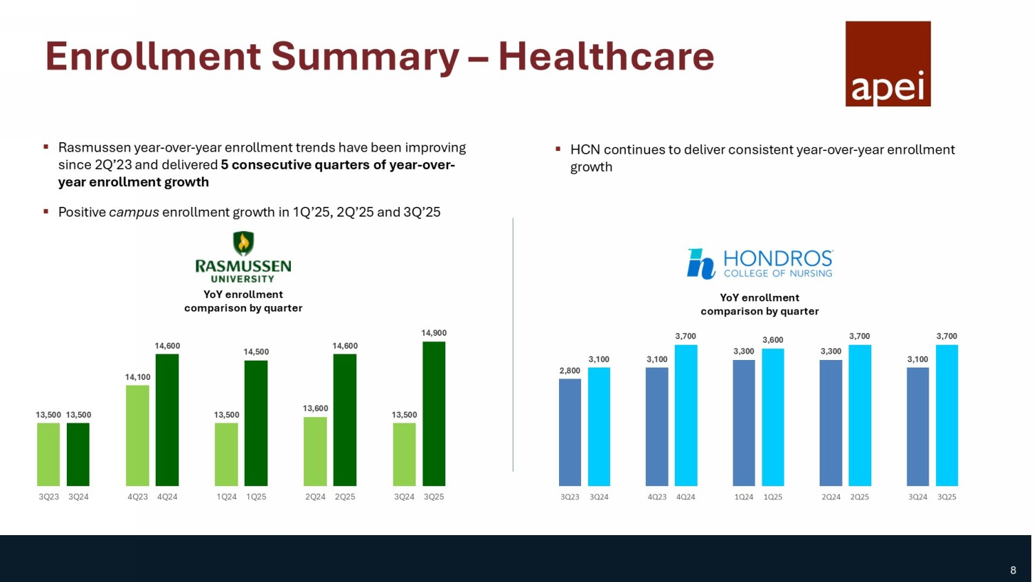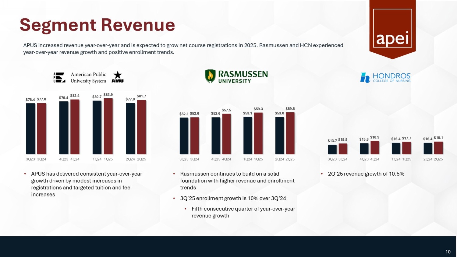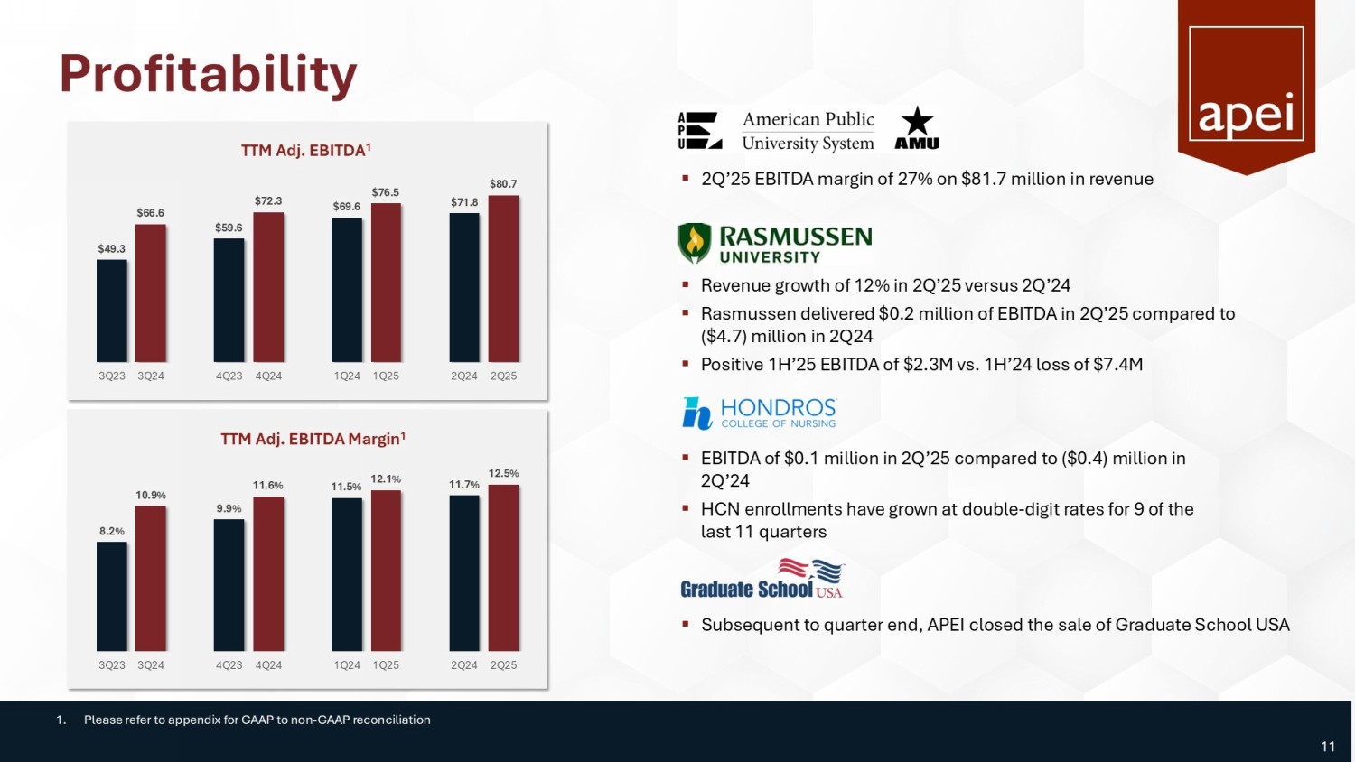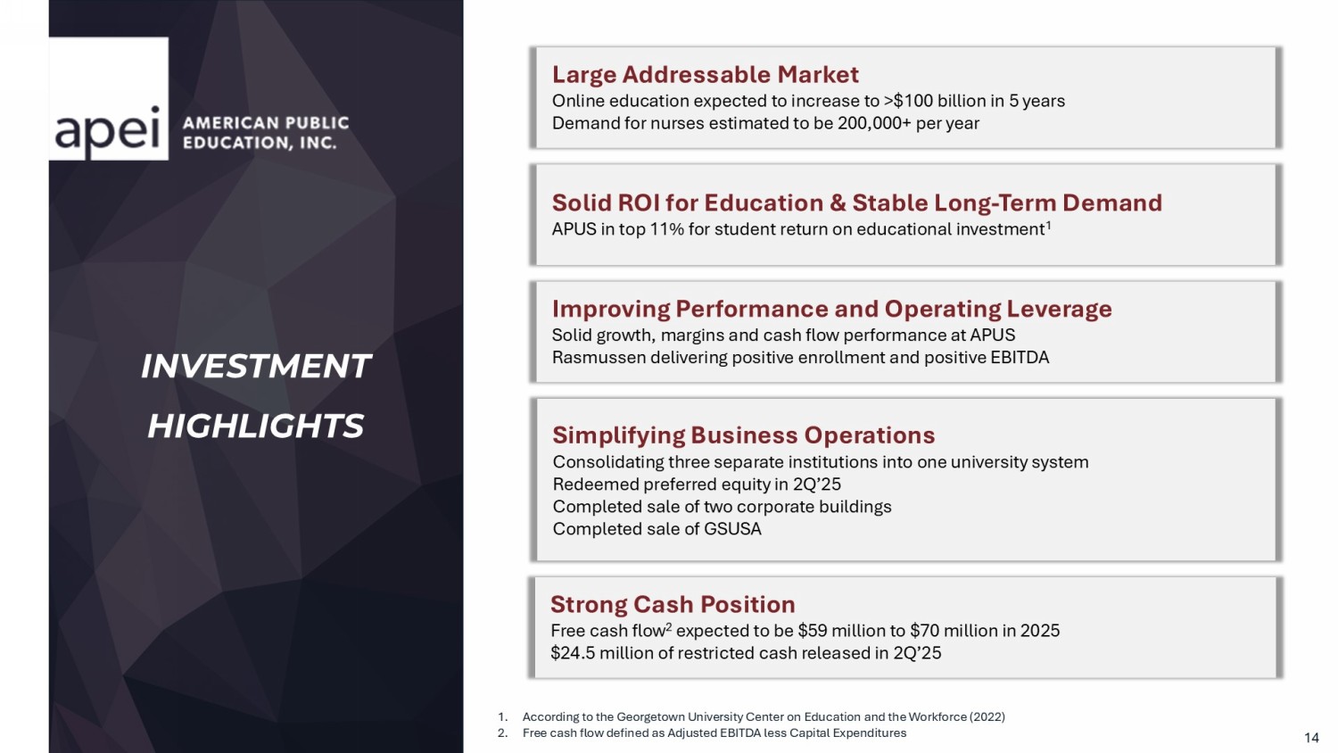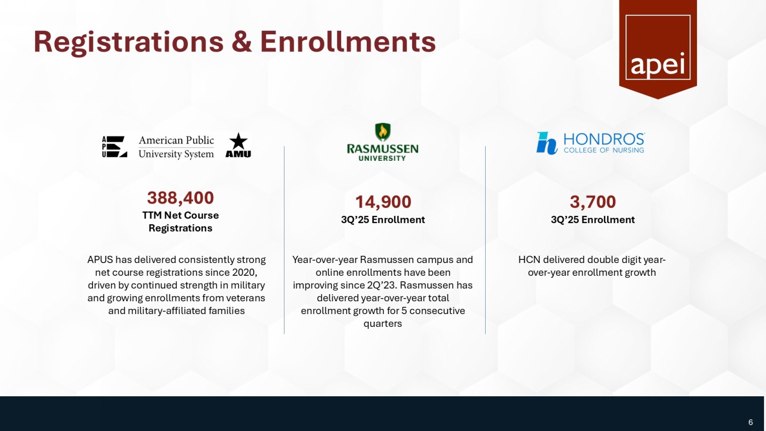 ウェストバージニア州チャールズタウン発-2025年8月6日-3つの子会社を通じて10万5,000人以上の学生にオンラインおよびキャンパスベースの中等後教育を提供する教育企業のポートフォリオであるアメリカン・パブリック・エデュケーション社(Nasdaq: APEI)は、2025年6月30日に終了した第2四半期の未監査の財務および経営成績を発表した。